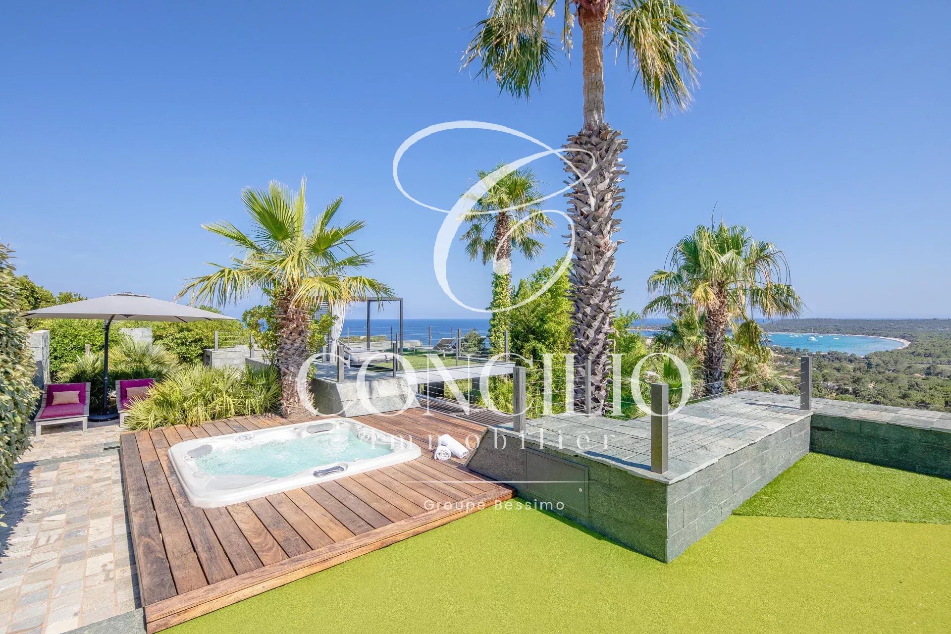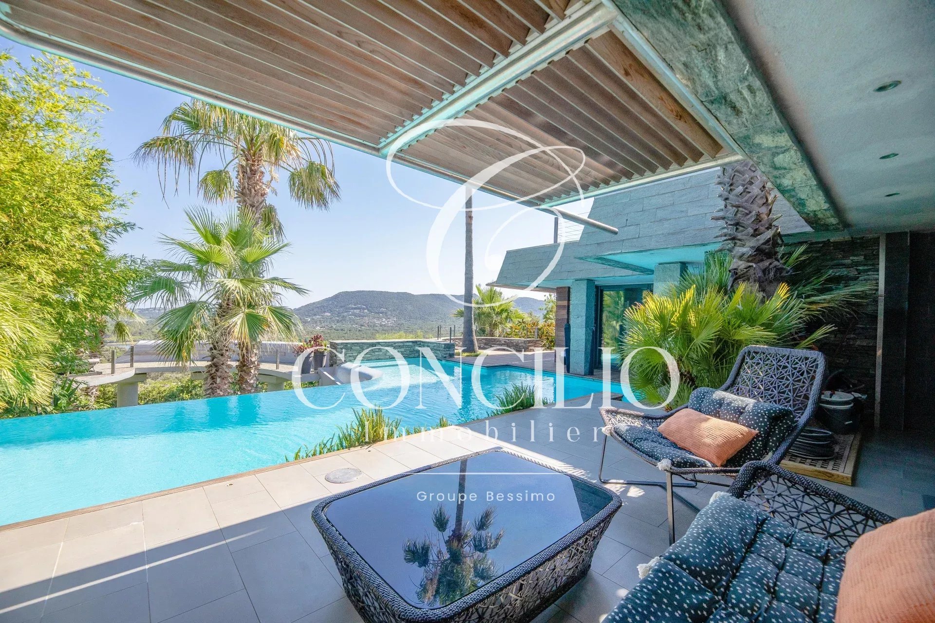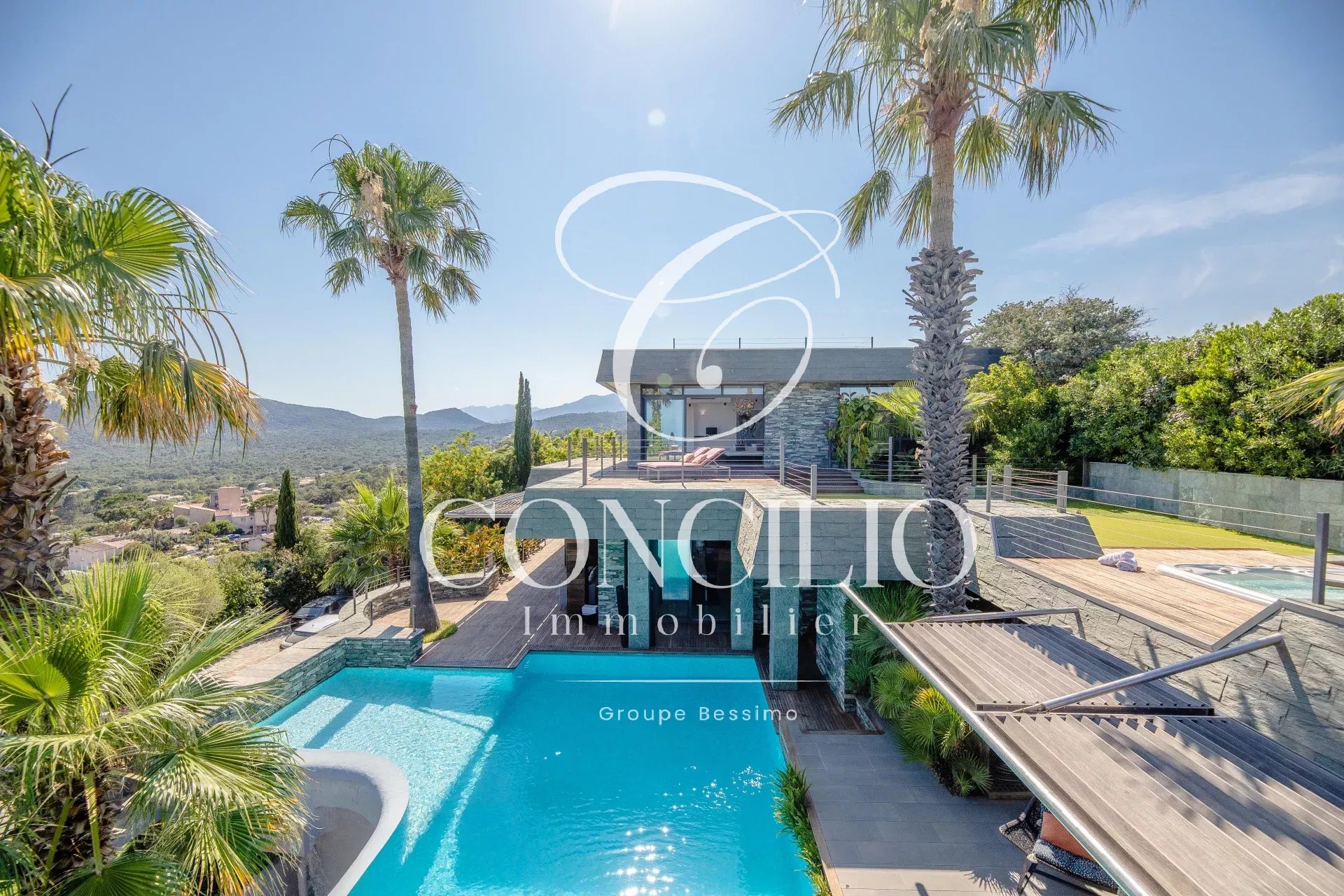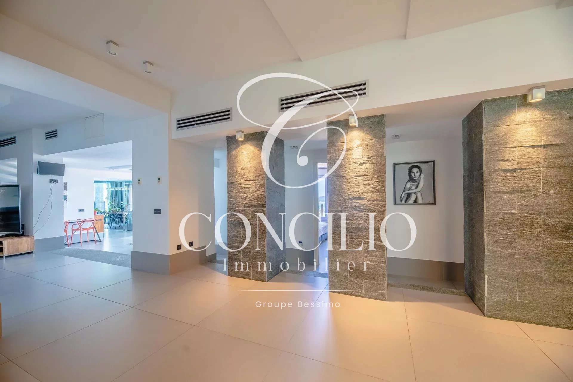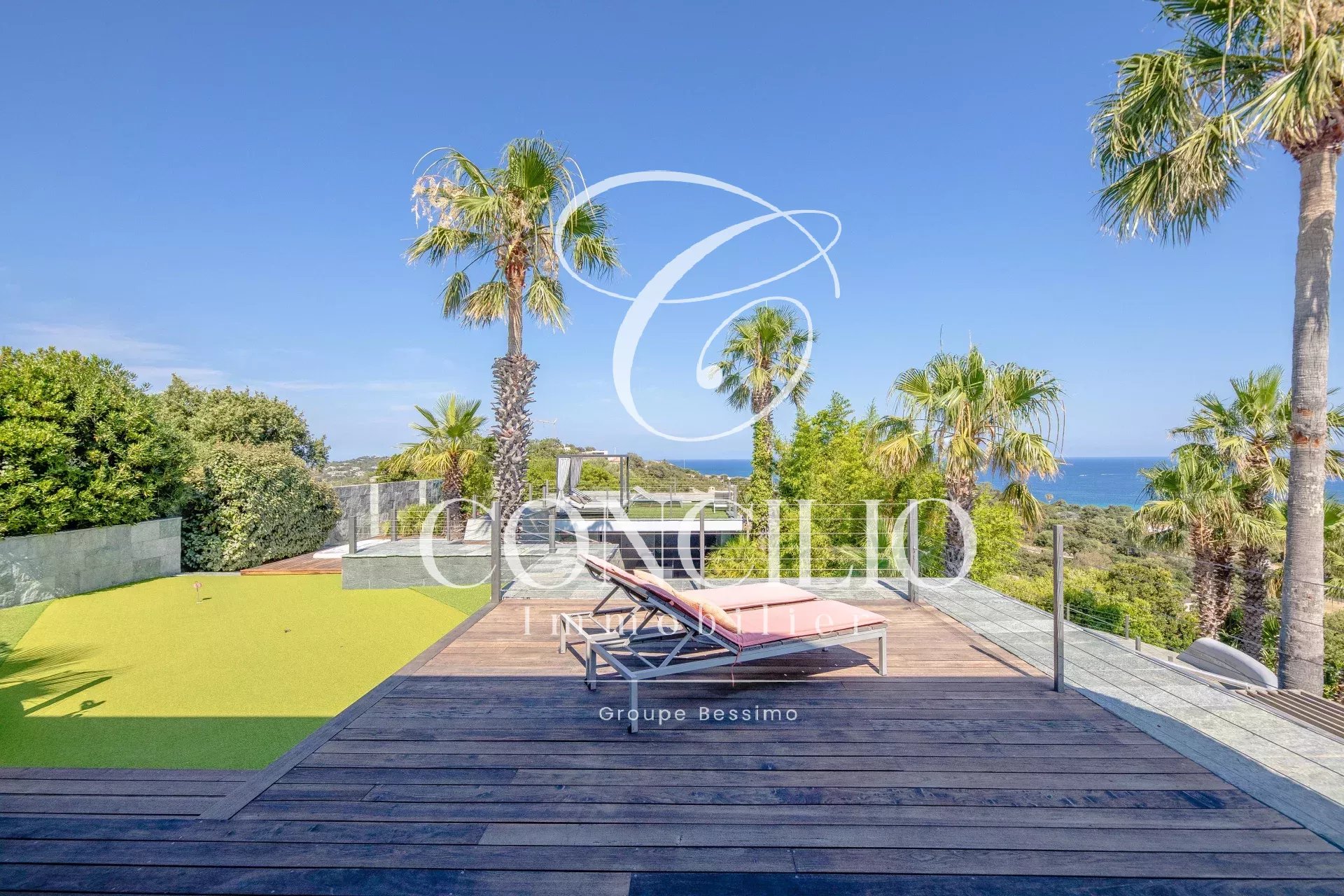 Située dans un environnement privilégié, cette villa contemporaine d’exception, édifiée sur trois niveaux, bénéficie d’une vue mer panoramique et d’un emplacement recherché à proximité immédiate de la mer. D’une surface habitable d’environ 370 m², elle se compose de 9 pièces dont 6 chambres, et est implantée sur un terrain de 1 939 m². La propriété offre des prestations haut de gamme, comprenant une piscine chauffée à débordement, un spa, un solarium ainsi qu’un putting green privé. Les espaces intérieurs se distinguent par leurs volumes généreux et lumineux, avec des équipements de qualité : fenêtres coulissantes en aluminium, double vitrage, climatisation, ventilation double flux et installations modernes. Un pool house avec cuisine d’été équipée, une cave à vin et plusieurs espaces dédiés à la détente viennent compléter ce bien. La villa bénéficie d’un emplacement idéal, avec la mer, la plage et le port accessibles à pied, tout en restant proche du centre-ville et des commodités. Villa construite en 1988. Les informations sur les risques auxquels ce bien est exposé sont disponibles sur le site Géorisques.
