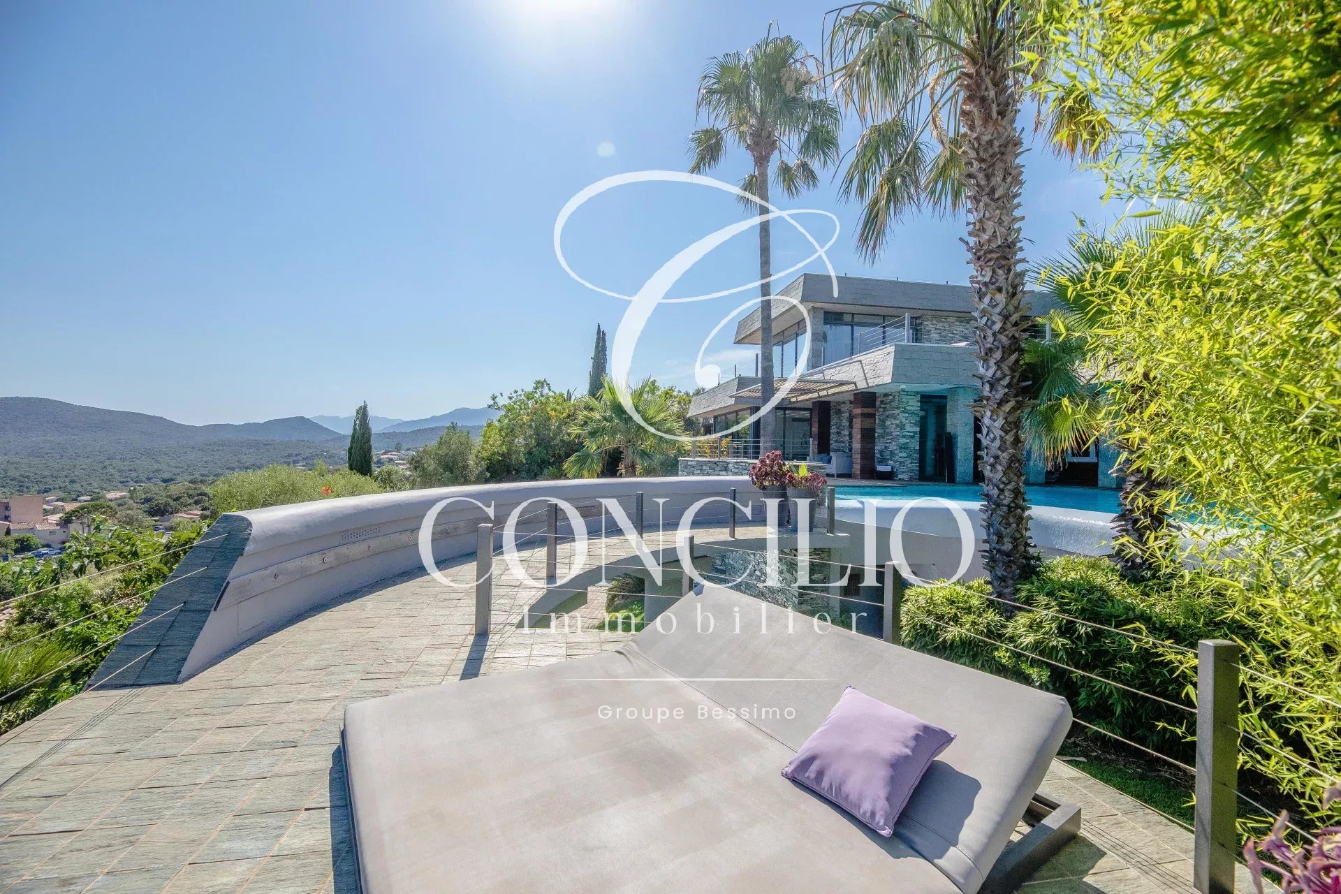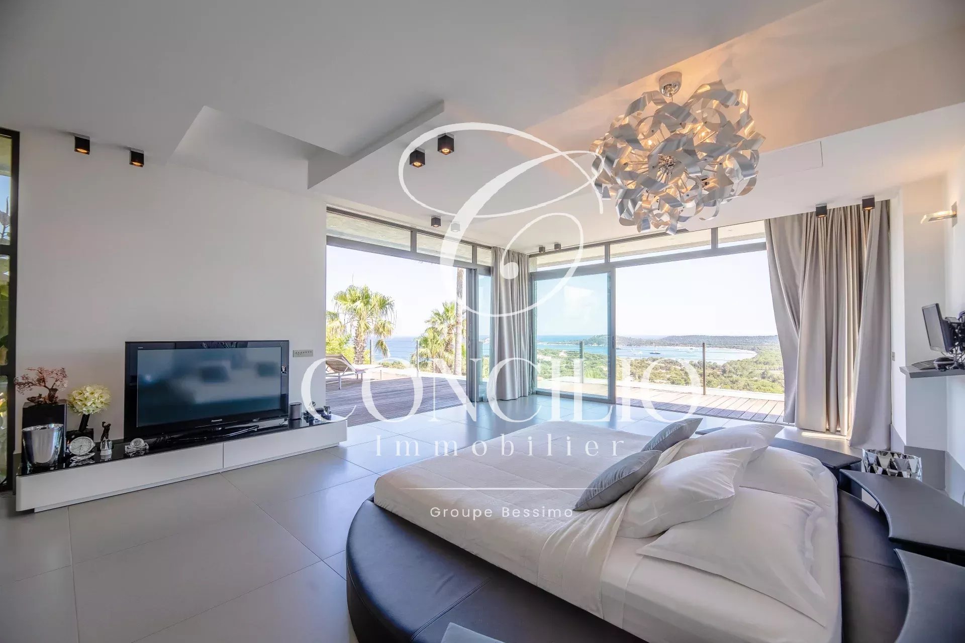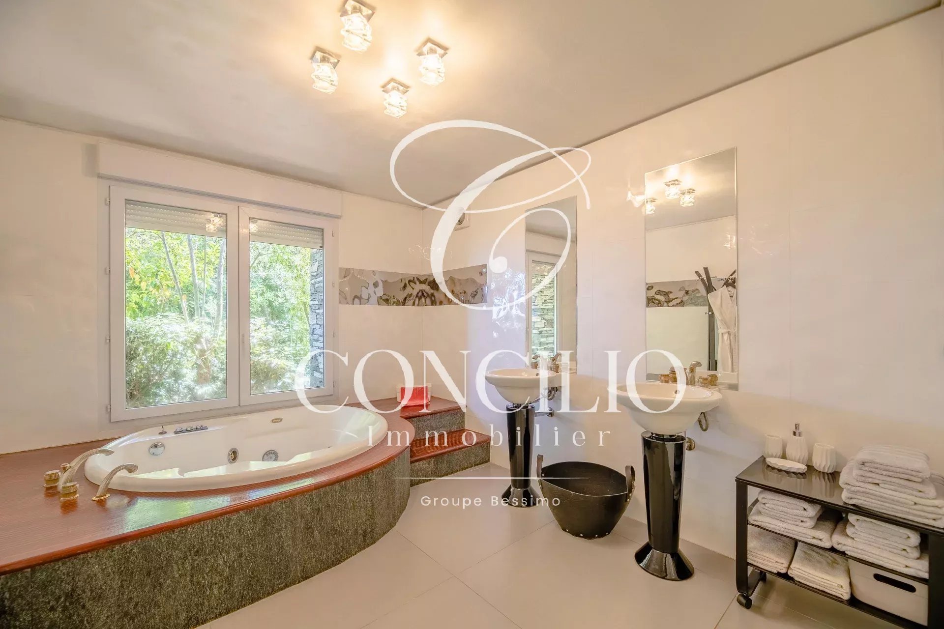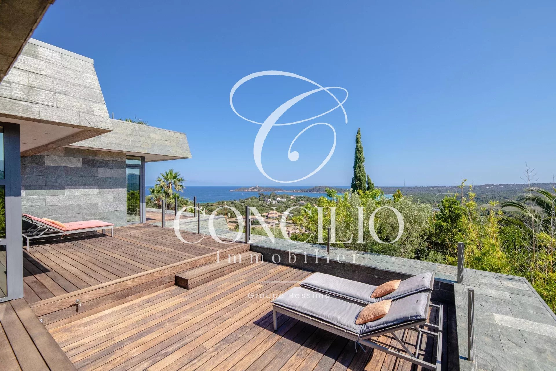 Située dans un environnement privilégié, cette villa contemporaine d’exception, édifiée sur trois niveaux, bénéficie d’une vue mer panoramique et d’un emplacement recherché à proximité immédiate de la mer. D’une surface habitable d’environ 370 m², elle se compose de 9 pièces dont 6 chambres, et est implantée sur un terrain de 1 939 m². La propriété offre des prestations haut de gamme, comprenant une piscine chauffée à débordement, un spa, un solarium ainsi qu’un putting green privé. Les espaces intérieurs se distinguent par leurs volumes généreux et lumineux, avec des équipements de qualité : fenêtres coulissantes en aluminium, double vitrage, climatisation, ventilation double flux et installations modernes. Un pool house avec cuisine d’été équipée, une cave à vin et plusieurs espaces dédiés à la détente viennent compléter ce bien. La villa bénéficie d’un emplacement idéal, avec la mer, la plage et le port accessibles à pied, tout en restant proche du centre-ville et des commodités. Villa construite en 1988. Les informations sur les risques auxquels ce bien est exposé sont disponibles sur le site Géorisques.