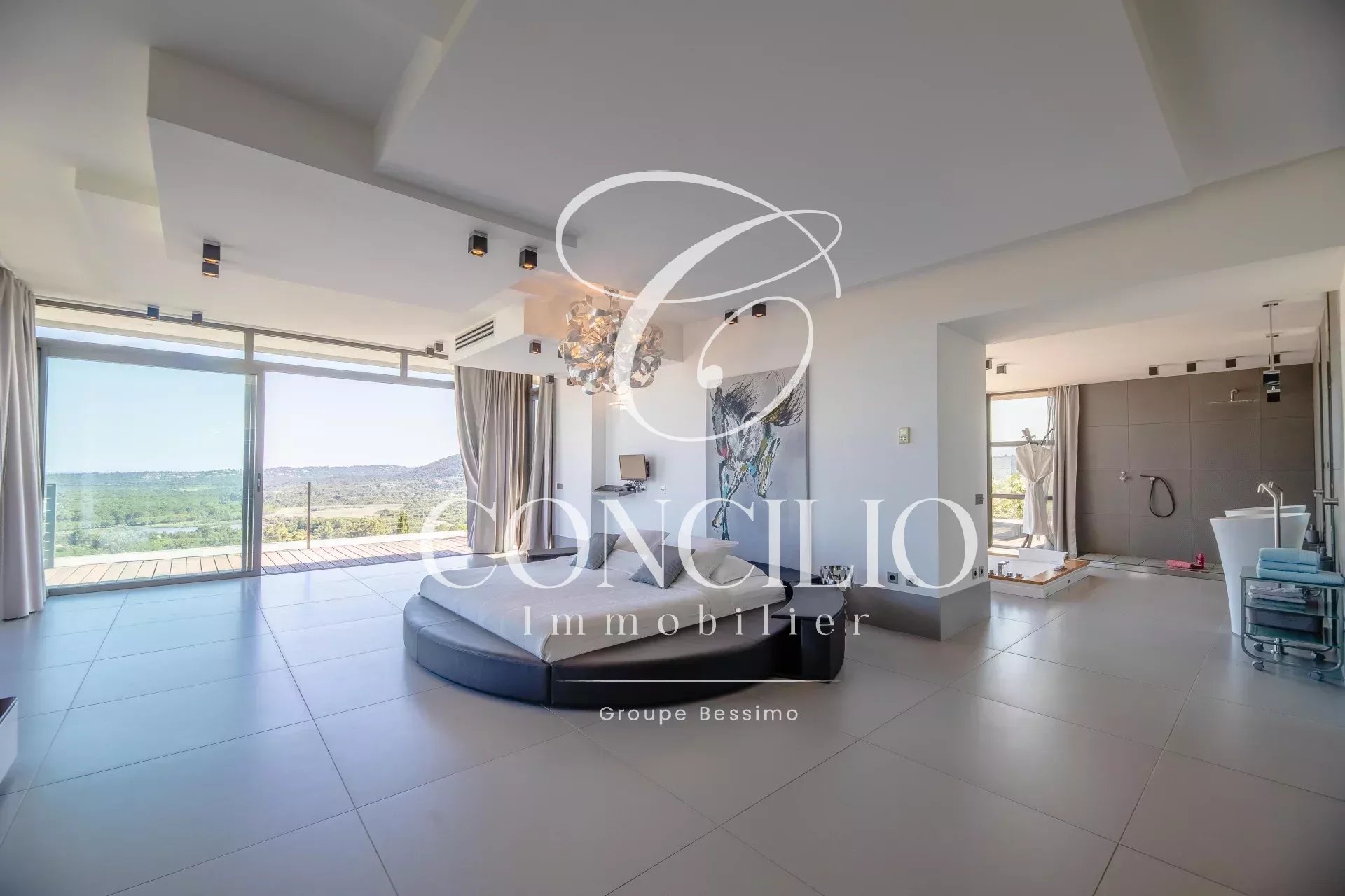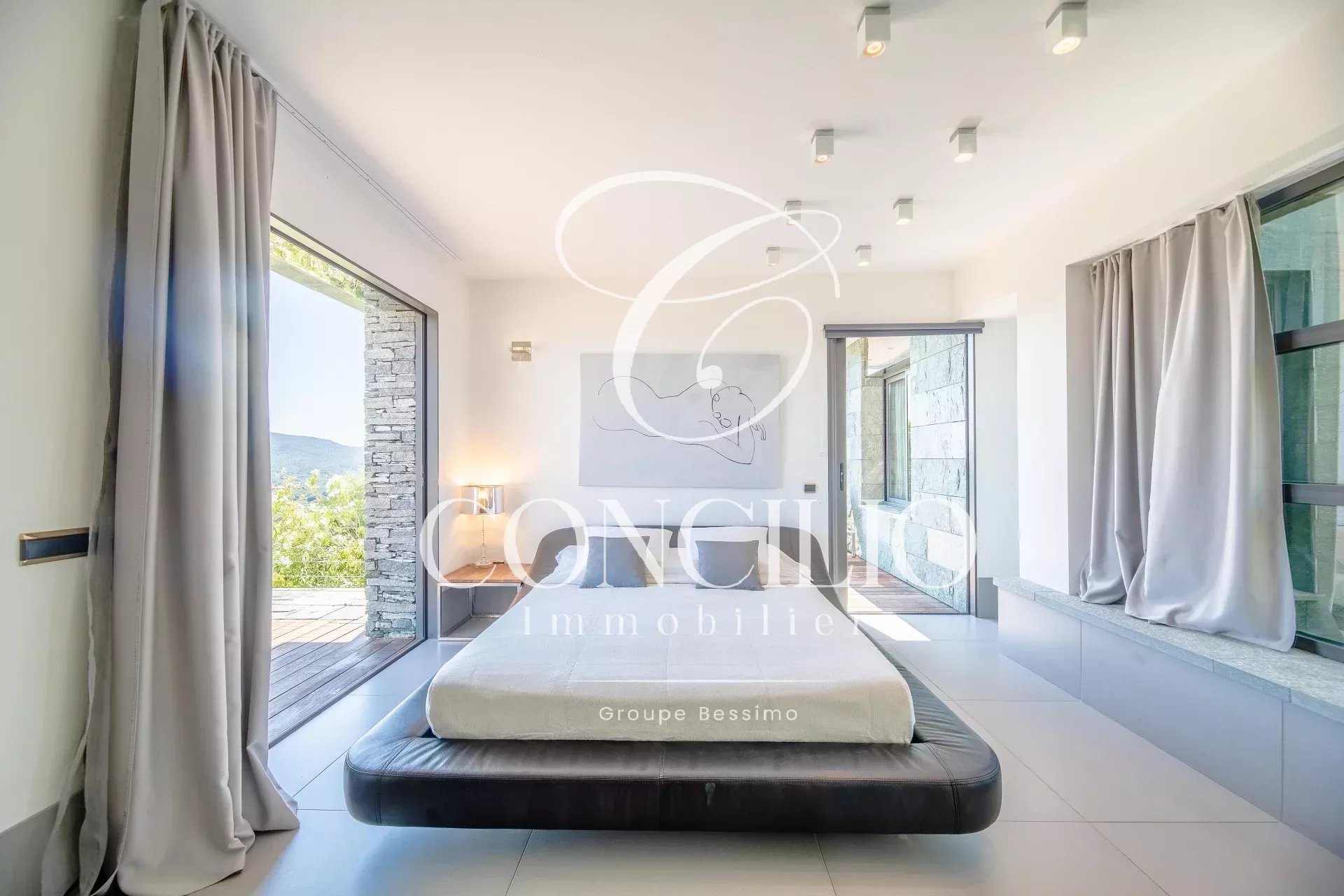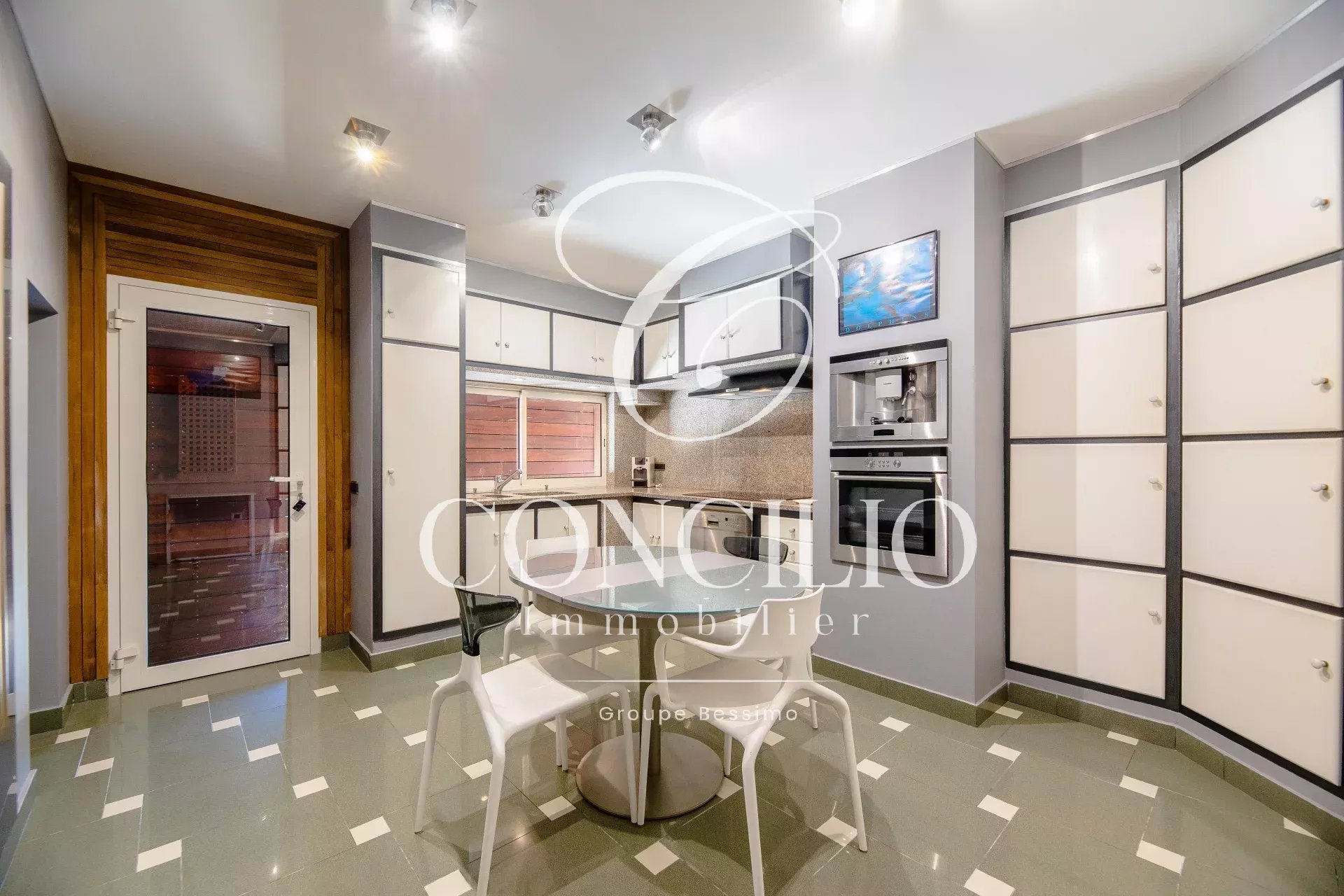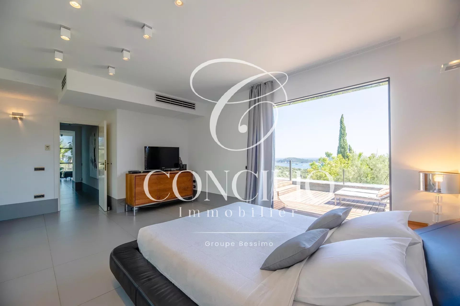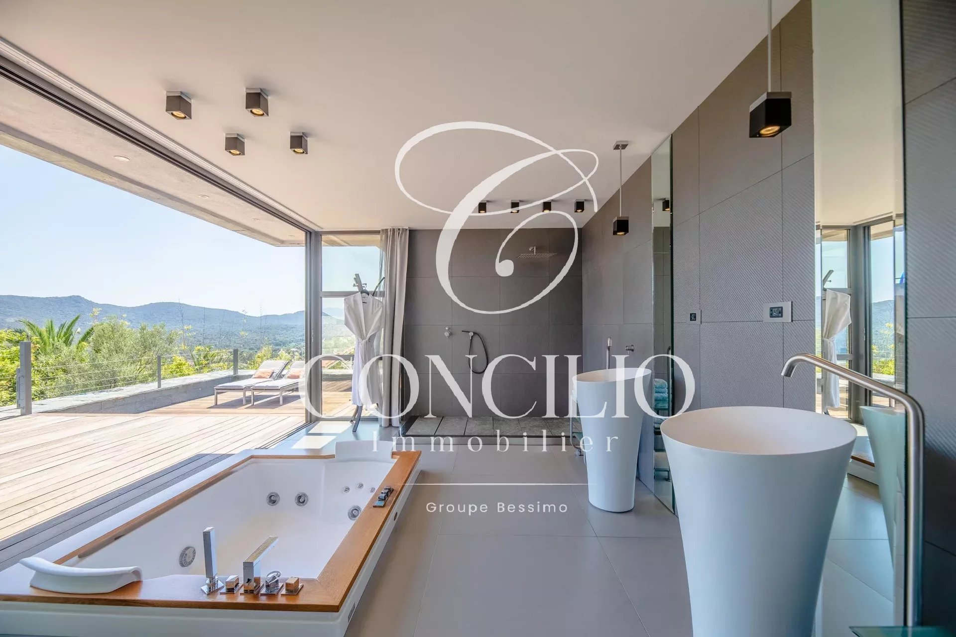 Située dans un environnement privilégié, cette villa contemporaine d’exception, édifiée sur trois niveaux, bénéficie d’une vue mer panoramique et d’un emplacement recherché à proximité immédiate de la mer. D’une surface habitable d’environ 370 m², elle se compose de 9 pièces dont 6 chambres, et est implantée sur un terrain de 1 939 m². La propriété offre des prestations haut de gamme, comprenant une piscine chauffée à débordement, un spa, un solarium ainsi qu’un putting green privé. Les espaces intérieurs se distinguent par leurs volumes généreux et lumineux, avec des équipements de qualité : fenêtres coulissantes en aluminium, double vitrage, climatisation, ventilation double flux et installations modernes. Un pool house avec cuisine d’été équipée, une cave à vin et plusieurs espaces dédiés à la détente viennent compléter ce bien. La villa bénéficie d’un emplacement idéal, avec la mer, la plage et le port accessibles à pied, tout en restant proche du centre-ville et des commodités. Villa construite en 1988. Les informations sur les risques auxquels ce bien est exposé sont disponibles sur le site Géorisques.