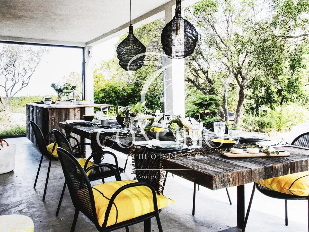 Au cœur du maquis corse, dans un environnement Natura 2000 préservé, superbe villa d’architecte de 200 m² offrant une intimité totale et une vue remarquable sur la mer et la montagne. Située à quelques minutes de la plage de Pinarellu, la propriété bénéficie d’un cadre rare, sans aucune possibilité de construction future en front de mer. La villa propose 5 suites, dont 4 en rez-de-chaussée avec terrasses privatives ouvrant sur la nature. À l’étage, la suite parentale et le salon prolongé d’une vaste terrasse panoramique offrent une vue exceptionnelle sur la baie. Une cuisine d’été de 30 m², véritable espace de vie, donne directement sur la piscine chauffée 14×4 m, parfaitement intégrée au maquis. Le terrain clos de 3 600 m², magnifiquement paysagé, bénéficie d’un forage et d’un puits. Une demeure rare, alliant architecture, élégance et nature sauvage — un bien d’exception pour amateurs de sérénité et d’exclusivité. Les informations sur les risques auxquels ce bien est exposé sont disponibles sur le site Géorisques.