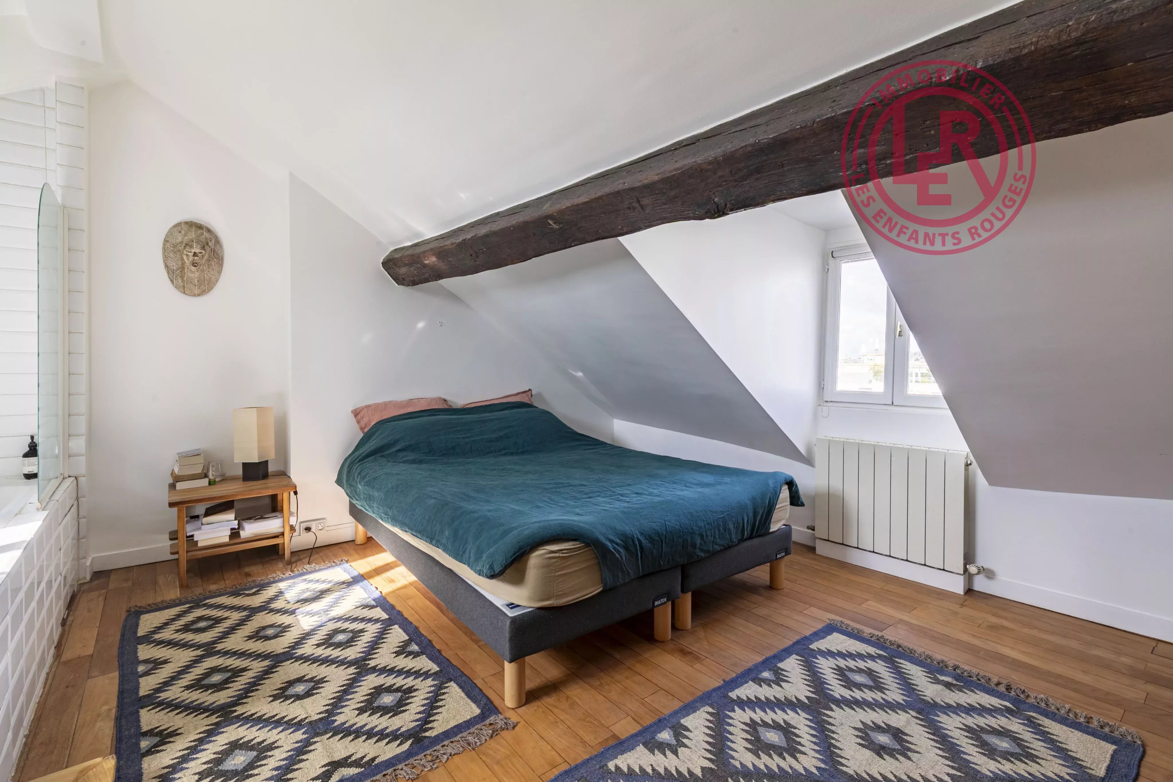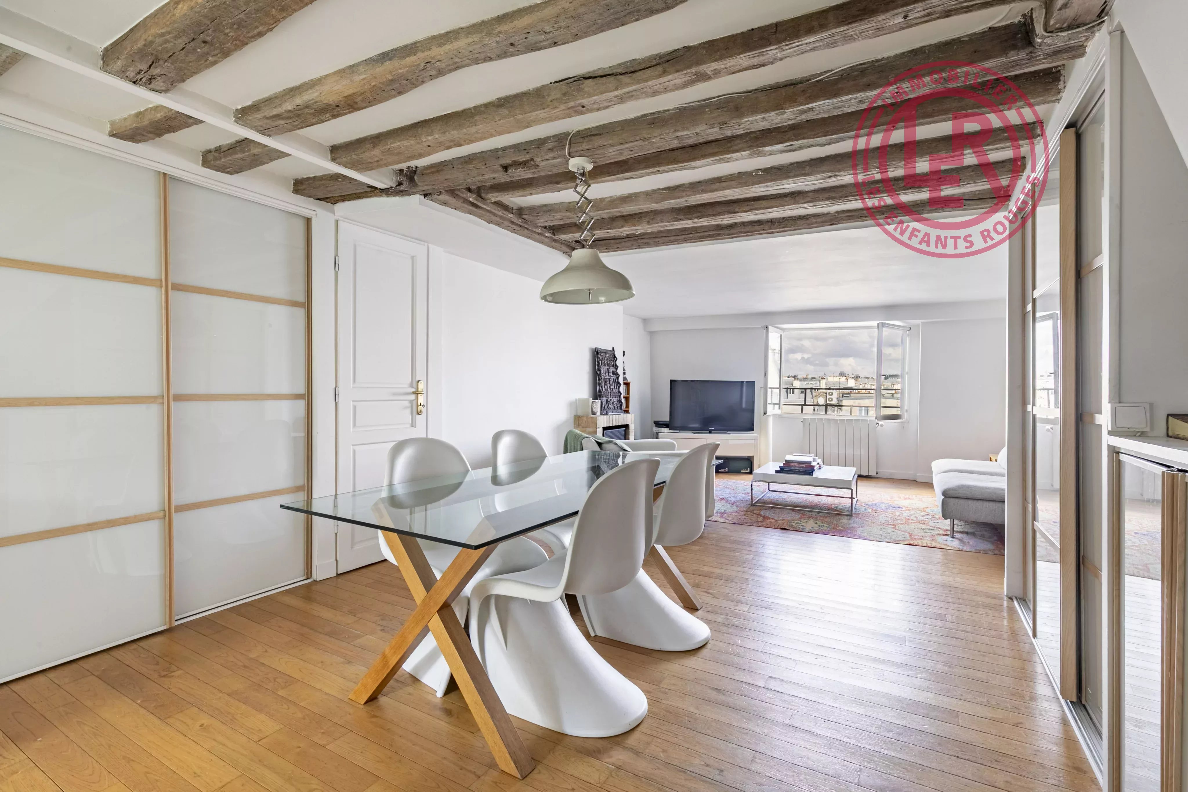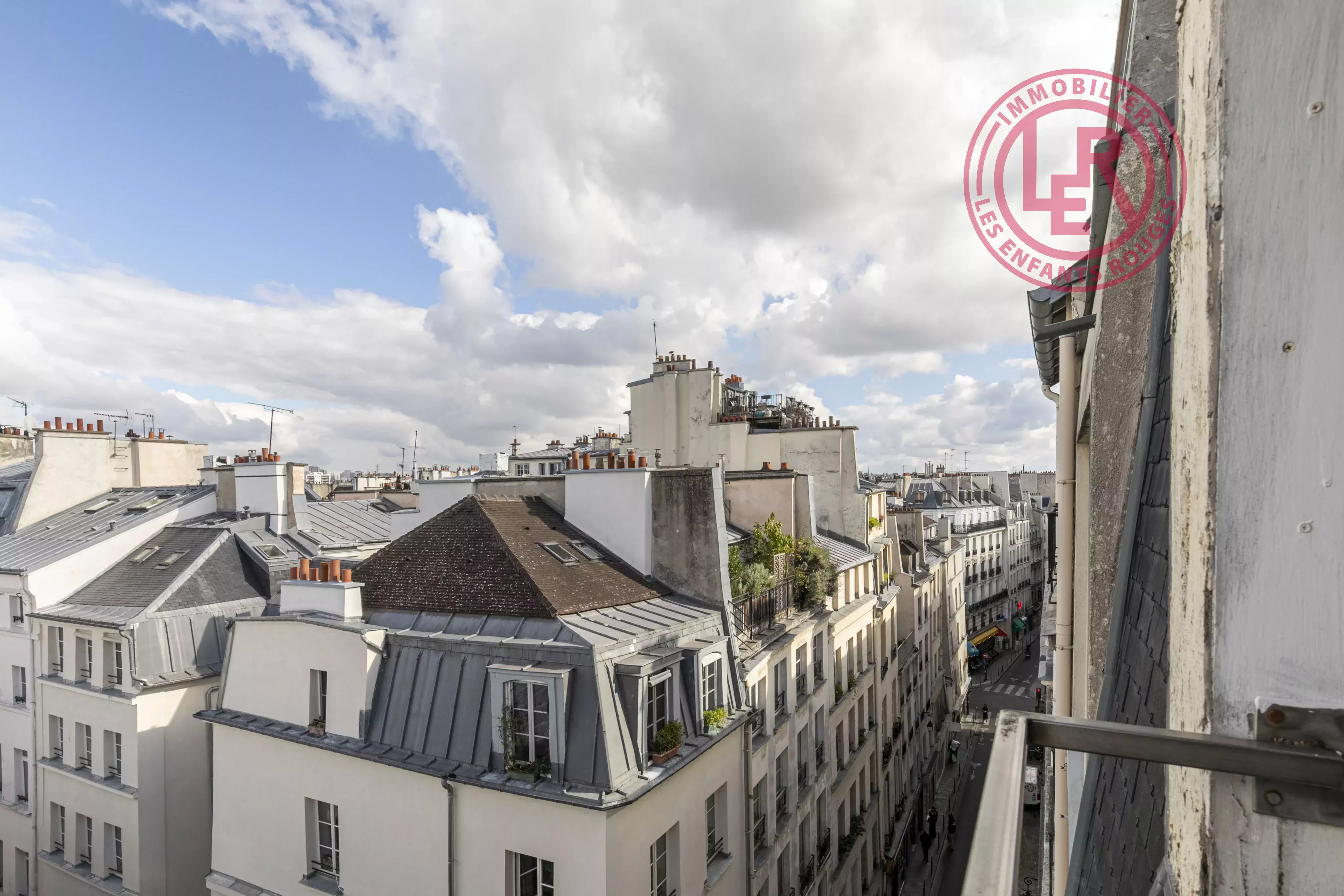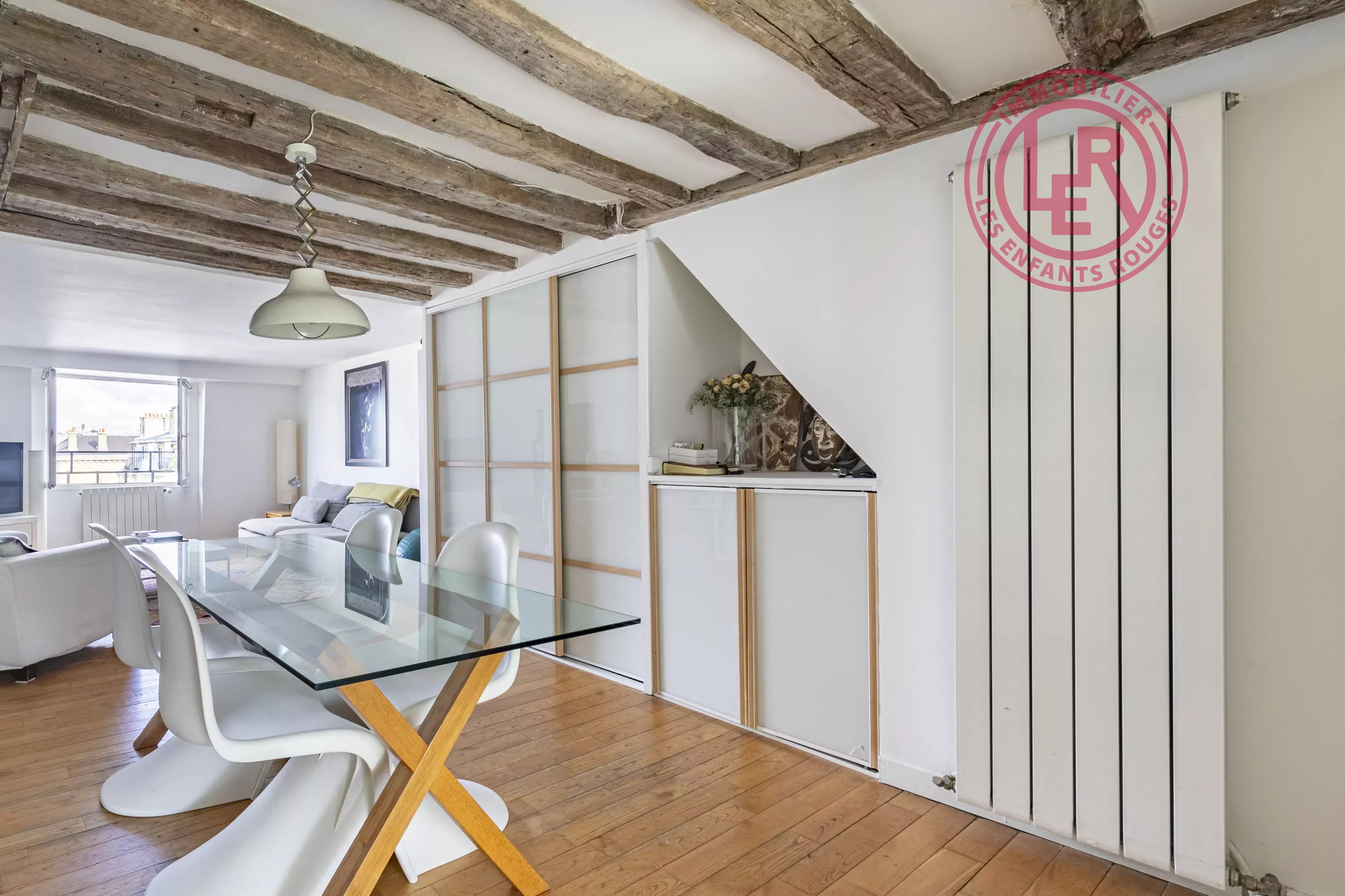 Au coeur de la rue des Gravilliers, au 6ème et dernier étage (sans ascenseur) d'un immeuble du 17ème aux parties communes rénovées, appartement atypique avec tout le charme du Marais, d'une superficie de 64m2 (57,38m2 Carrez) traversant Sud et Nord avec vues dégagées sur les toits de Paris, le Sacré Coeur et Beaubourg. Cet écrin de lumière se compose d'une entrée avec salle d'eau et toilettes, une vaste pièce de vie avec cuisine ouverte, baignée de lumière et traversante ; au-dessus, une grande chambre avec salle de bains ouverte et toilettes. Les informations sur les risques auxquels ce bien est exposé sont disponibles sur le site Géorisques : www.georisques.gouv.fr Agent commercial immatriculée au Registre spécial des agents commerciaux du greffe du tribunal de commerce de PARIS, sous le numéro 483 083 077