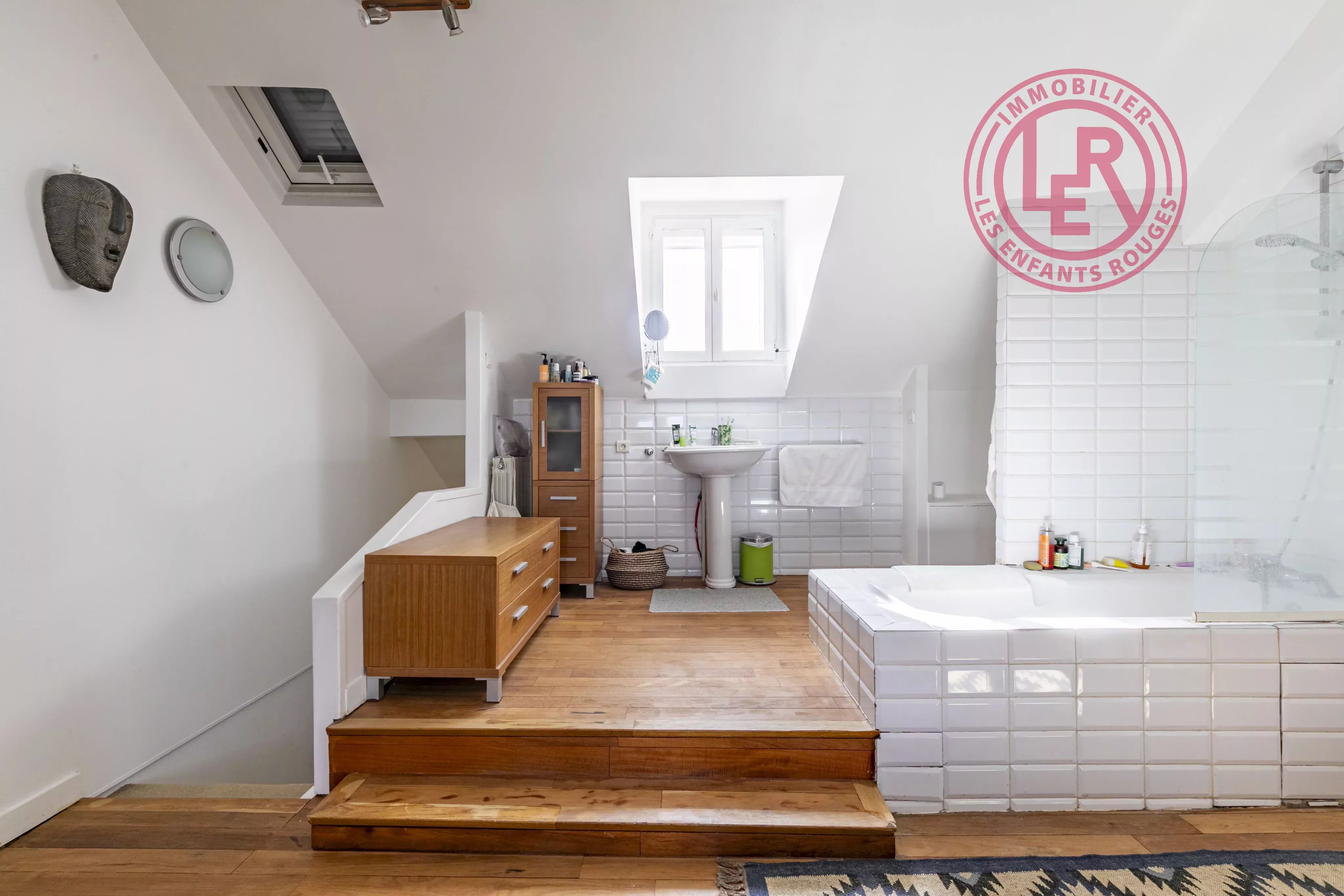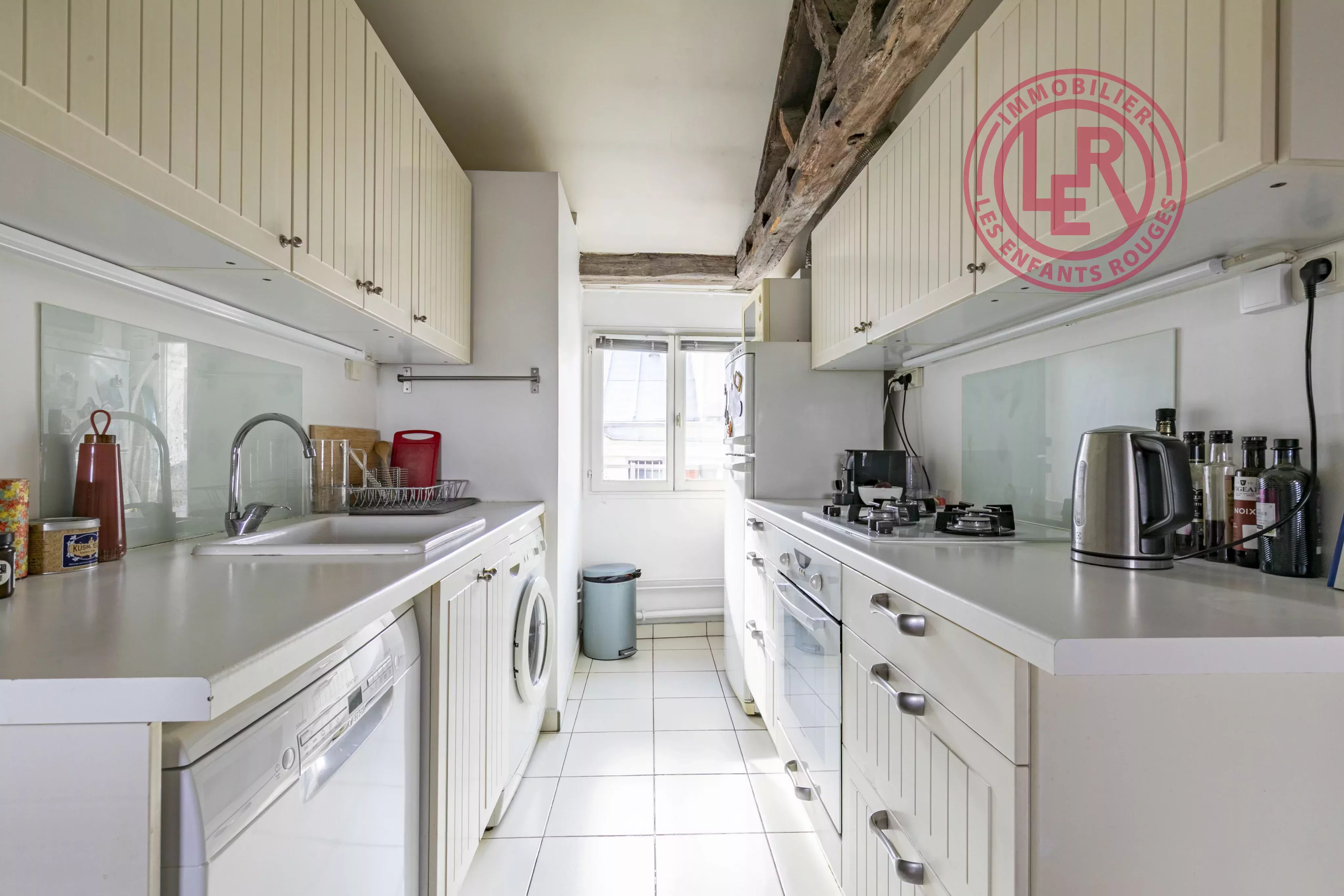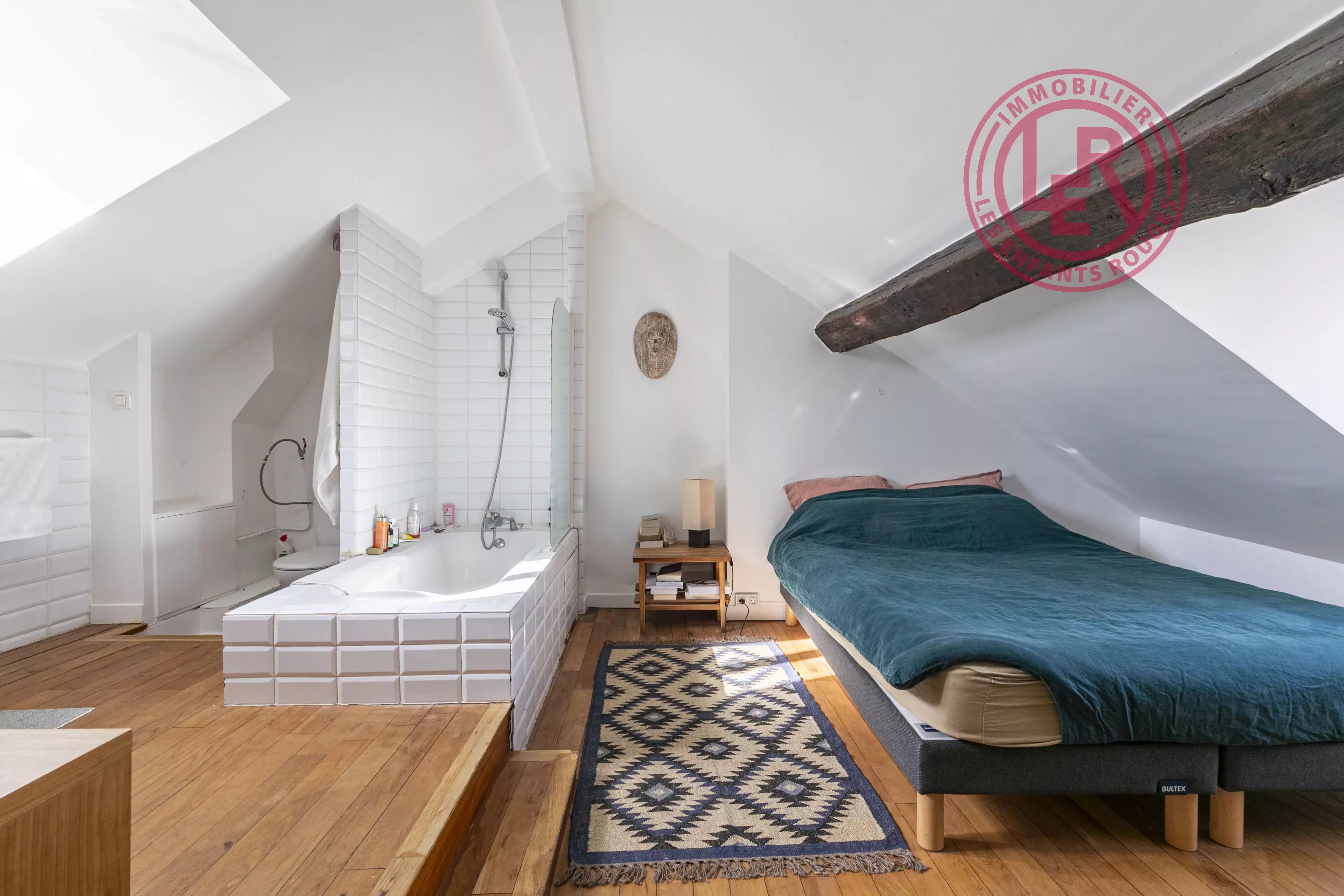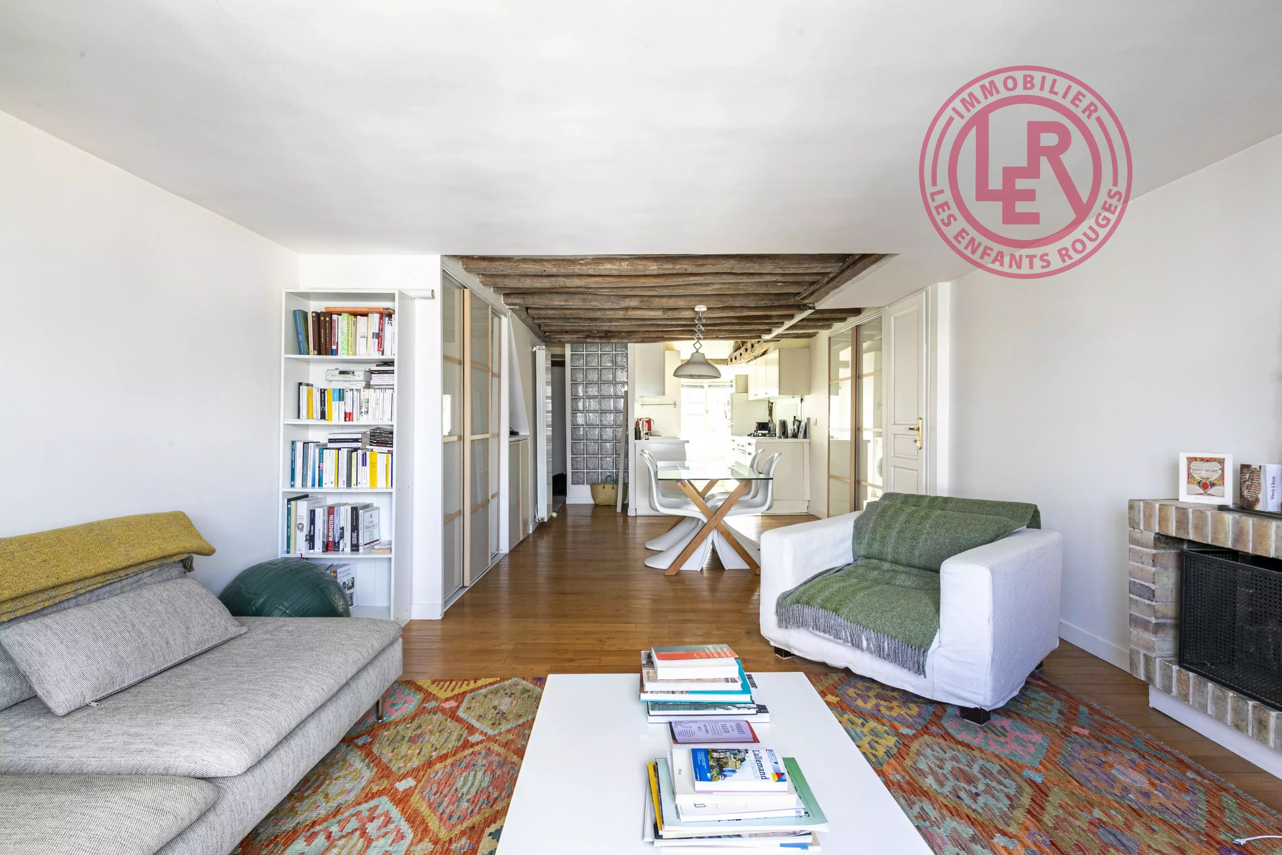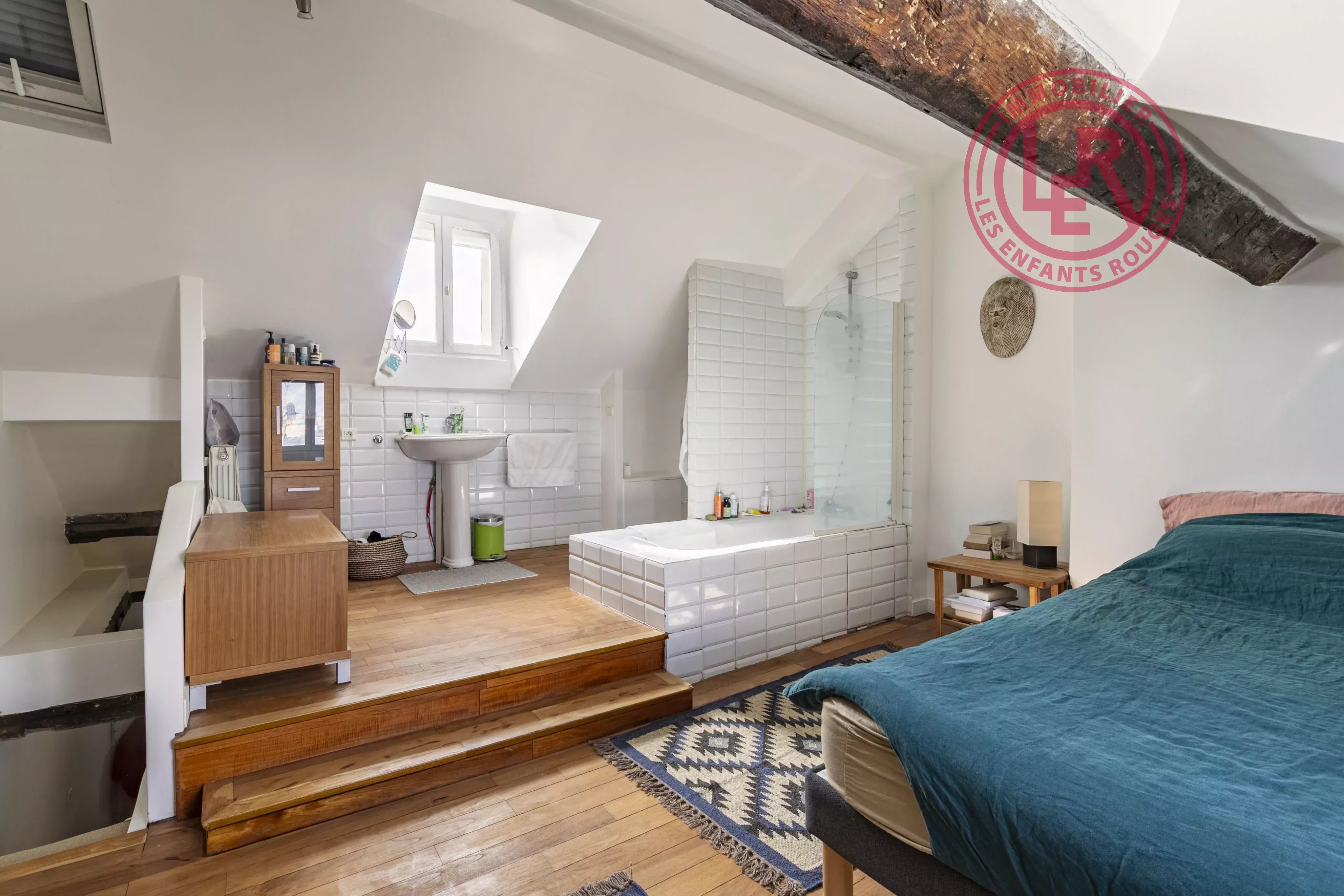 Au coeur de la rue des Gravilliers, au 6ème et dernier étage (sans ascenseur) d'un immeuble du 17ème aux parties communes rénovées, appartement atypique avec tout le charme du Marais, d'une superficie de 64m2 (57,38m2 Carrez) traversant Sud et Nord avec vues dégagées sur les toits de Paris, le Sacré Coeur et Beaubourg. Cet écrin de lumière se compose d'une entrée avec salle d'eau et toilettes, une vaste pièce de vie avec cuisine ouverte, baignée de lumière et traversante ; au-dessus, une grande chambre avec salle de bains ouverte et toilettes. Les informations sur les risques auxquels ce bien est exposé sont disponibles sur le site Géorisques : www.georisques.gouv.fr Agent commercial immatriculée au Registre spécial des agents commerciaux du greffe du tribunal de commerce de PARIS, sous le numéro 483 083 077