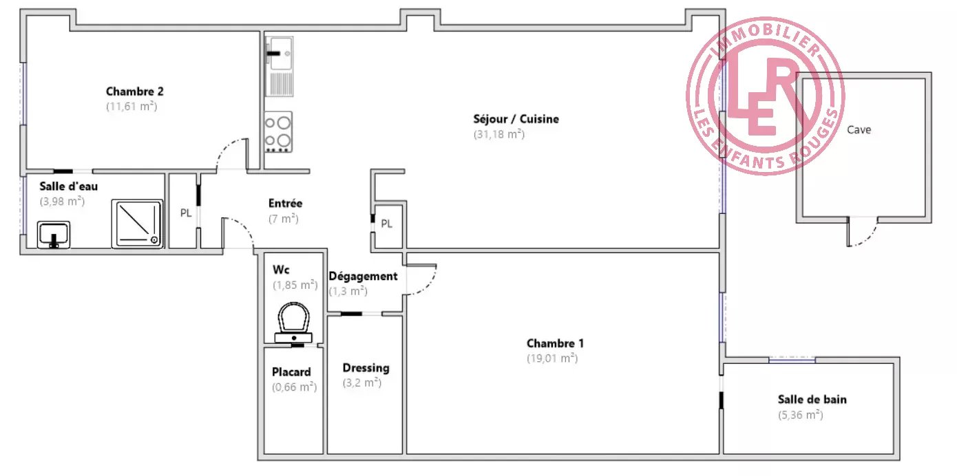 D’une superficie de 87,21 m² au sol (85,15 m² Carrez), il se compose d’une entrée, d’une double réception lumineuse avec cuisine ouverte sur cour, de deux chambres dont une sur cour avec sa salle de bains et une sur rue avec sa salle de douche, d'un grand dressing et de toilettes séparées.