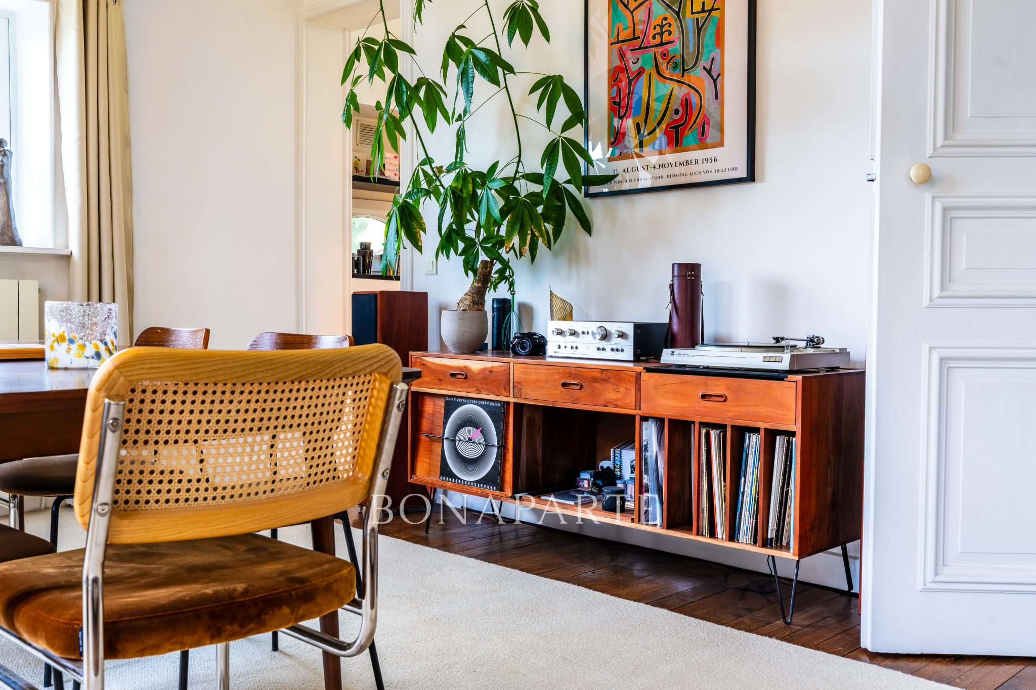 Des volumes généreux et lumineux, sublimés par des matériaux nobles : carreaux de ciment, marbre, parquet, cheminées, escaliers et poutres apparentes.