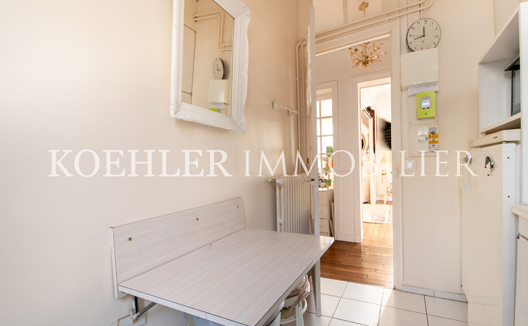 EXCLUSIVITE KOEHLER IMMOBLIER - LE RAINCY HYPERCENTRE : Situé dans un immeuble de standing dont les parties communes viennent d'être restaurées, cet appartement de 4 pièces comprend : une entrée, une cuisine aménagée, un séjour / salle à manger avec cheminée, une salle de bains et deux chambres. L'ensemble est très lumineux, parquets et moulures d'origine. Une cave complète ce bien. Chaudière individuelle neuve. Copropriété et appartement bien entretenus. (4.67 % honoraires TTC à la charge de l'acquéreur.)