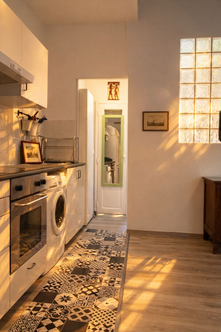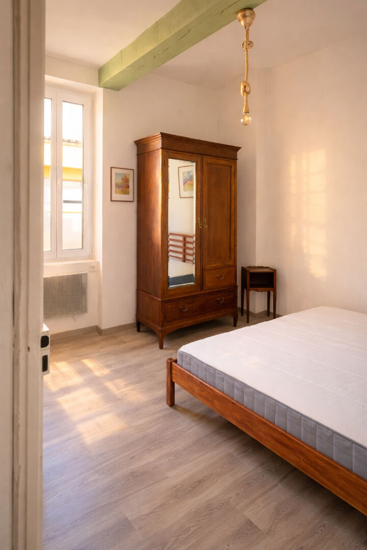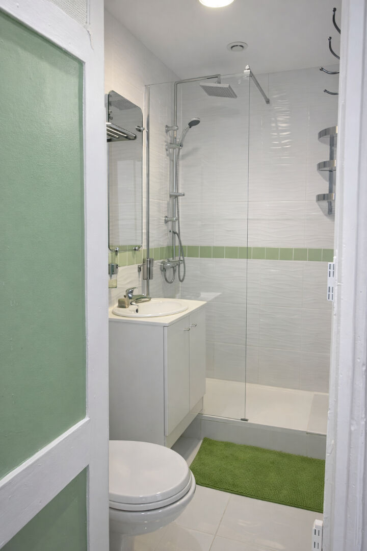 Appartement de 32m² comprenant une cuisine entièrement équipée avec lave-linge, plaques électriques, four et réfrigérateur. La pièce principale est aménagée avec un canapé-lit, une table avec chaises et une télévision. La chambre dispose d'un lit double et d'une armoire. Une salle d'eau complète ce bien. Situé au troisième étage d'un immeuble de 4 niveaux, sans ascenseur.