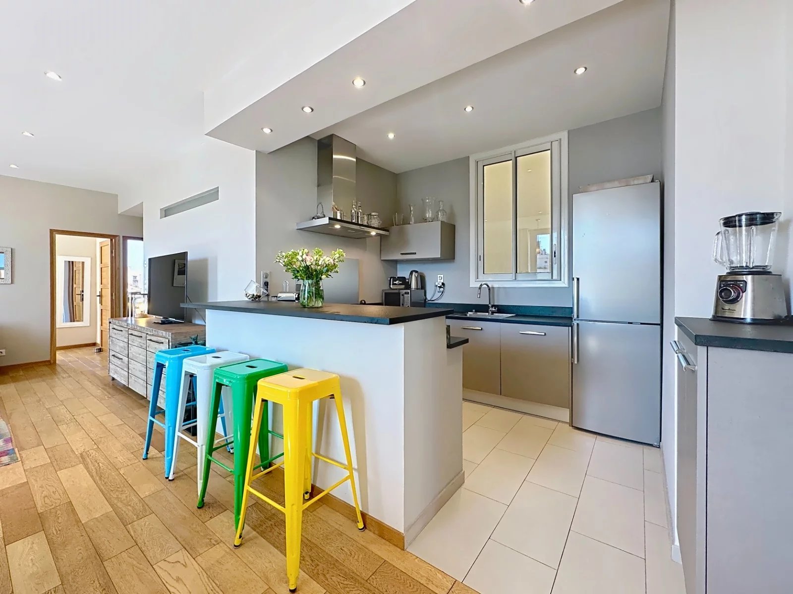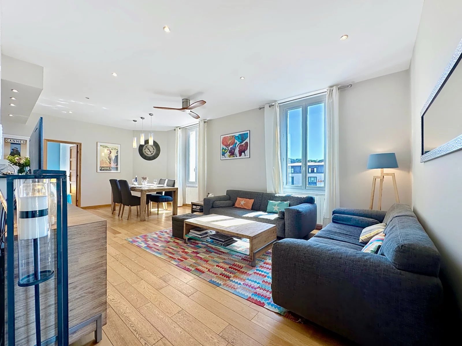 Situé à 10 minutes à pied du Palais des Festivals, de la Croisette et du marché Forville, cet appartement de 96 m² environ, entièrement rénové avec des matériaux haut de gamme, offre un cadre de vie raffiné au sein d’une résidence Art Déco de 1926.