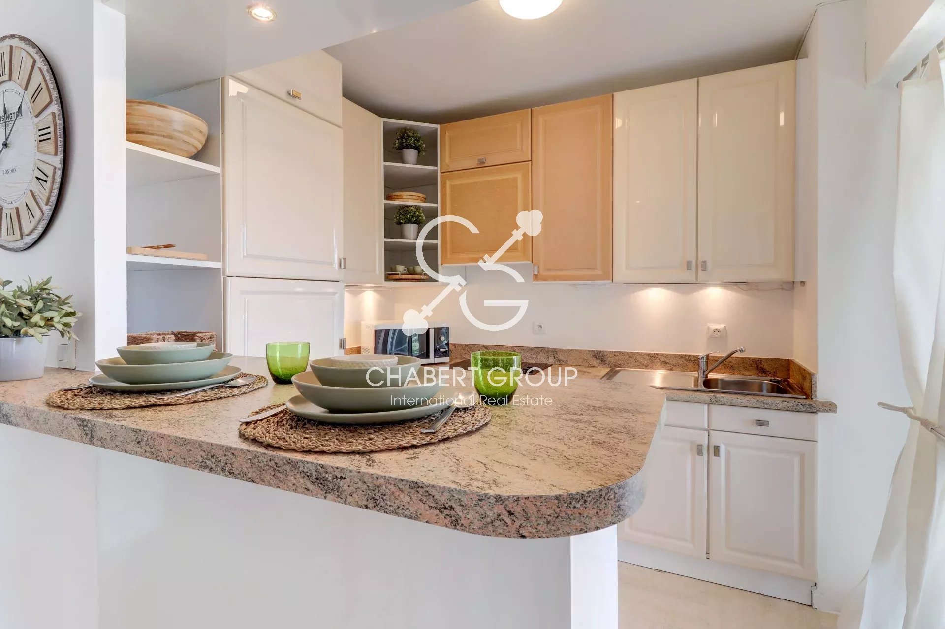 Il se compose d'une entrée avec penderie, d'un séjour avec cuisine américaine équipée donnant sur la très grande terrasse de 25 m² afin de profiter d'une vue mer sur la charmante rade de Villefranche et la presqu'île de Saint-Jean-Cap-Ferrat.