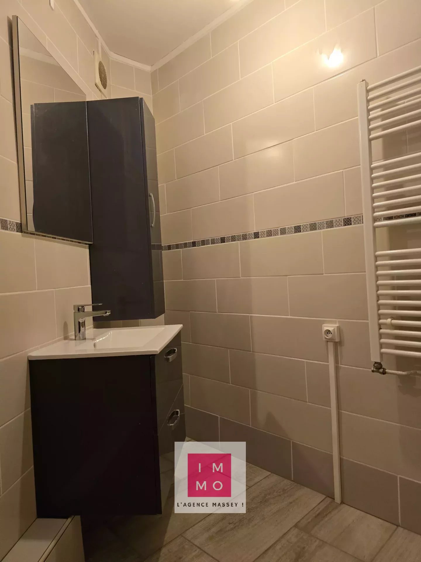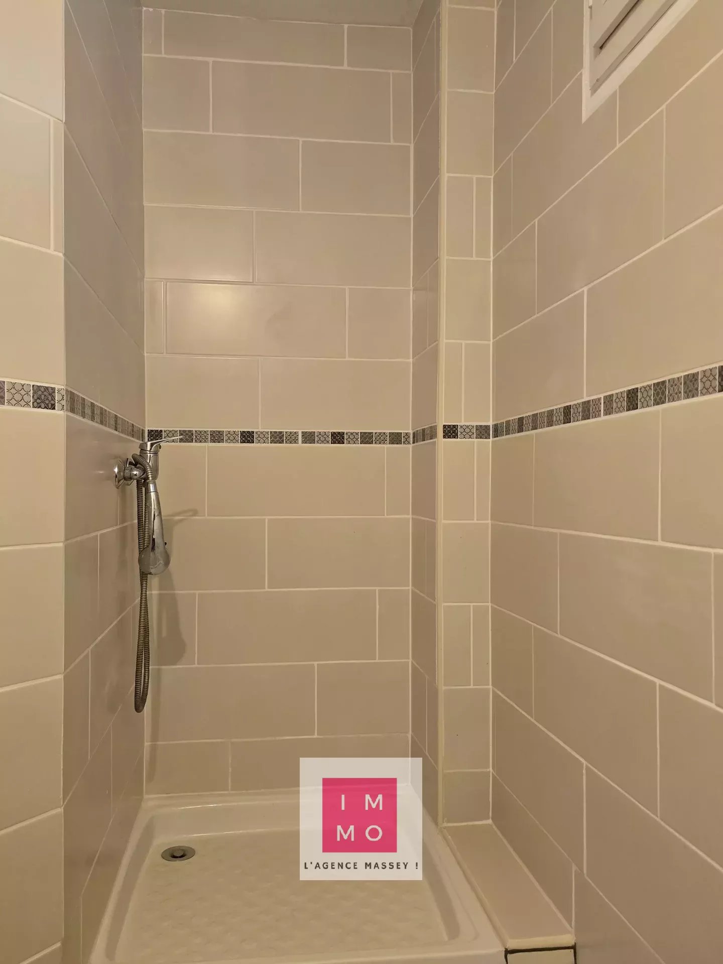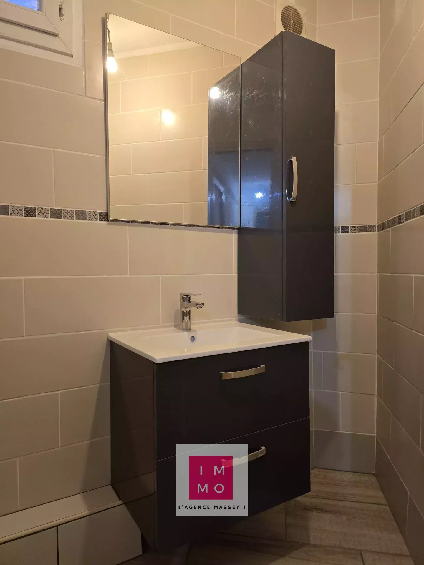 La salle d’eau, rénovée elle aussi, offre un design moderne : meuble vasque suspendu avec rangements, miroir de grande dimension et colonne murale coordonnée. Le tout accompagné d’un carrelage contemporain et soigné. Les toilettes sont séparées.