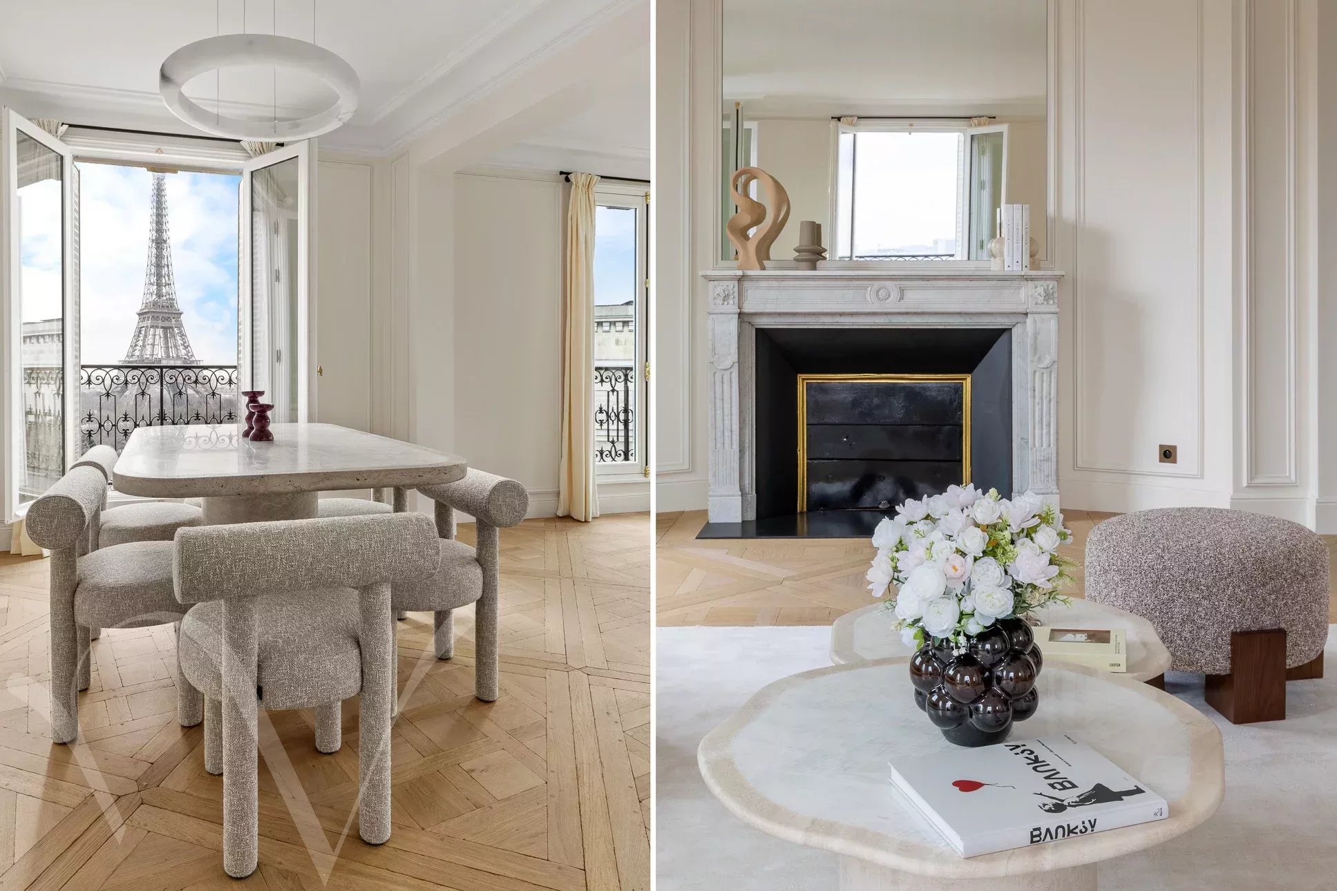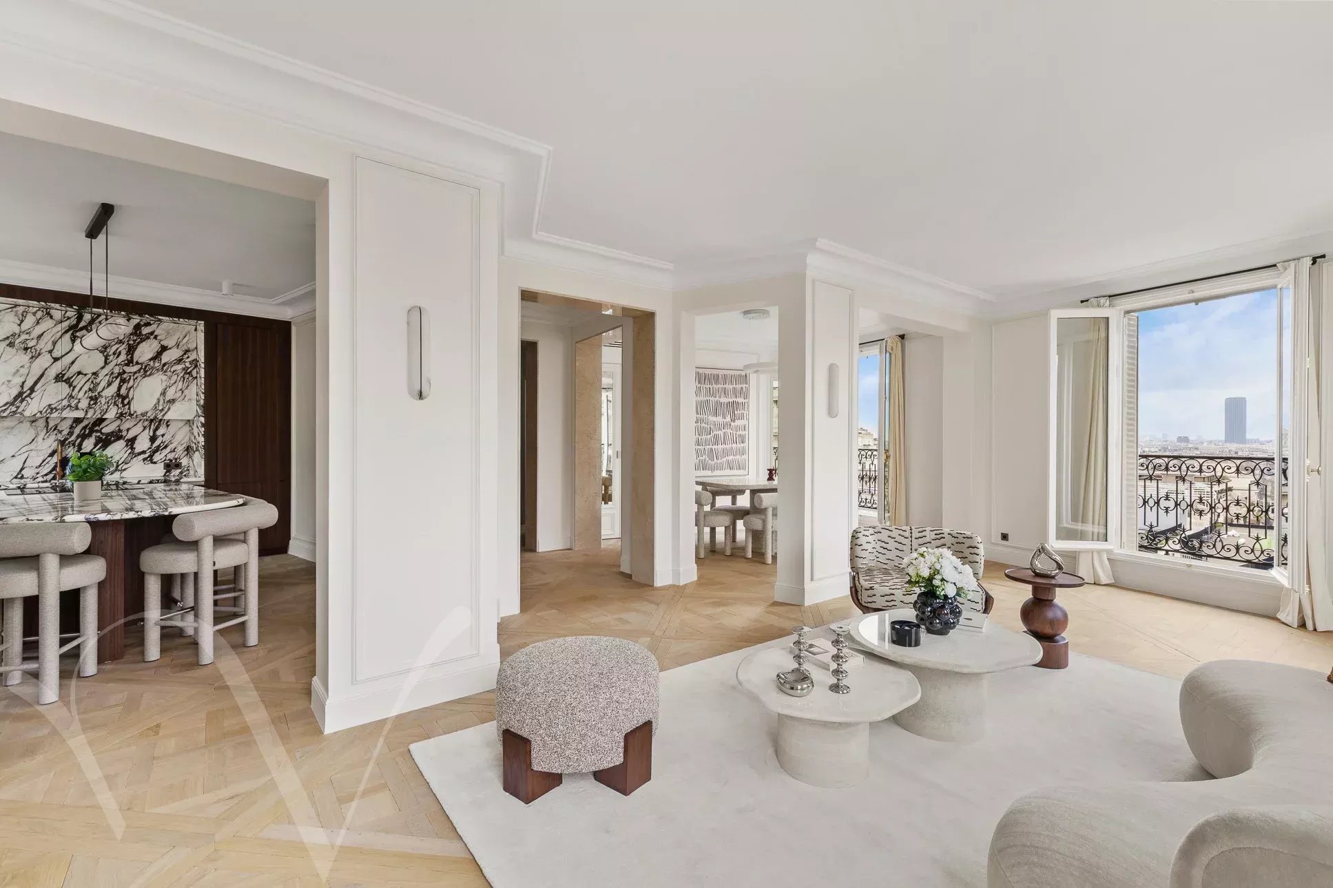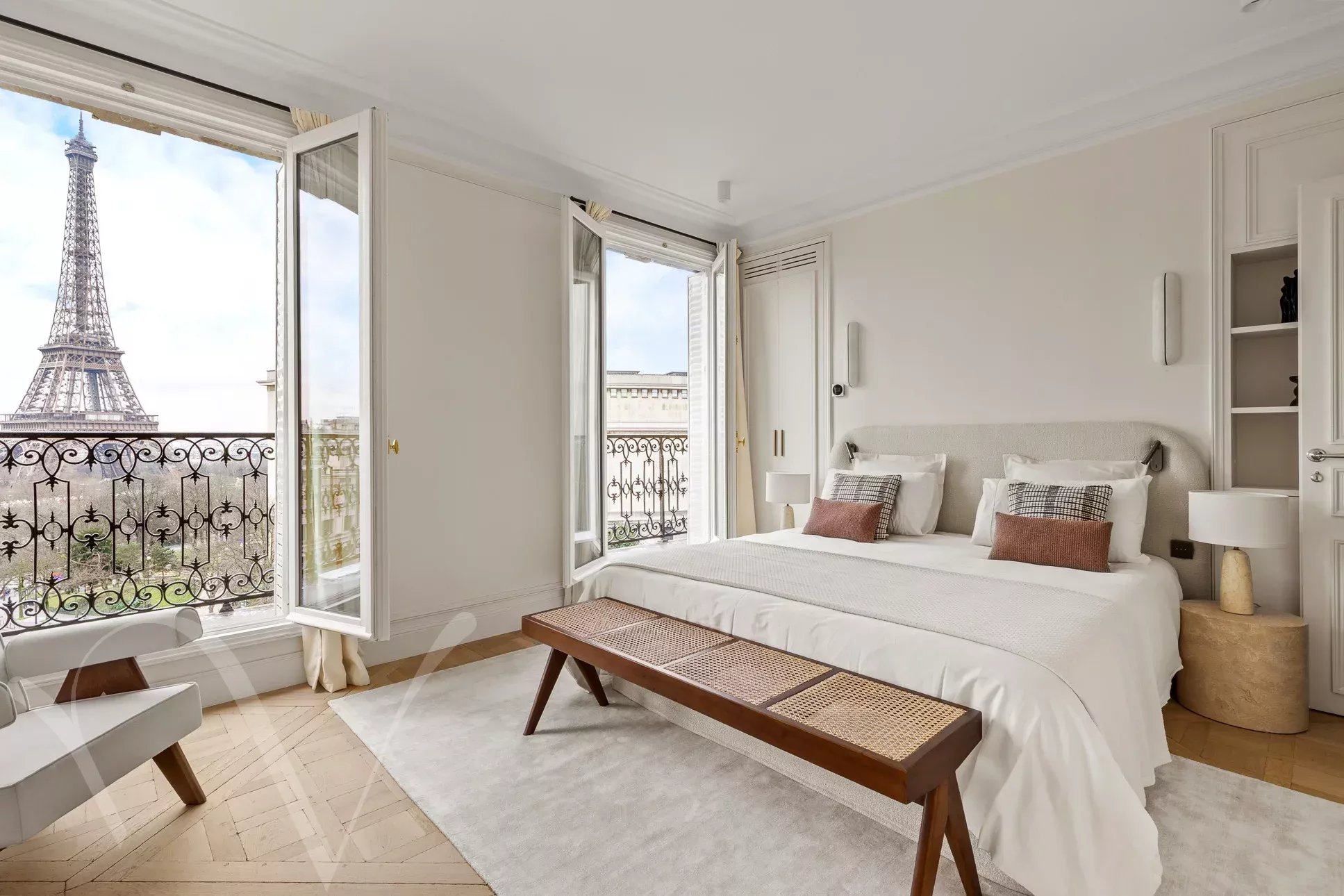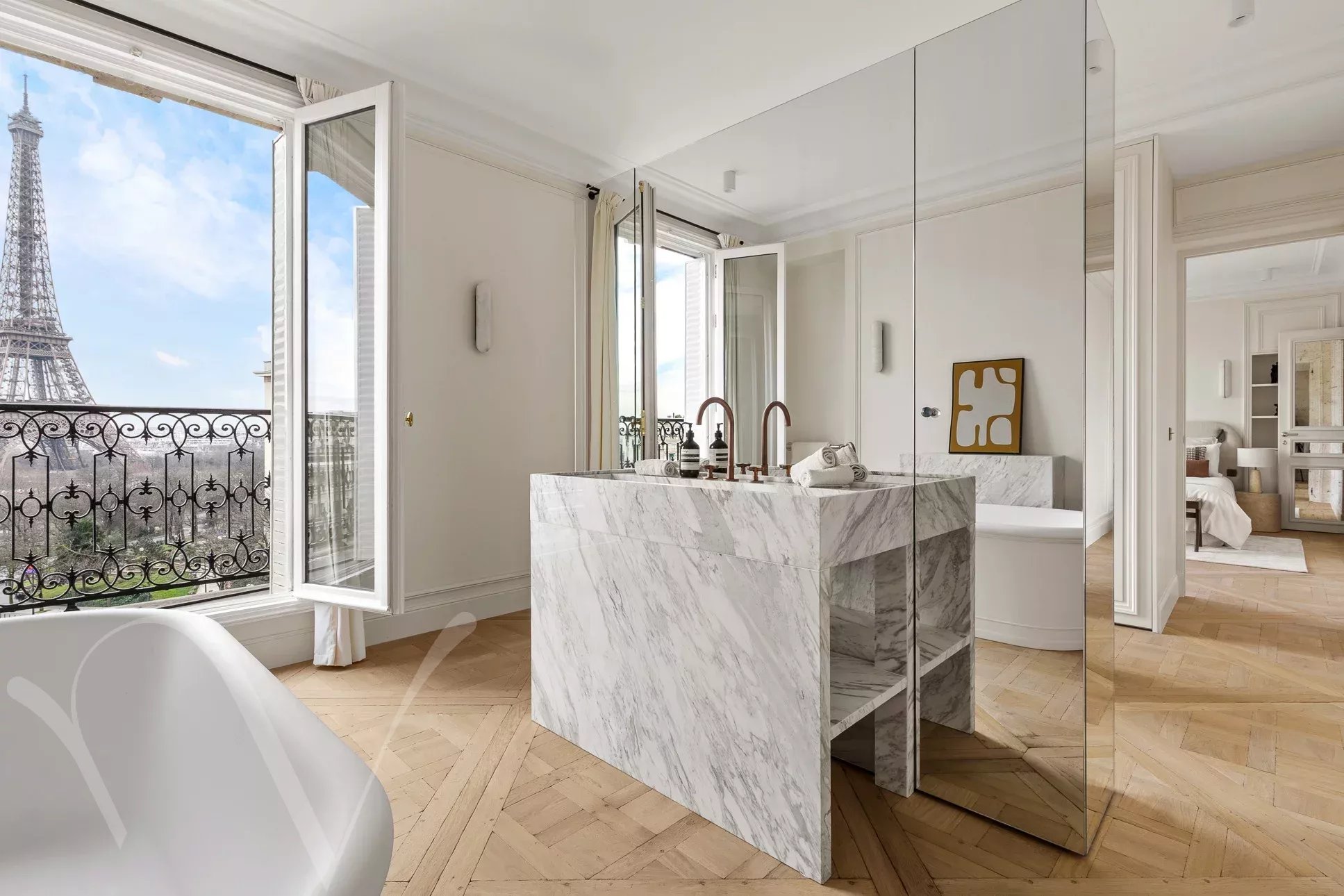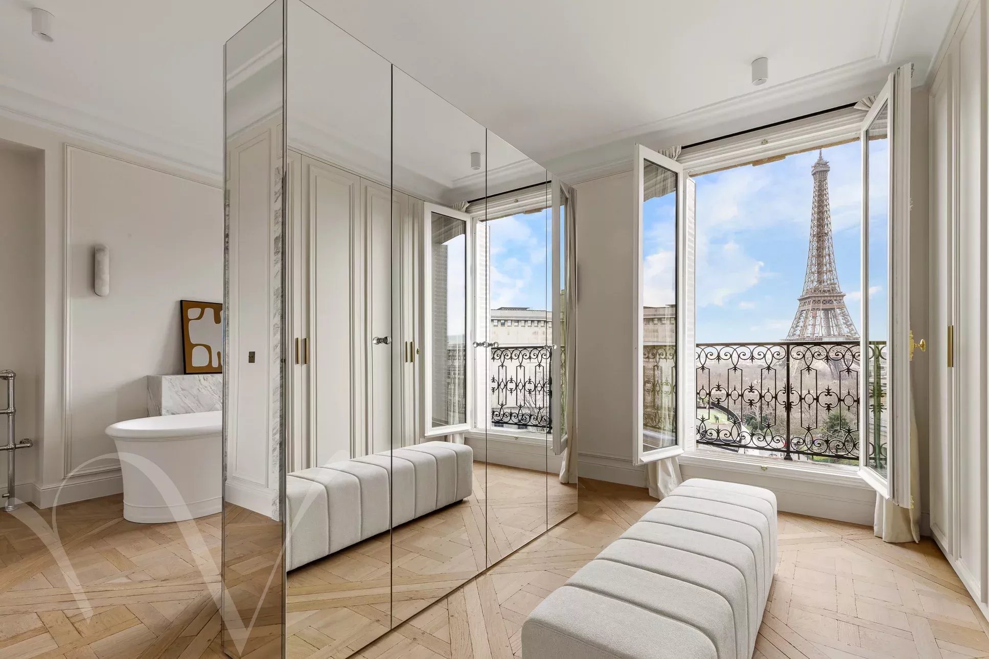 Dans un bel immeuble en pierre de taille, au cinquième étage avec ascenseur, cet élégant appartement de 154m² climatisé, entouré d'un balcon avec une vue sublime sur la Tour Eiffel et tous les monuments de Paris. Ayant bénéficié d'une rénovation très luxueuse, l'appartement offre un plan optimisé avec une entrée desservant un salon et une salle à manger et une grande cuisine aménagée avec un bar. La chambre principale profite de la vue magnifique, un grand dressing et une salle de bains complète, une deuxième chambre en suite avec une salle de douche avec toilettes. Une chambre de service et une cave complètent ce parfait pied à terre.