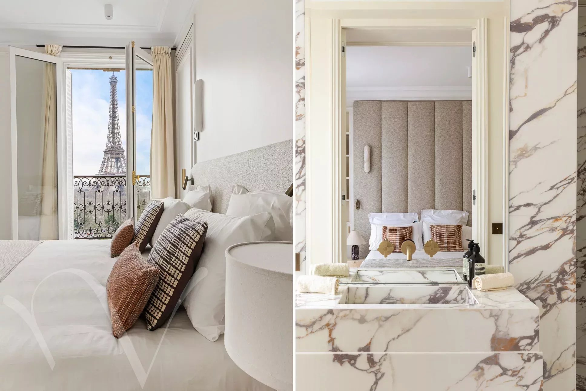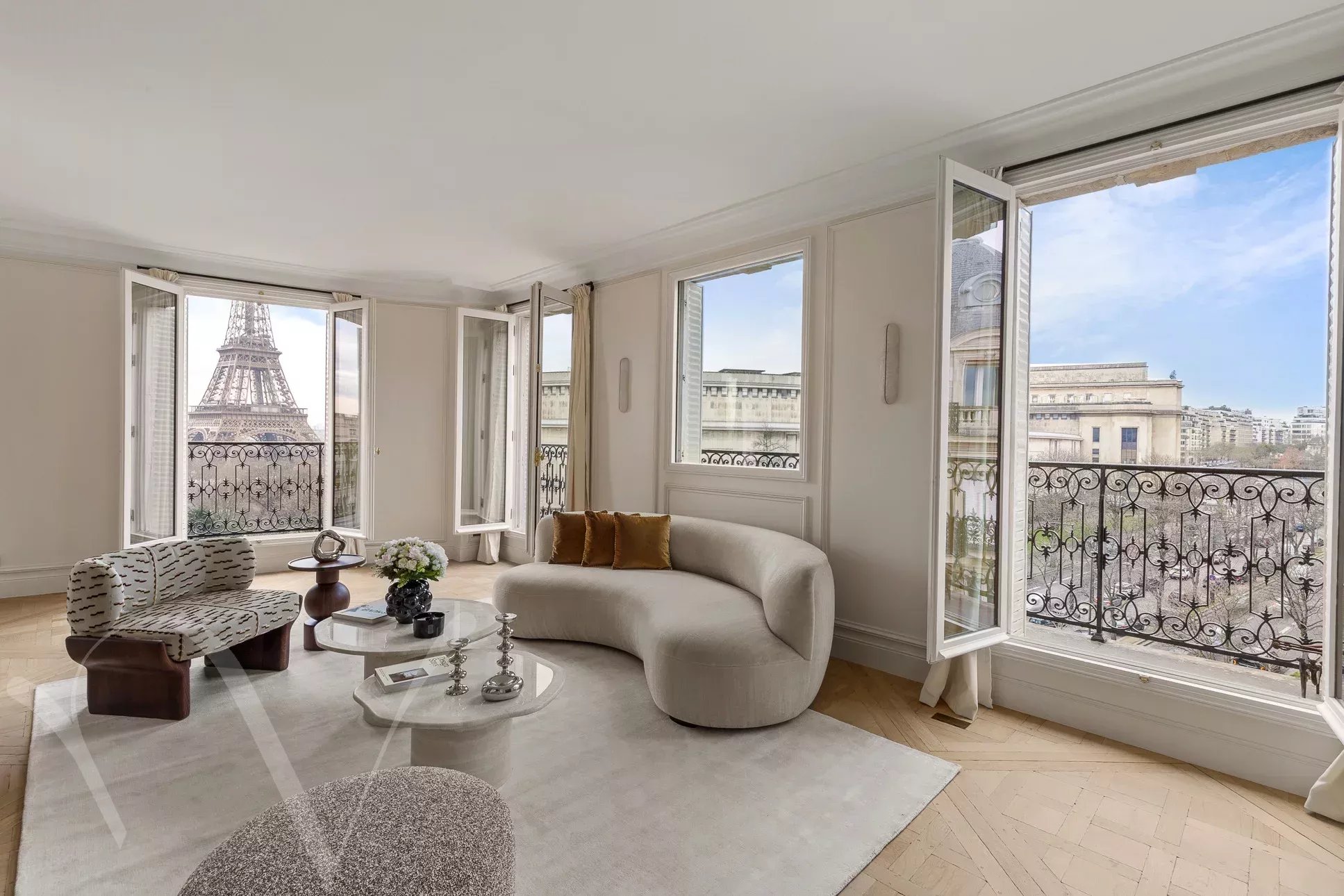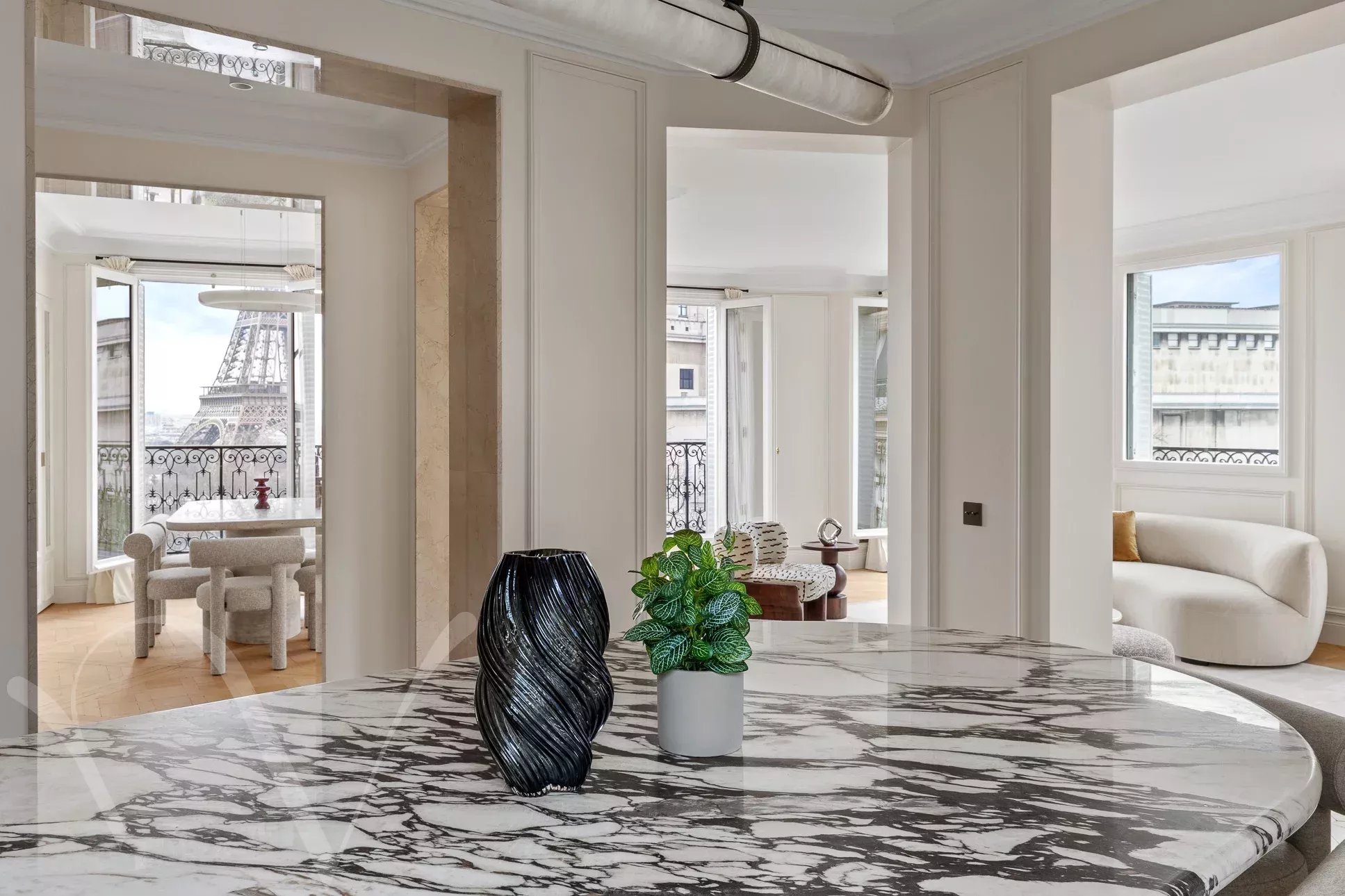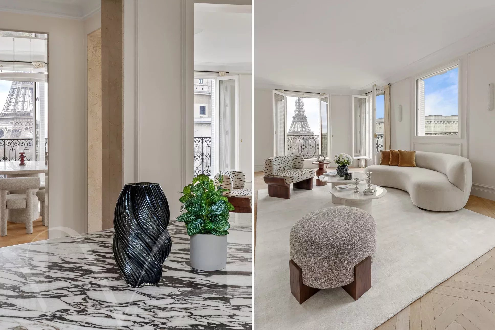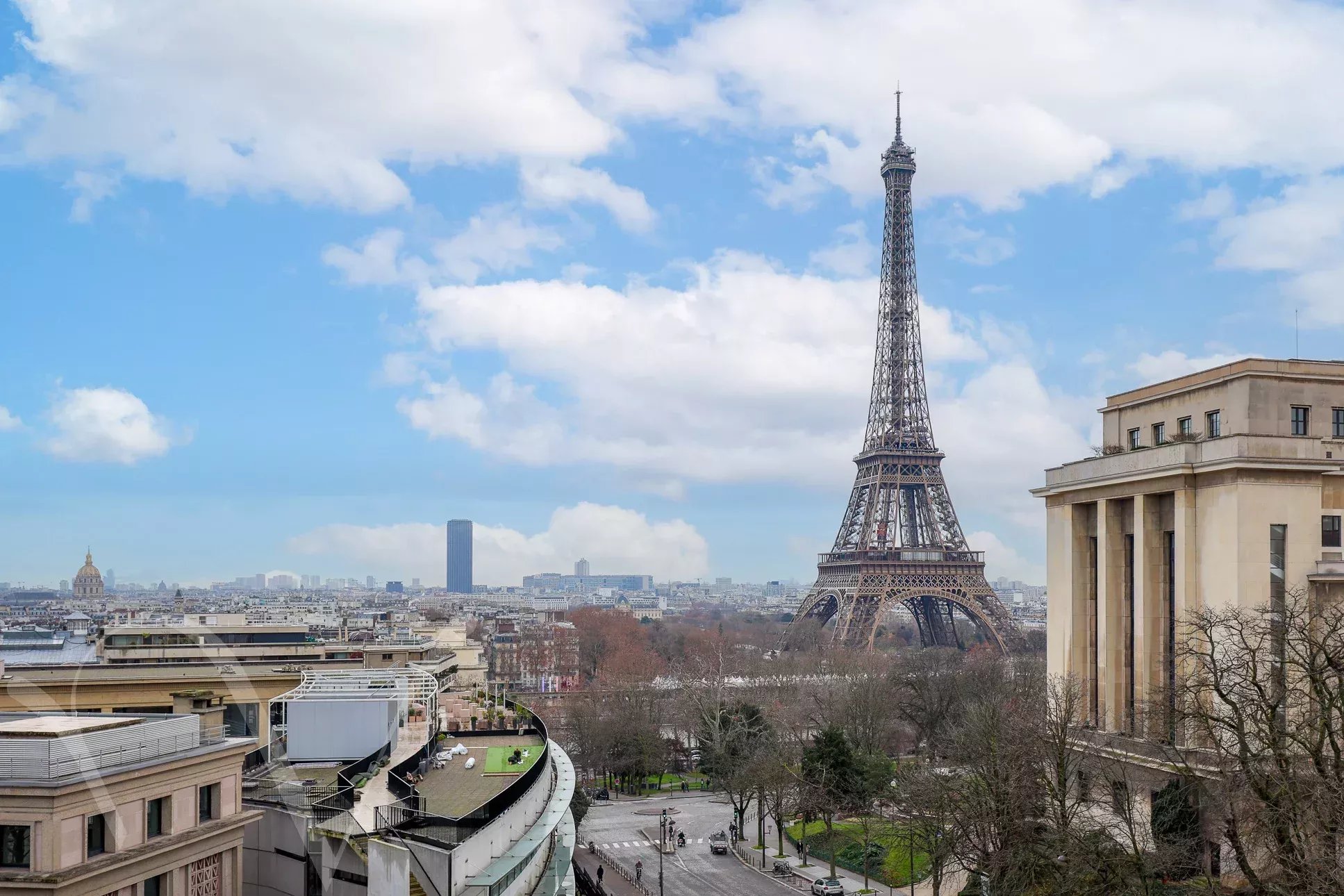 Dans un bel immeuble en pierre de taille, au cinquième étage avec ascenseur, cet élégant appartement de 154m² climatisé, entouré d'un balcon avec une vue sublime sur la Tour Eiffel et tous les monuments de Paris. Ayant bénéficié d'une rénovation très luxueuse, l'appartement offre un plan optimisé avec une entrée desservant un salon et une salle à manger et une grande cuisine aménagée avec un bar. La chambre principale profite de la vue magnifique, un grand dressing et une salle de bains complète, une deuxième chambre en suite avec une salle de douche avec toilettes. Une chambre de service et une cave complètent ce parfait pied à terre.