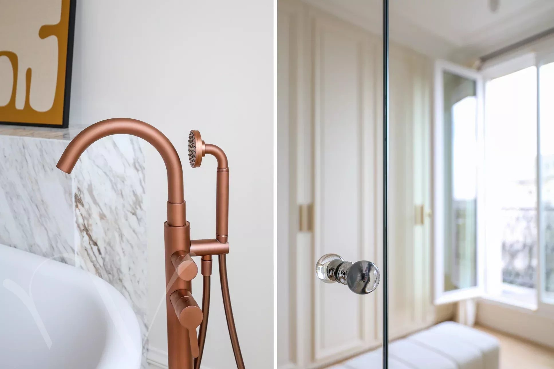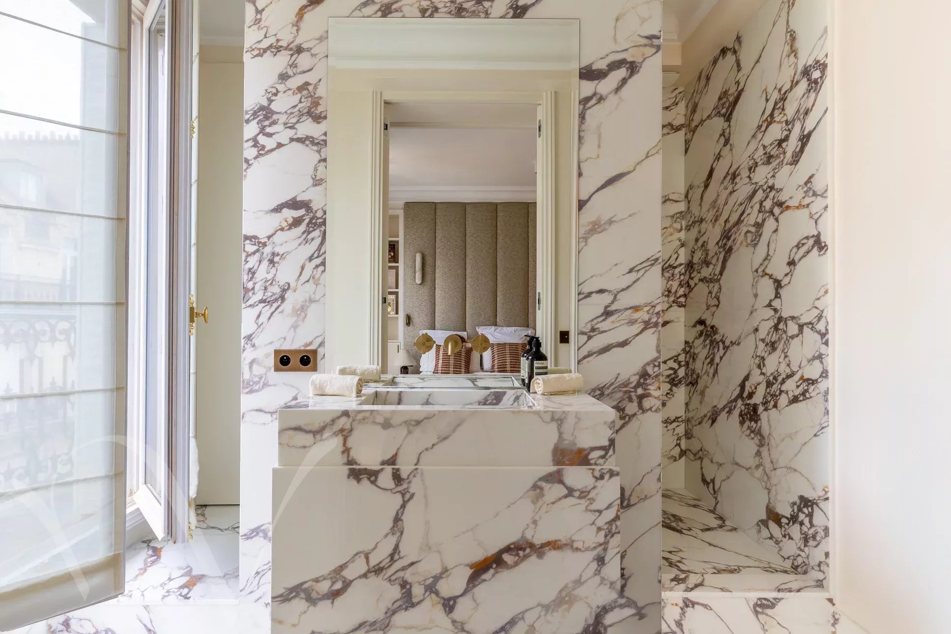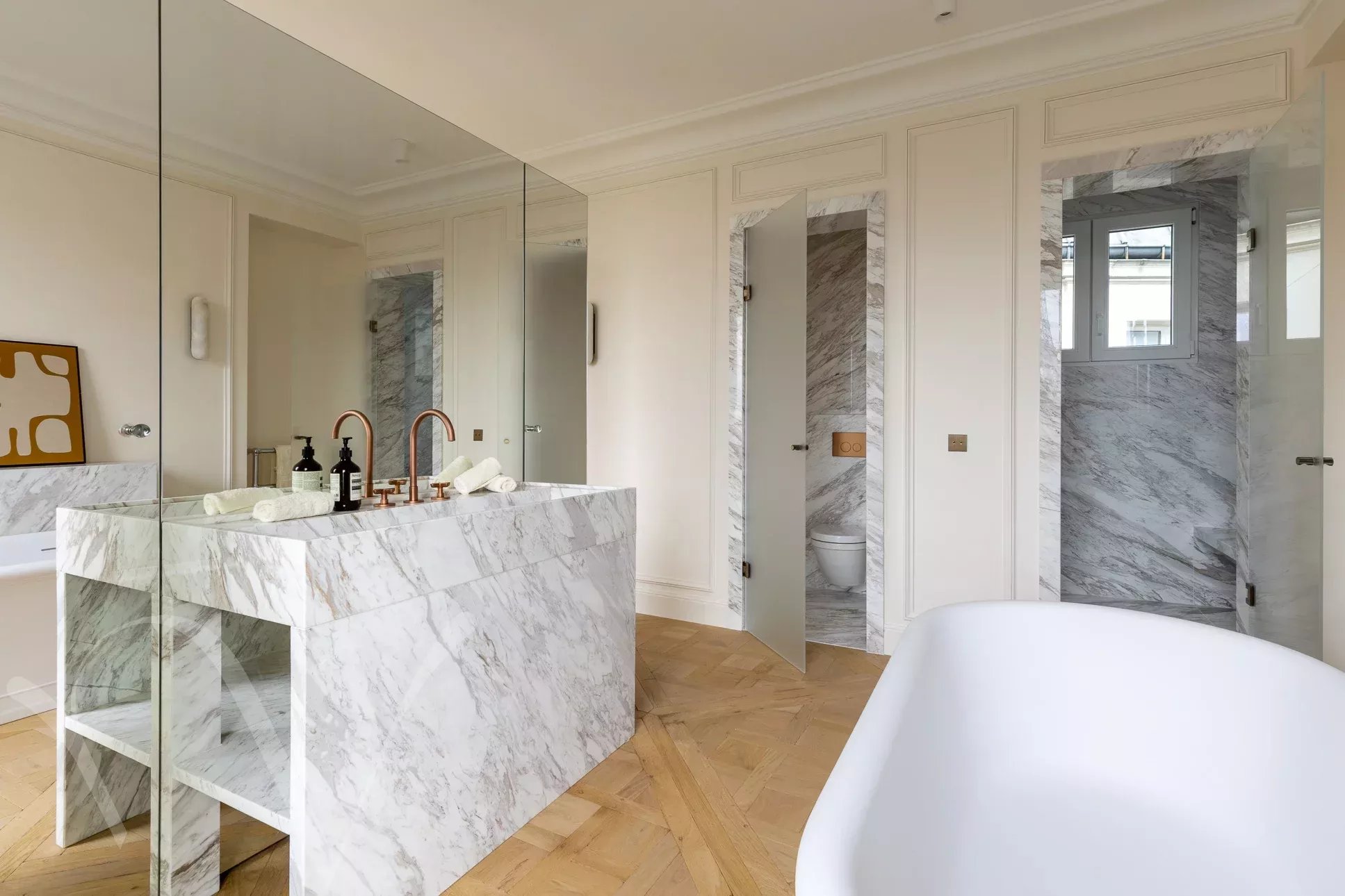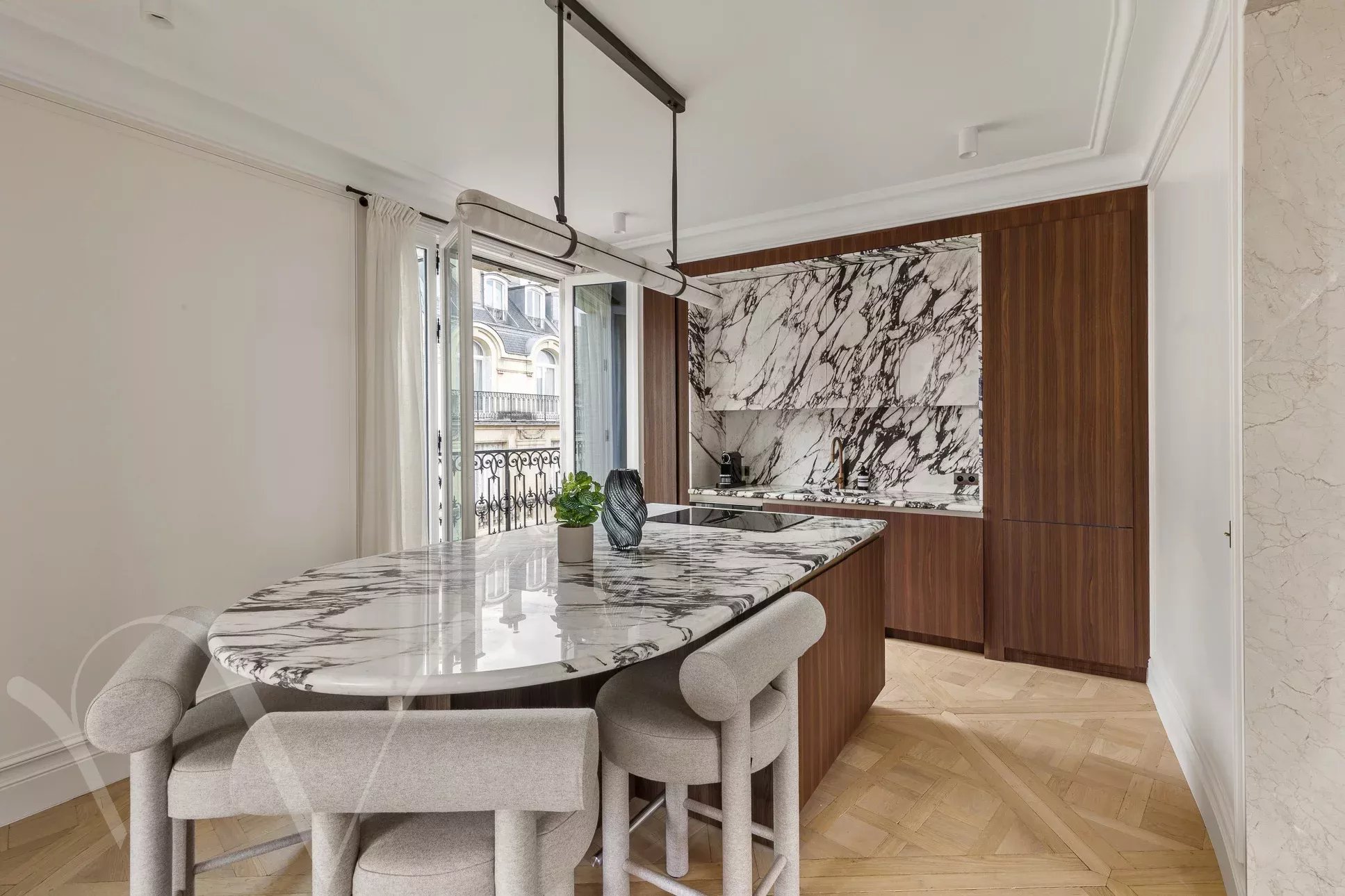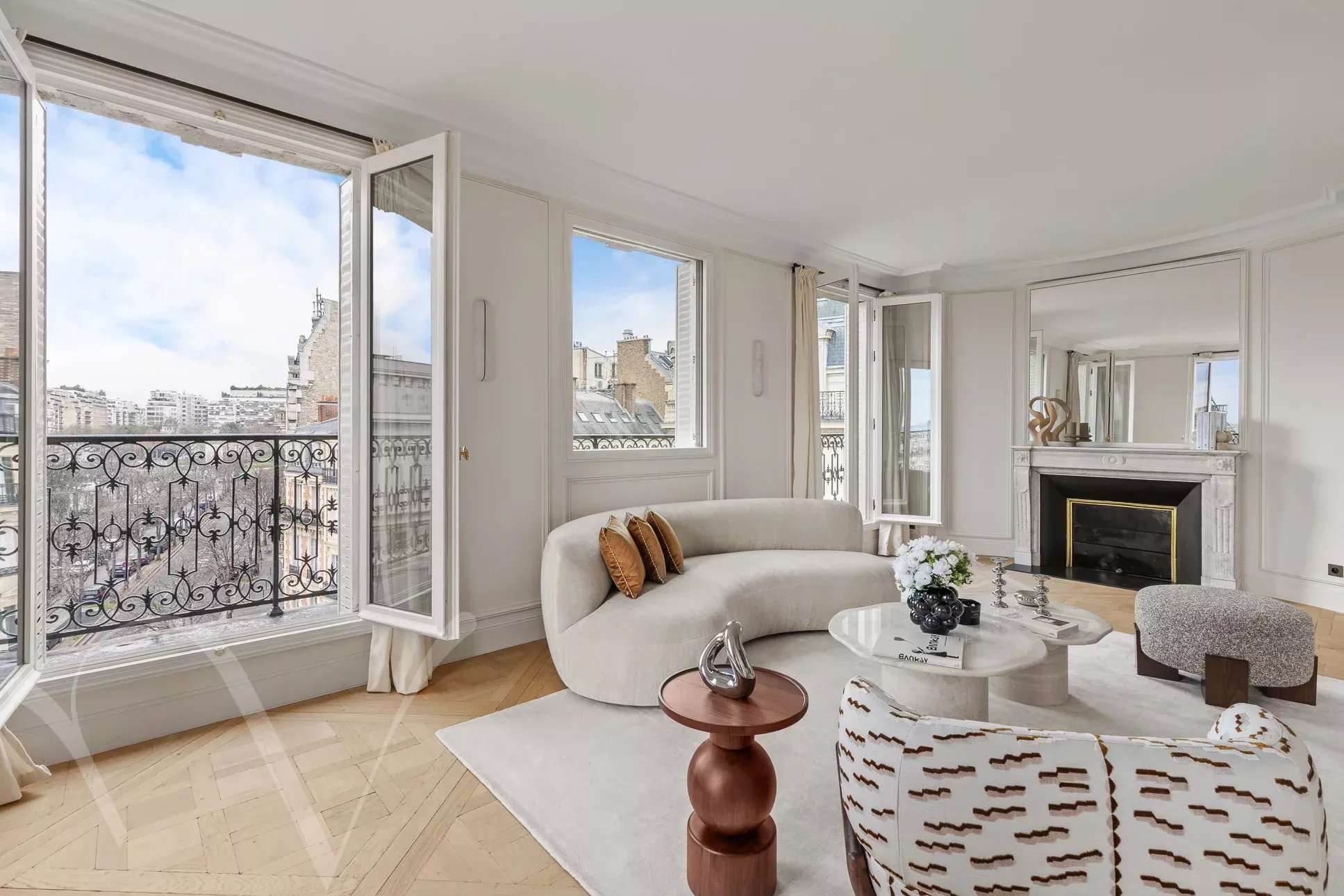 Dans un bel immeuble en pierre de taille, au cinquième étage avec ascenseur, cet élégant appartement de 154m² climatisé, entouré d'un balcon avec une vue sublime sur la Tour Eiffel et tous les monuments de Paris. Ayant bénéficié d'une rénovation très luxueuse, l'appartement offre un plan optimisé avec une entrée desservant un salon et une salle à manger et une grande cuisine aménagée avec un bar. La chambre principale profite de la vue magnifique, un grand dressing et une salle de bains complète, une deuxième chambre en suite avec une salle de douche avec toilettes. Une chambre de service et une cave complètent ce parfait pied à terre.