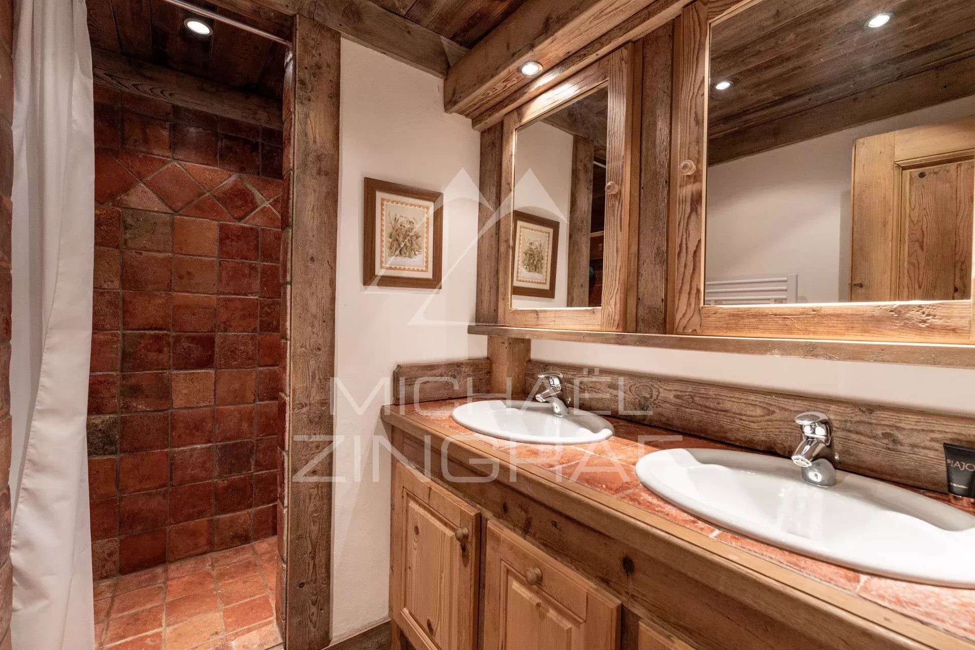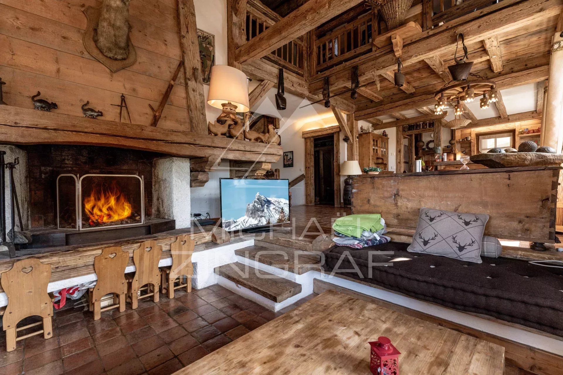 Cet authentique chalet en vieux bois offre six chambres (dont cinq en-suite et un dortoir enfants), un double salon-salle à manger avec plafond cathédrale et cheminée ouverte, et une cuisine équipée ouverte s'ouvrant sur une vaste terrasse Sud-Ouest.