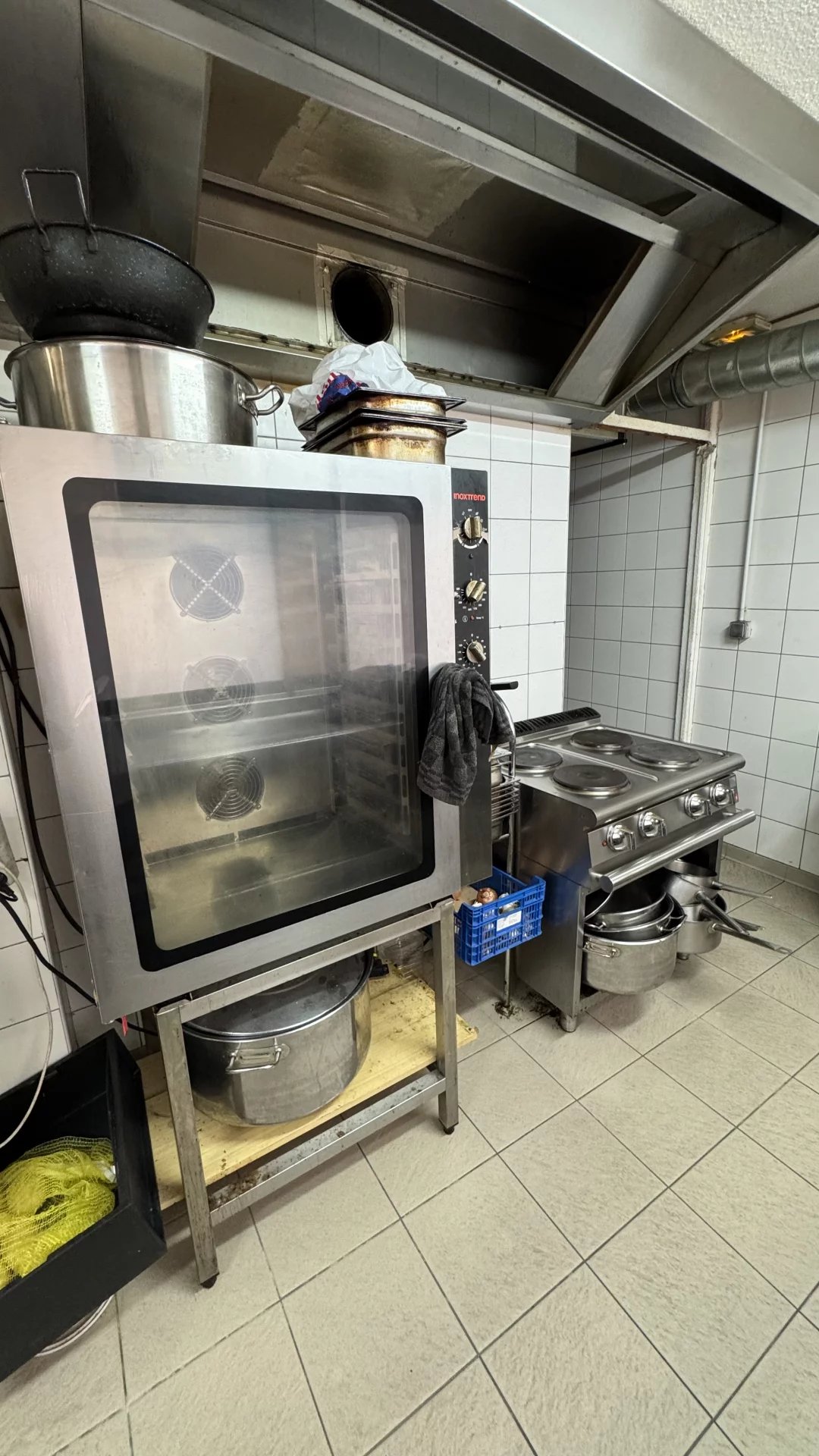 2 fours, 2 réfrigérateurs, 4 feux électriques, plonge, pétrin, congélateur, cellule de refroidissement, banque d’accueil.