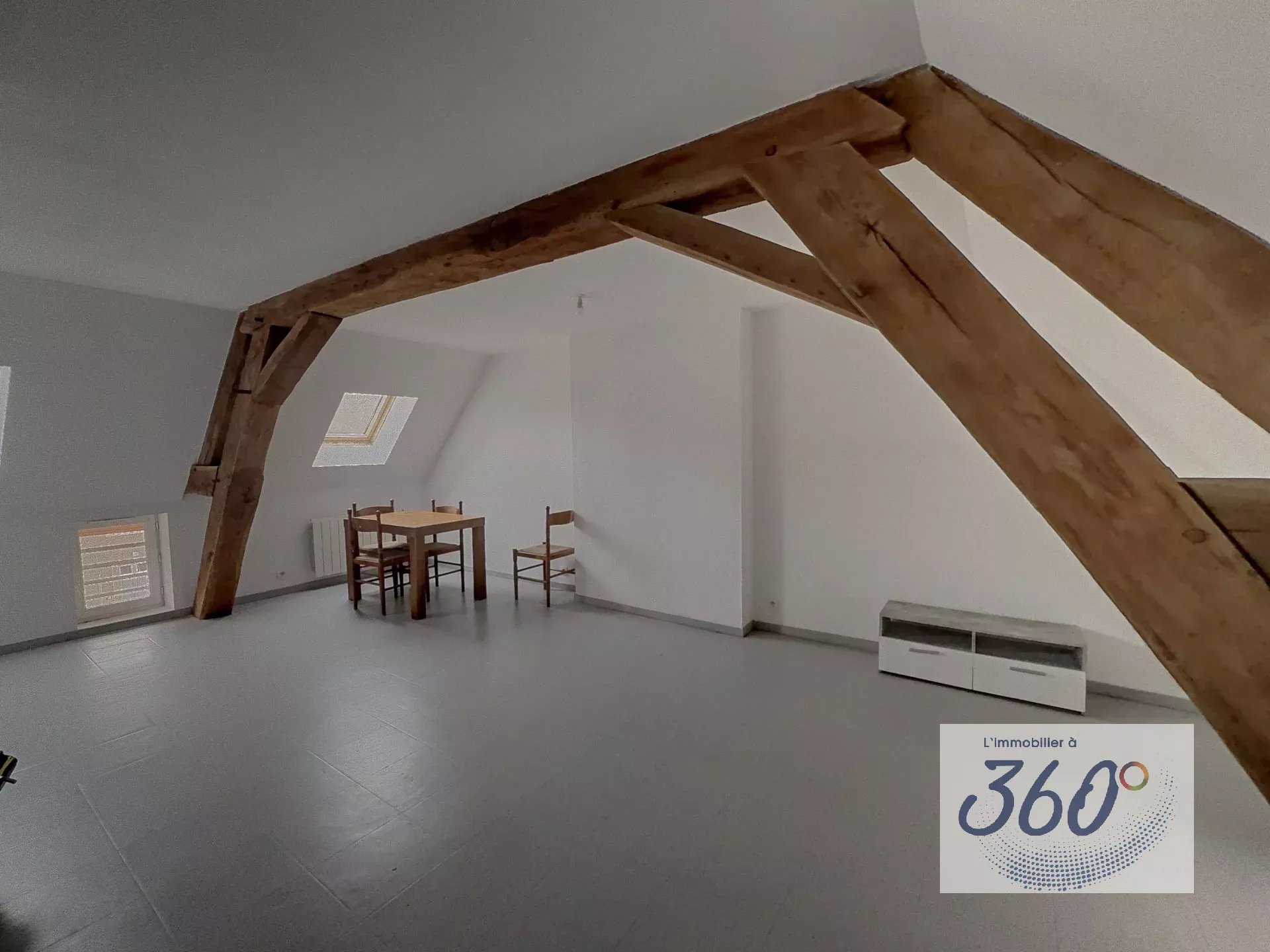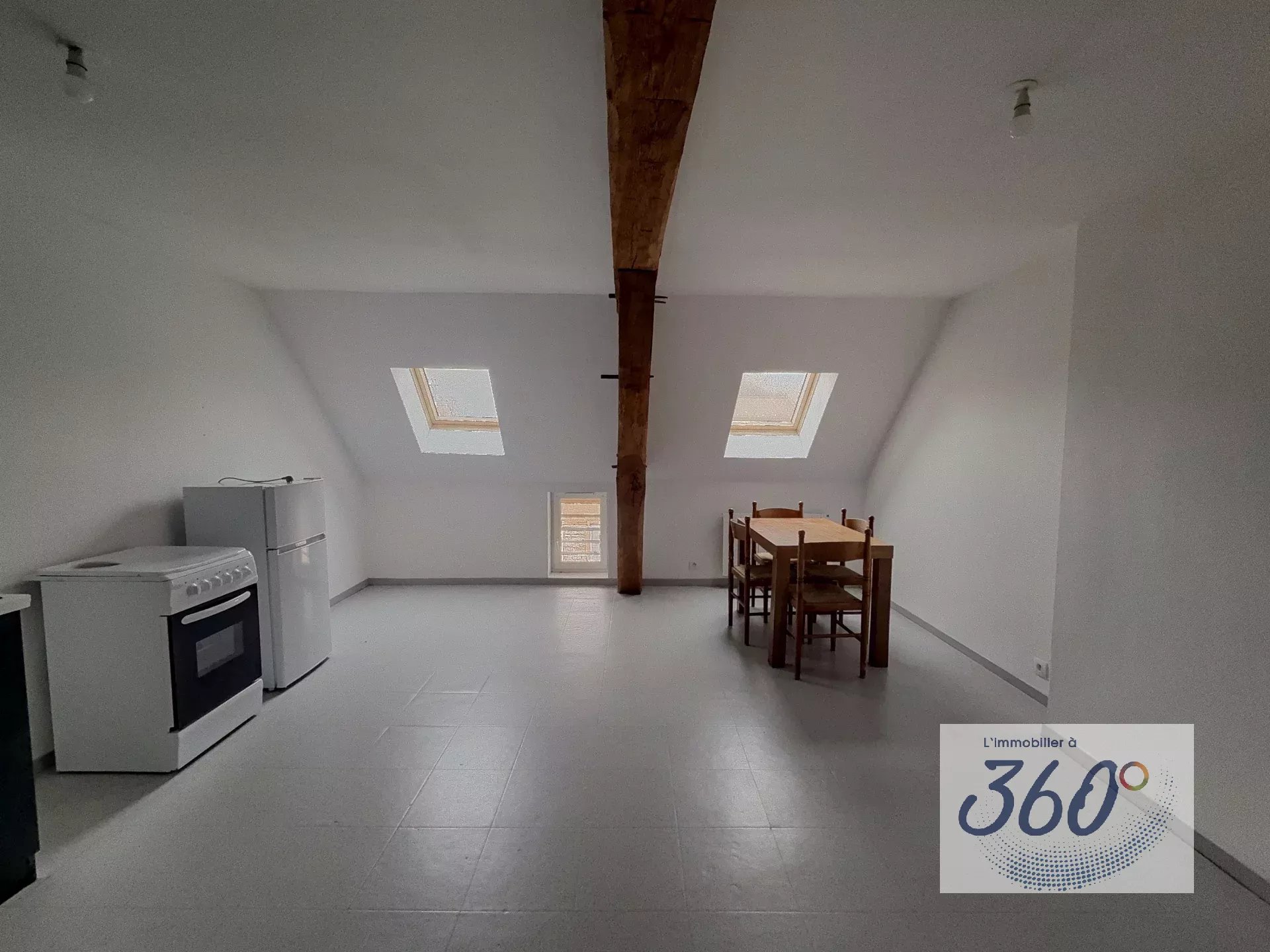 Cet appartement se compose d’une cuisine équipée comprenant une cuisinière, un four et un réfrigérateur, ouverte sur le séjour. La salle à manger, déjà meublée avec une table et des chaises, est idéale pour partager des repas conviviaux. Les poutres apparentes apportent un charme rustique et créent une atmosphère chaleureuse. L’espace nuit comprend une chambre, un bureau, ainsi qu’une salle de bain et des toilettes séparées. Un bien alliant confort et authenticité, parfait pour ceux qui recherchent calme et qualité de vie tout en restant proches des commodités.