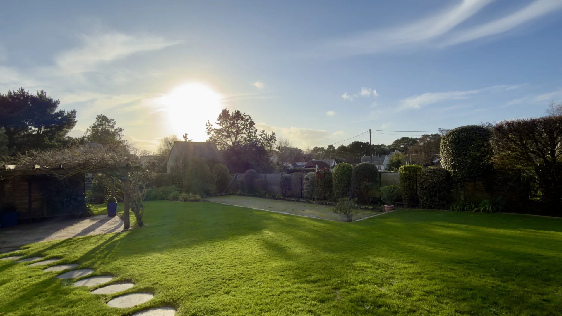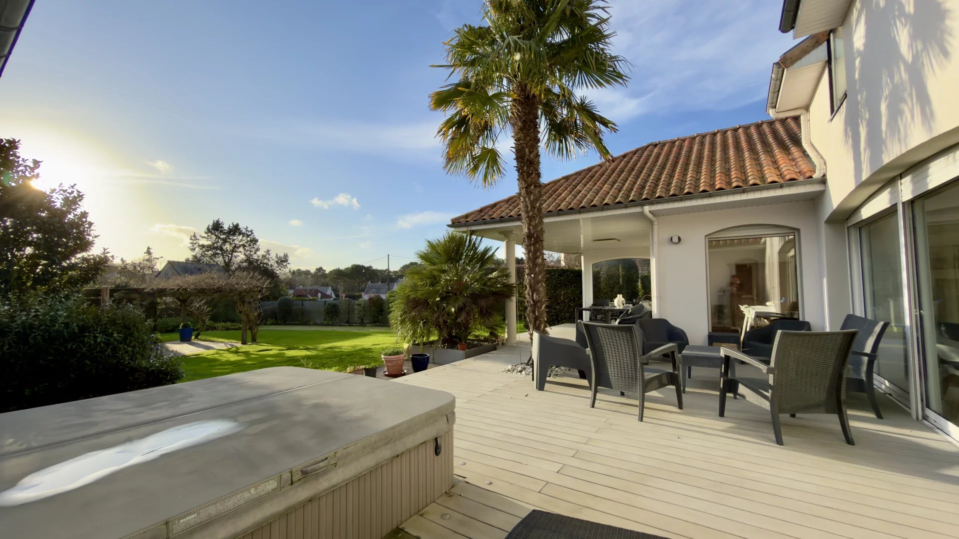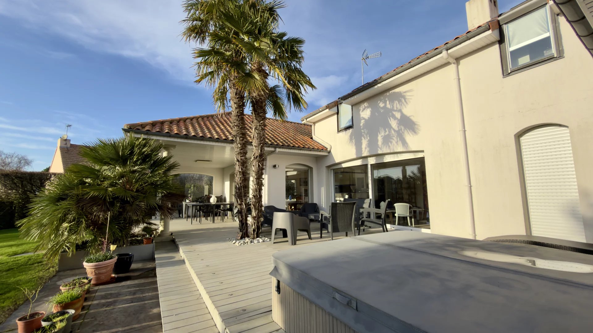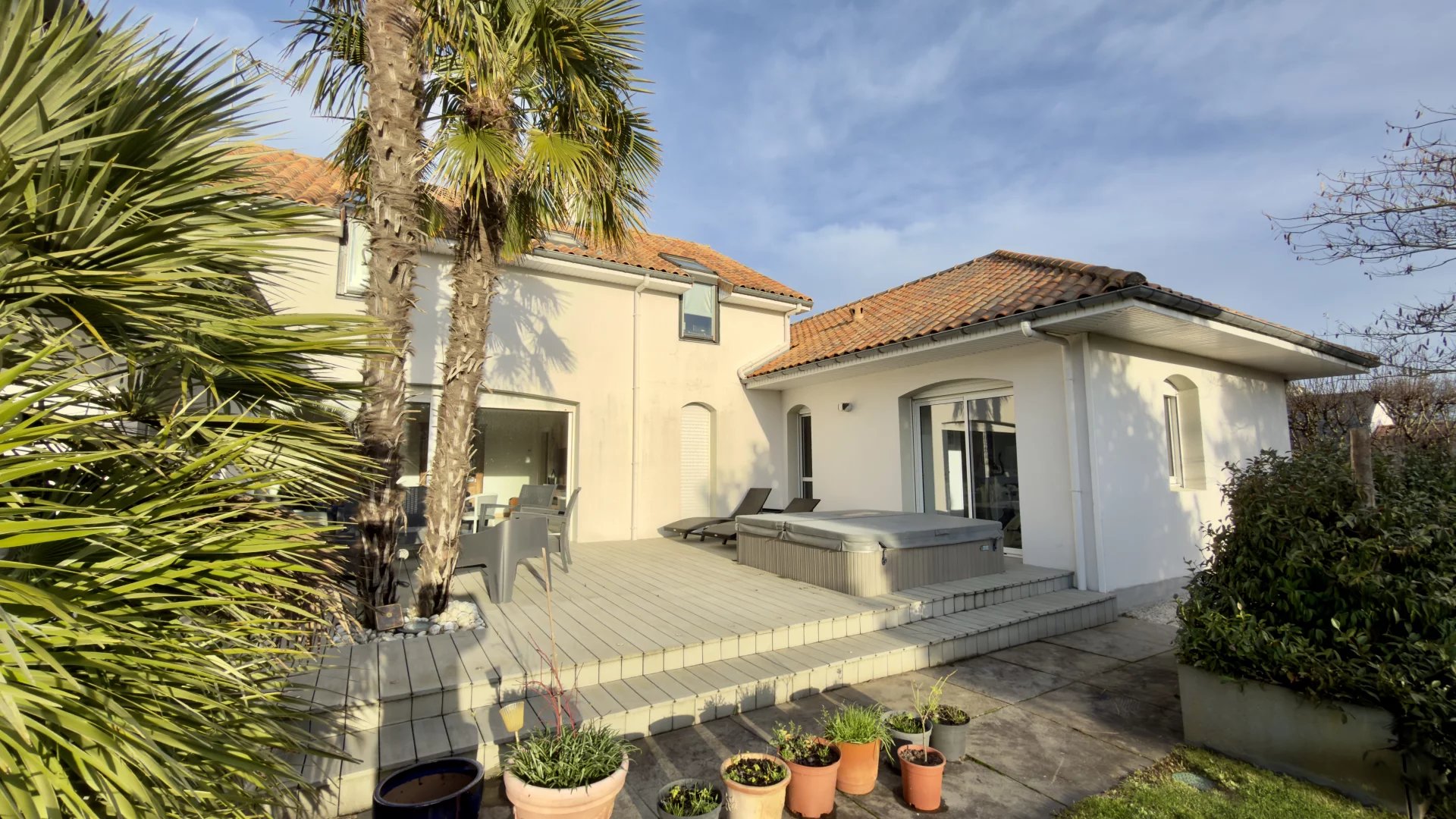 À l’extérieur, vous serez charmés par une parcelle d’environ 1350 m², piscinable, comprenant un potager, un terrain de pétanque, une belle terrasse avec jacuzzi et un vaste espace de rangement.