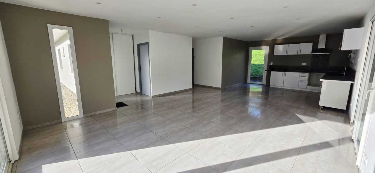 La maison s'organise autour d'une entrée, d'une cuisine ouverte sur sur spacieuse pièce de vie d'environ 45m2, lumineuse, ouvrant sur l'extérieur grâce à deux grandes baies vitrées, dont une baie à galandage, offrant une belle continuité entre l'intérieur et l'extérieur et une vue dégagée sur la nature environnante.
