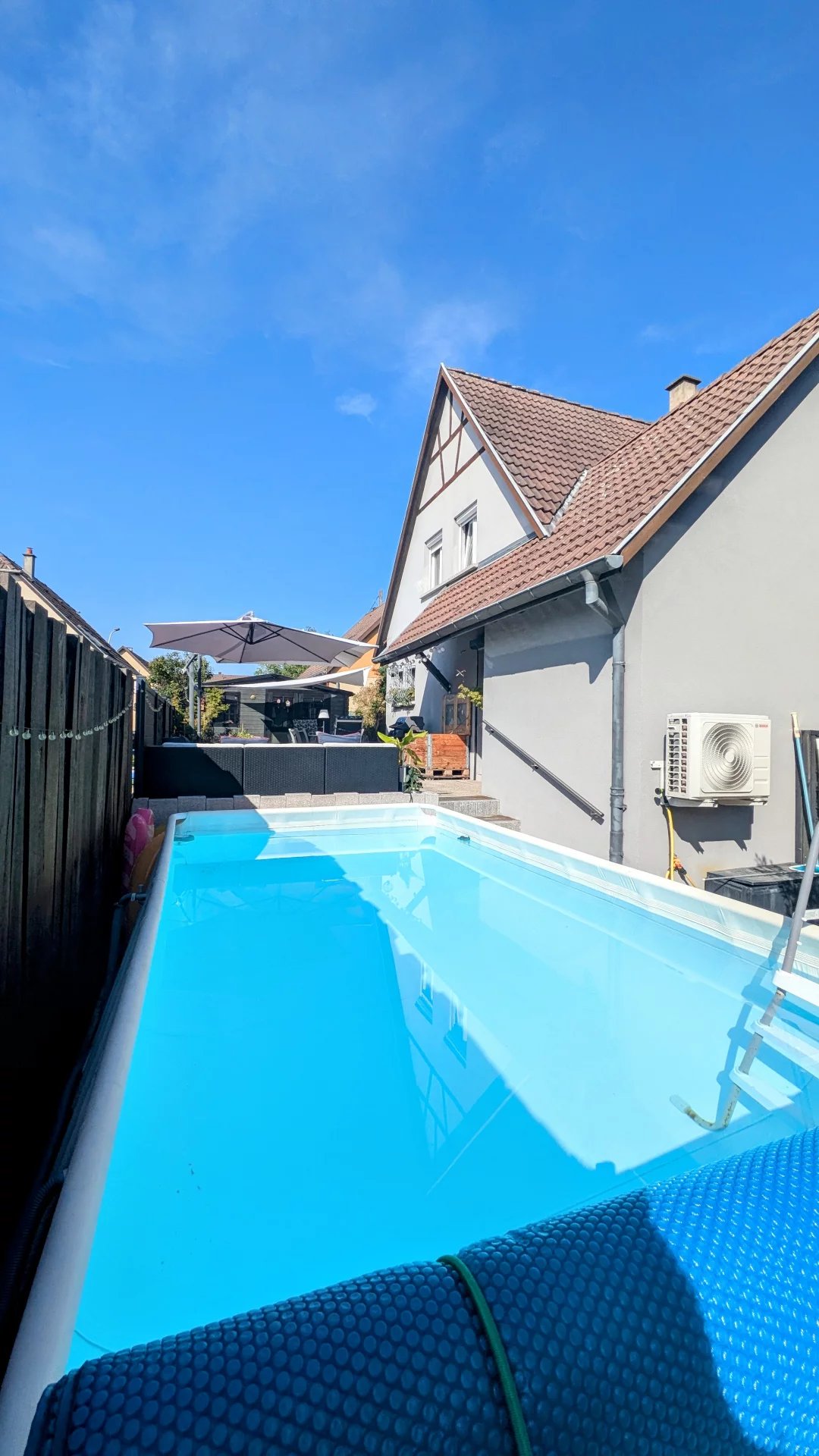 À vendre : maison de 105m² sur un terrain de 410 m². Comprenant : une entrée avec armoire et WC, un double séjour avec un poêle à granulés, une cuisine équipée donnant sur une belle terrasse avec piscine et abri de jardin. À l'étage : 3 belles chambres avec climatisation réversible, une salle de bains. Au sous-sol : une salle de jeux, une chambre, une buanderie. À l'extérieur : un jardin arboré, une grande terrasse, une piscine, un abri de jardin, une cabane pour enfants, un garage, un portail électrique. Points forts de la maison : aucun travaux à prévoir, parfait pour une famille, climatisation réversible, DPE C. Idéalement située à Kingersheim, près de toutes commodités, à 10 minutes des écoles. Venez vite visiter cette jolie maison ! Votre agent commercial de proximité RSAC de Mulhouse n° 884 196 999 Simon Marc