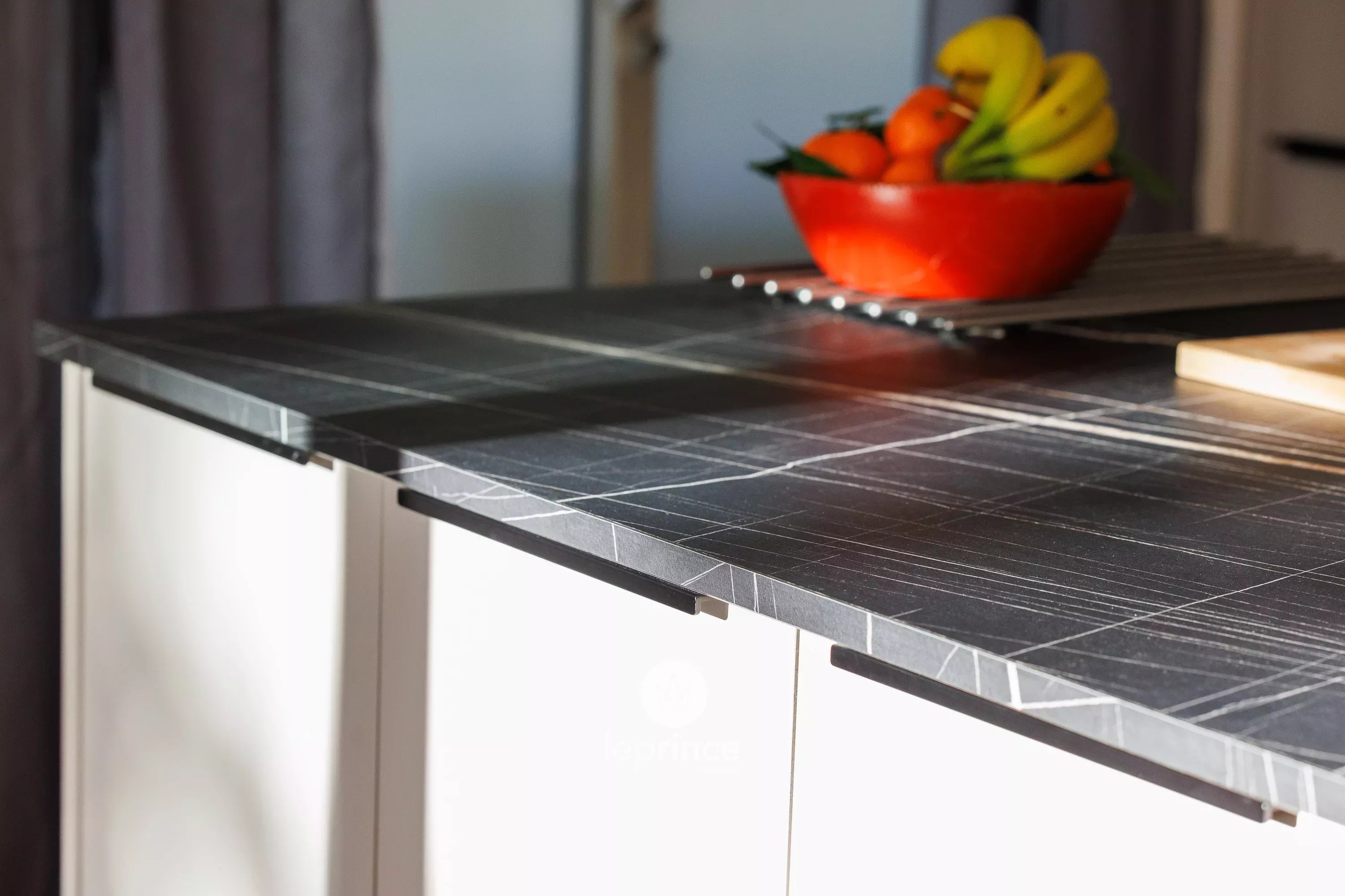 La cucina attrezzata e arredata con isola centrale si integra perfettamente con lo spazio giorno.
