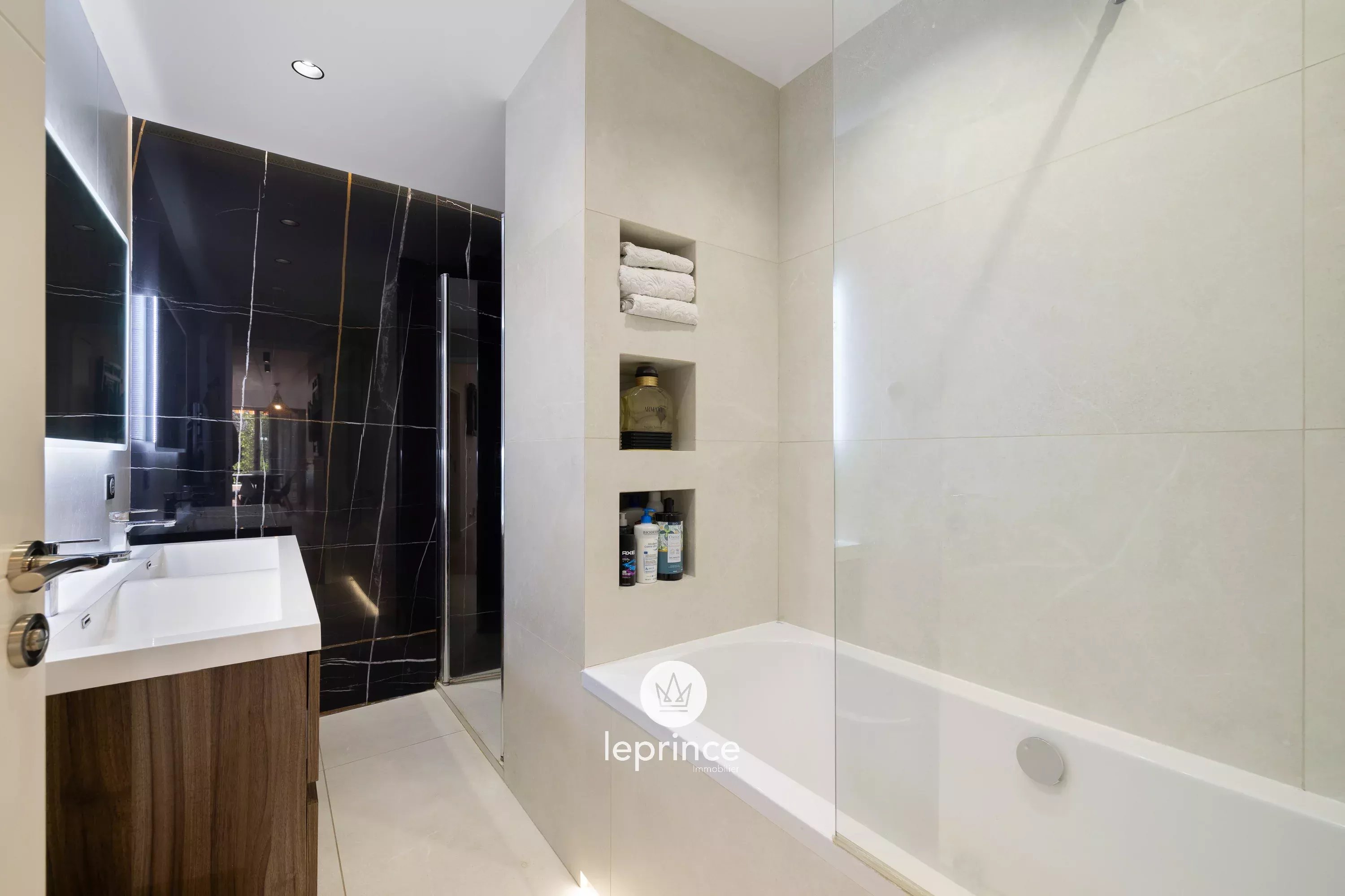 Il bagno dispone di doppio lavabo, vasca da bagno e doccia a filo pavimento, per un comfort ottimale.