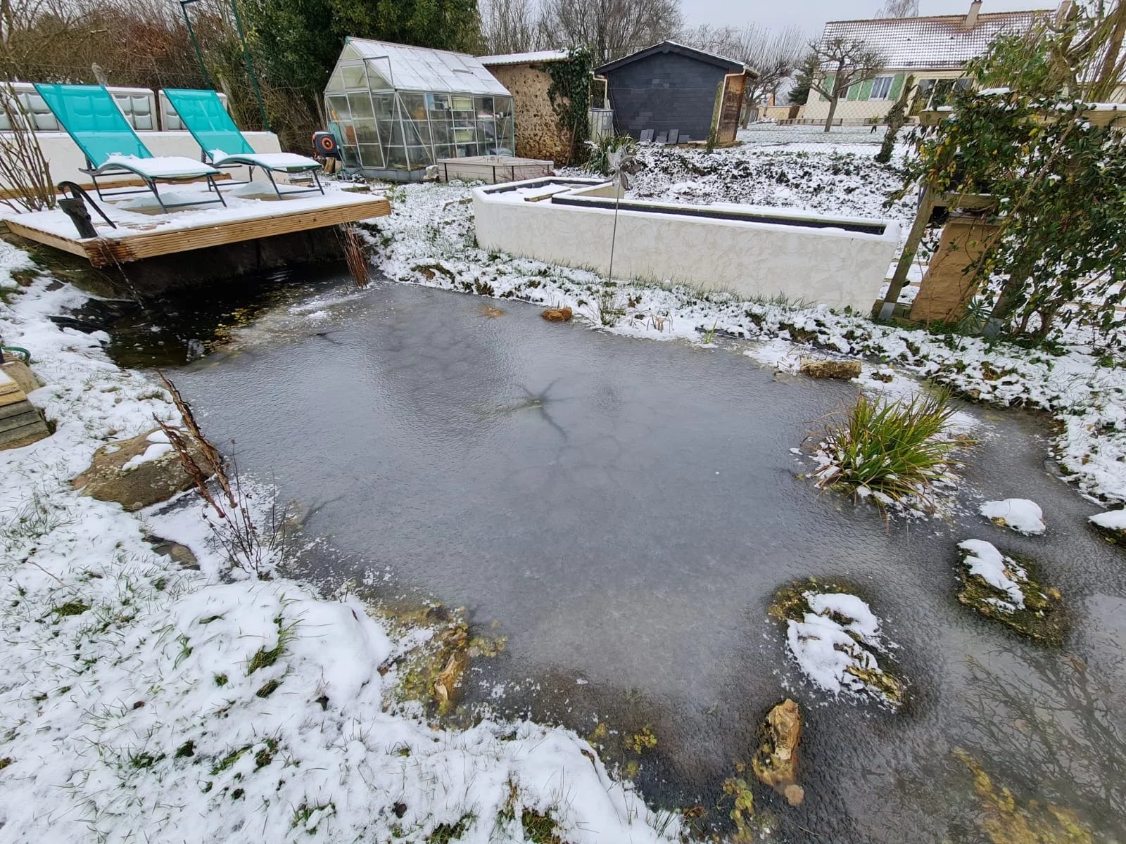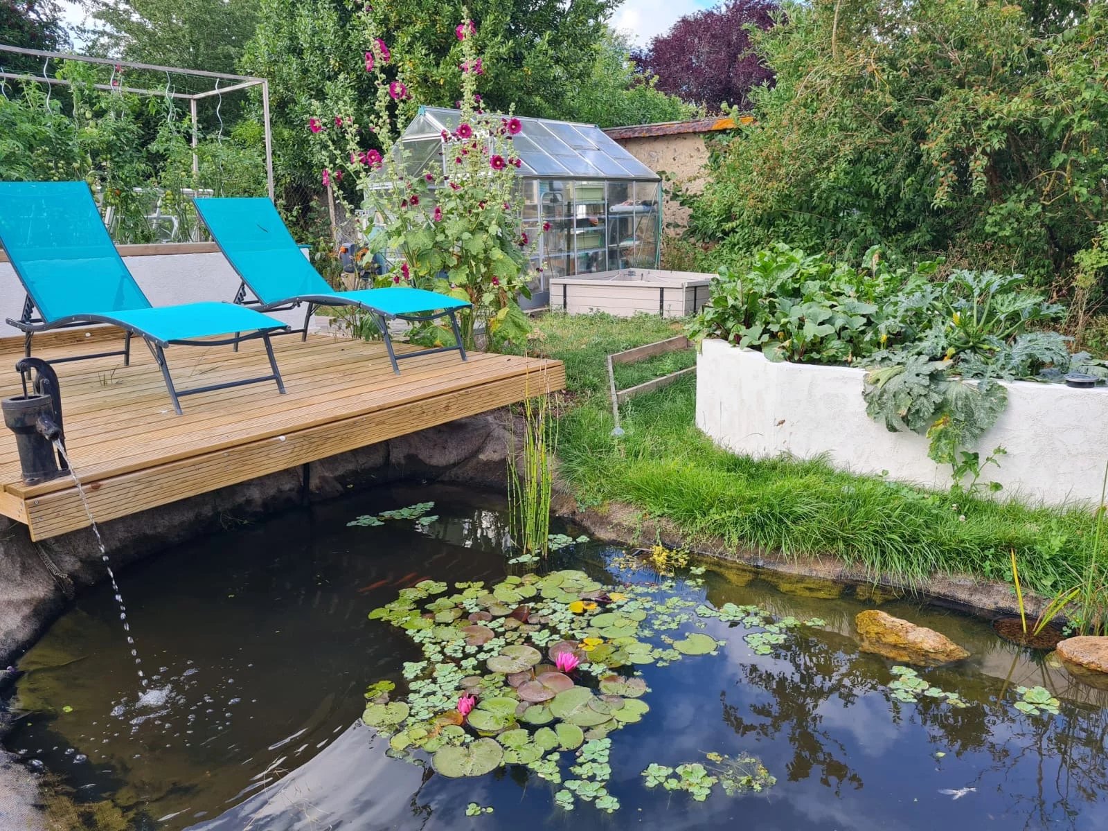 Le jardin entièrement clos de 2000 m a été aménagé de façon très agréable: d'un côté un espace jeux (terrain de pétanque et cabane construite dans un épais noyer) et repas (avec tonnelle pour se protéger du soleil en été, en famille et entre amis; barbecue et four à pizza) et de l'autre un joli bassin avec petite terrasse ensoleillée, potagers suspendus et poulailler.