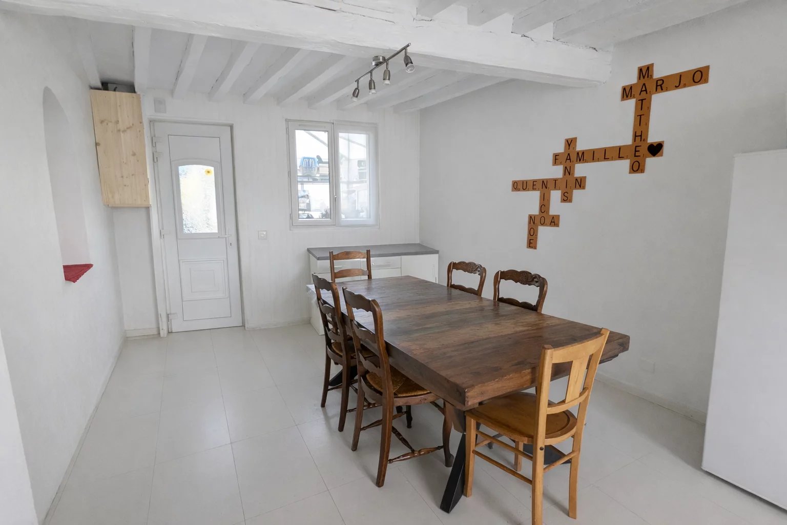 Rez-de-chaussée : entrée par véranda, séjour chaleureux équipé d’un poêle à bois, salle à manger avec cuisine aménagée, WC.