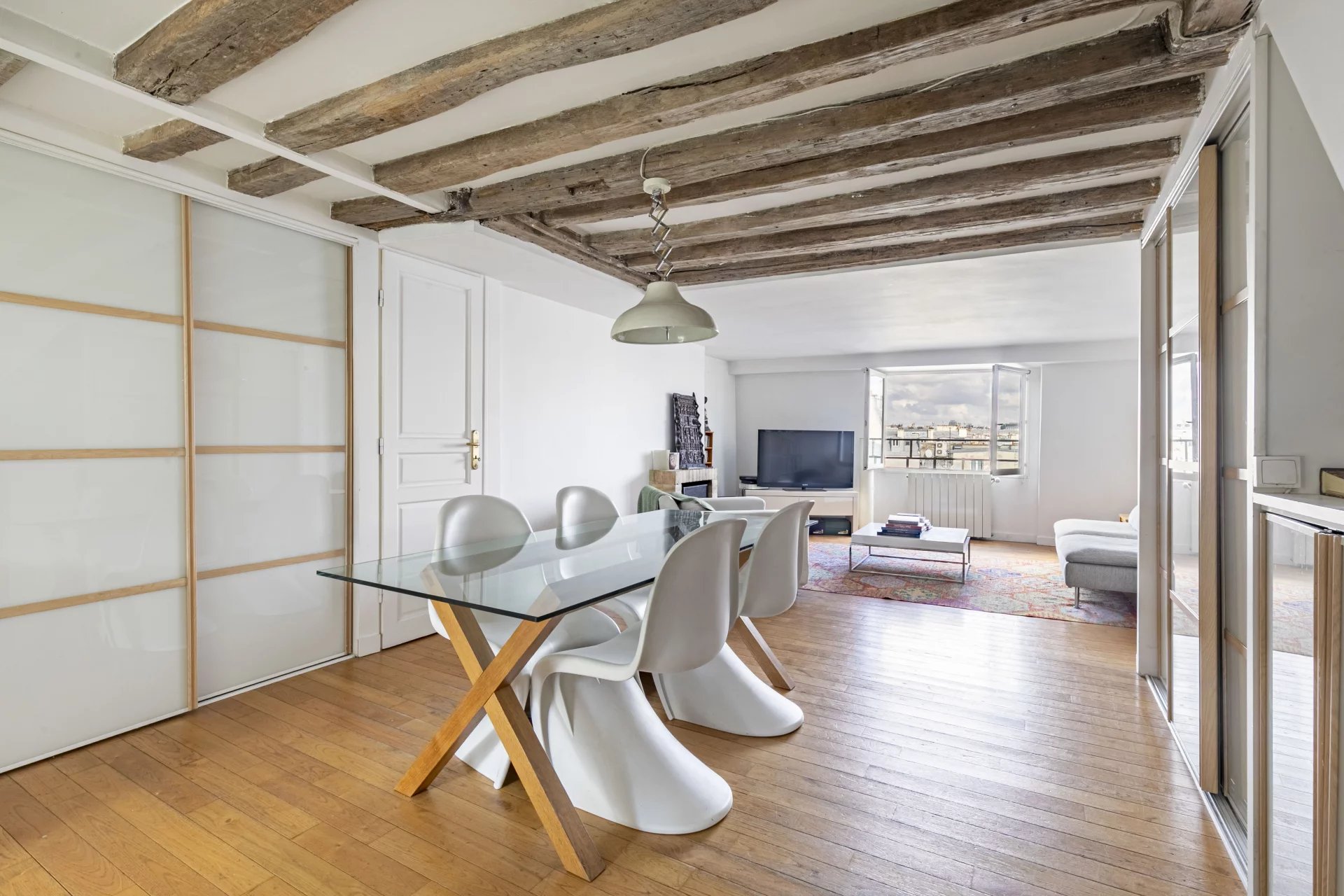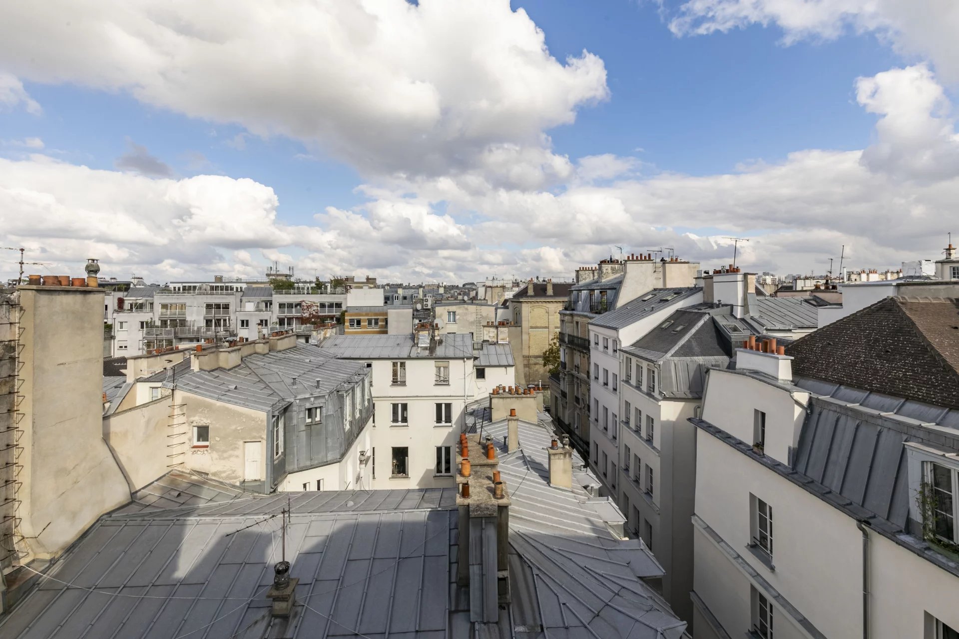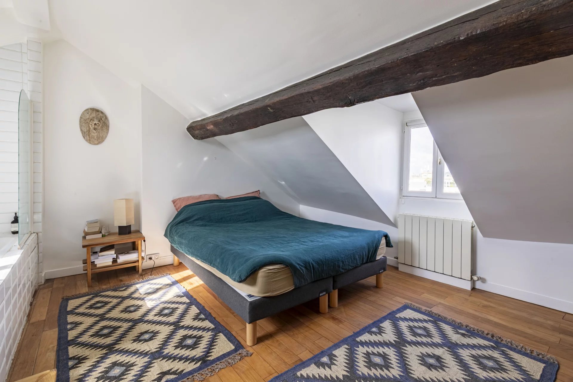 ESCLUSIVO Nel cuore di rue des Gravilliers, al 6° e ultimo piano (senza ascensore) di un edificio del XVII secolo con spazi comuni rinnovati, questo appartamento atipico con tutto il fascino di Parigi, con una superficie di 64 m2 (57,38 m2 Carrez), è esposto a sud e a nord con vista ininterrotta sui tetti di Parigi, sul Sacro Cuore e sul Beaubourg. Questa vetrina luminosa è composta da un ingresso con doccia e servizi igienici, un ampio soggiorno con cucina a vista, inondato di luce e con flusso passante; sopra, una grande camera da letto con bagno a vista e servizi igienici.