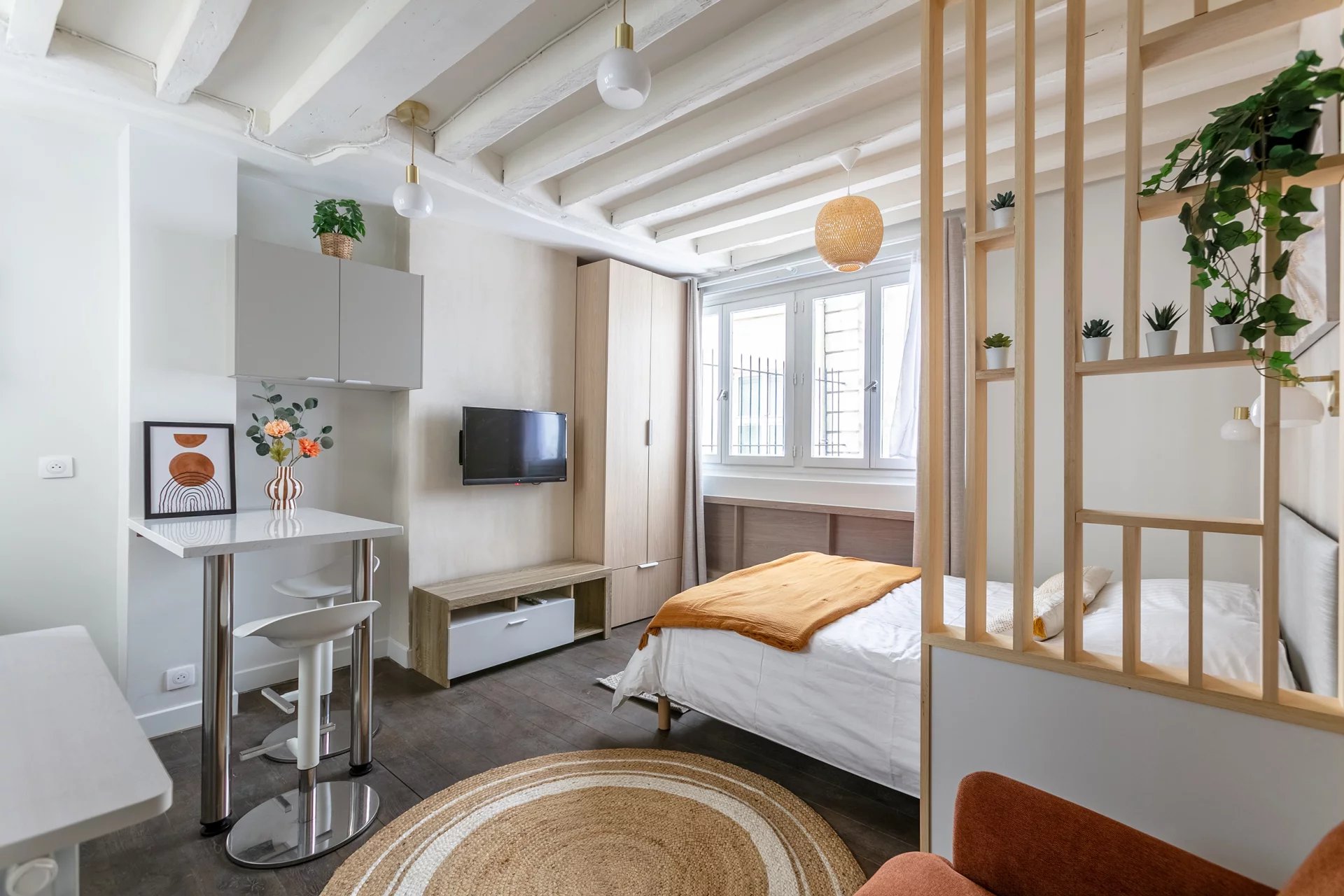 Al 3° piano di un edificio del XVIII secolo in rue du temple, questo monolocale di 18,70 m2 è stato progettato e completamente ristrutturato come una suite d'albergo, con comfort, isolamento e aggiornamenti elettrici... Venduto arredato e attrezzato se necessario, non vi resta che posare le valigie.