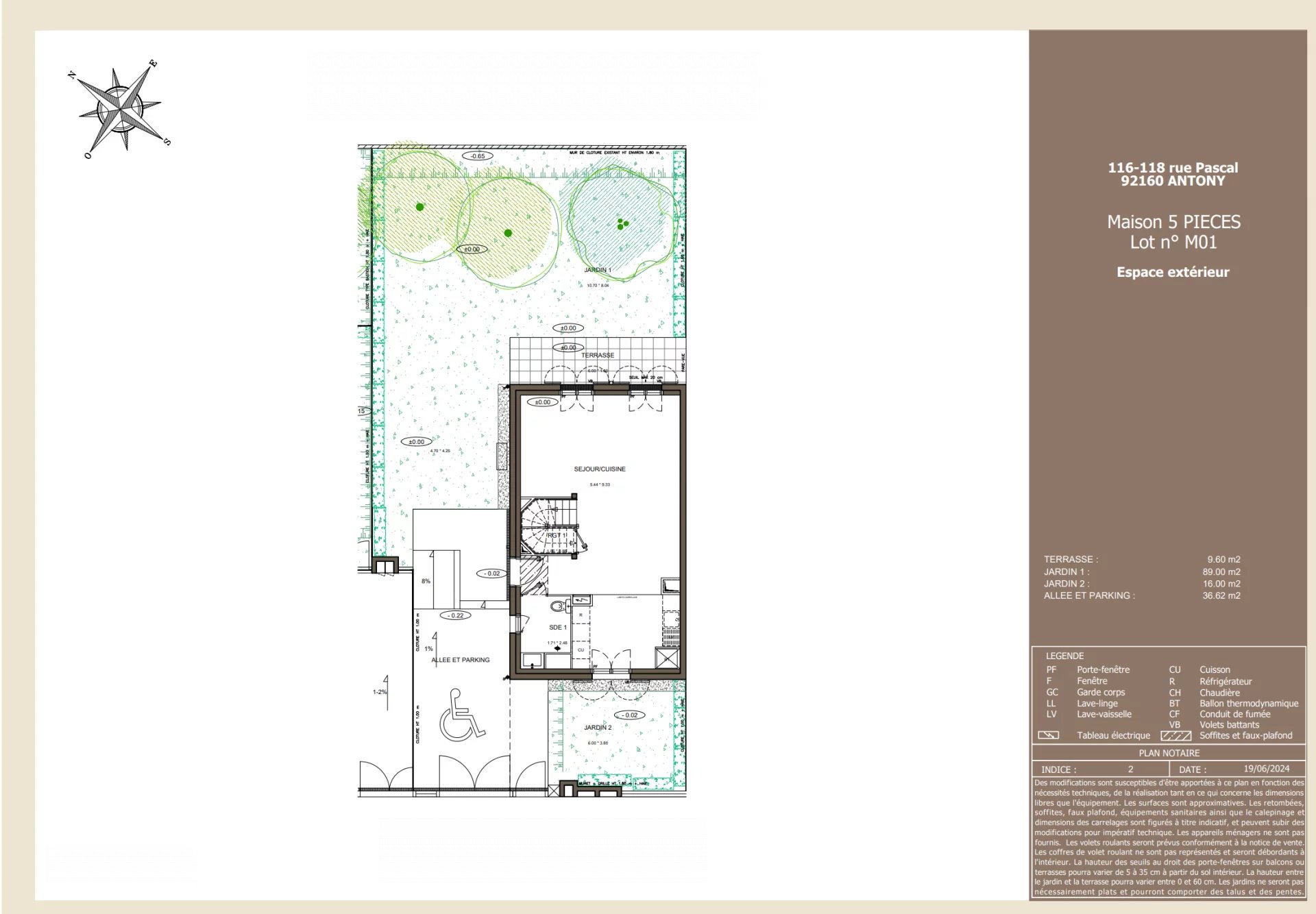 Au rez de chaussée : un séjour/cuisine de 41,76m2, d'une salle d'eau de 3,75m2. Un grand espace extérieur - une terrasse de 9,60m, et de deux jardins un de 89m2 et le second de 16m2.