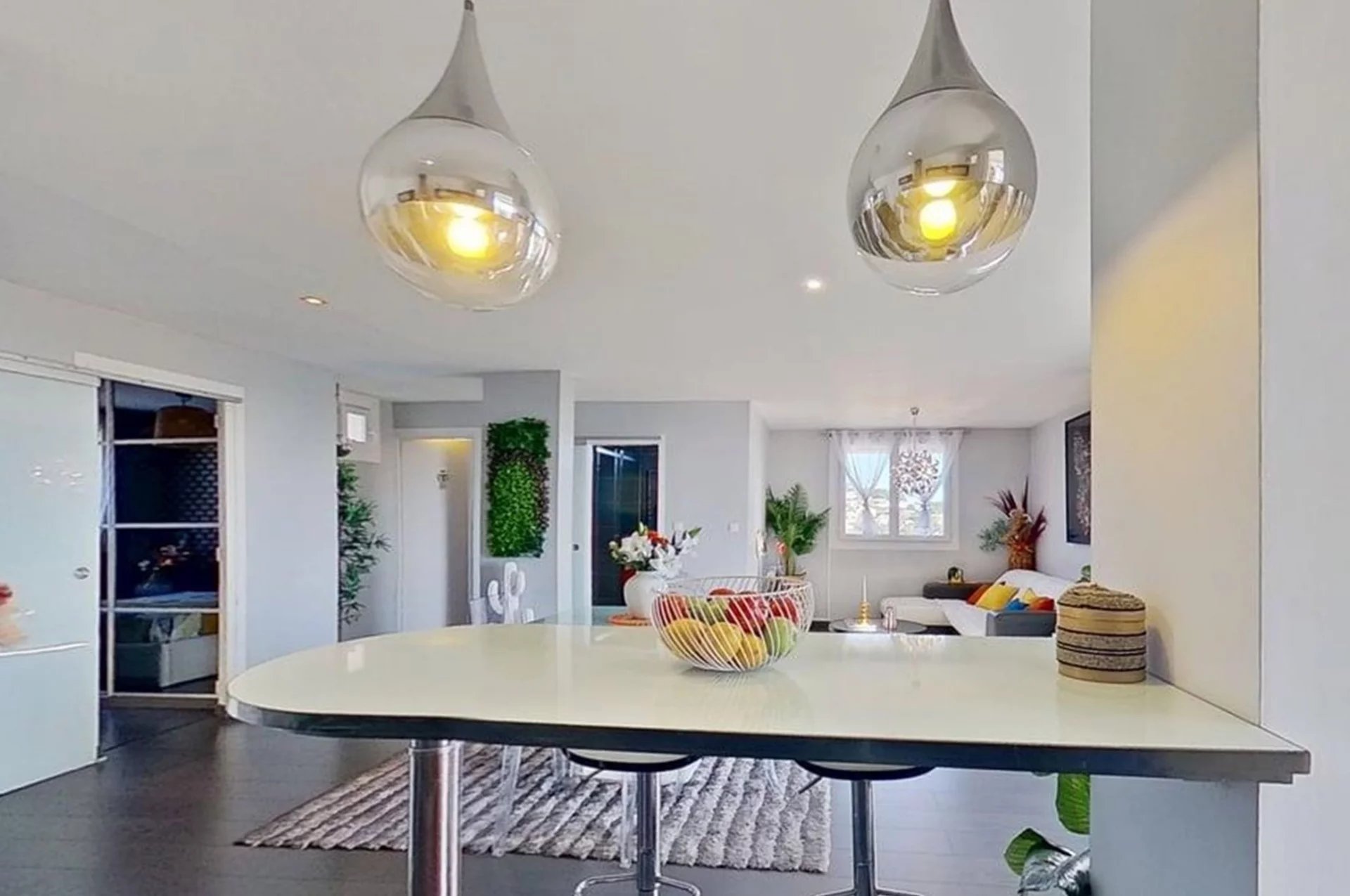 La cuisine ouverte, aménagée et équipée, s’intègre parfaitement à l’espace de vie et favorise la convivialité.