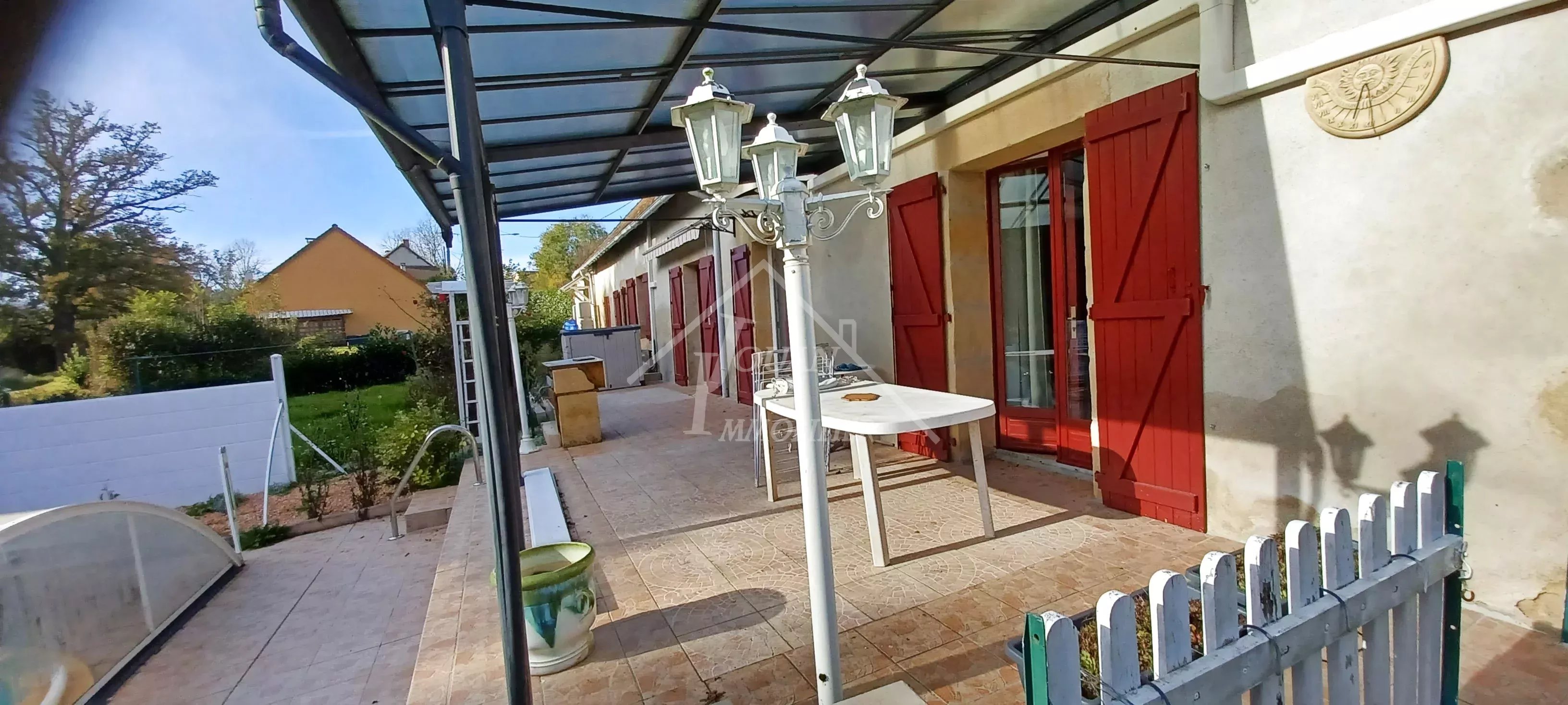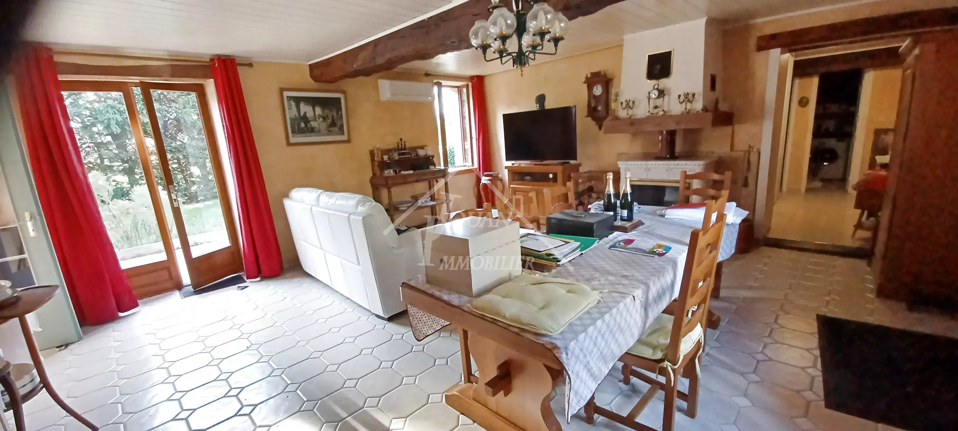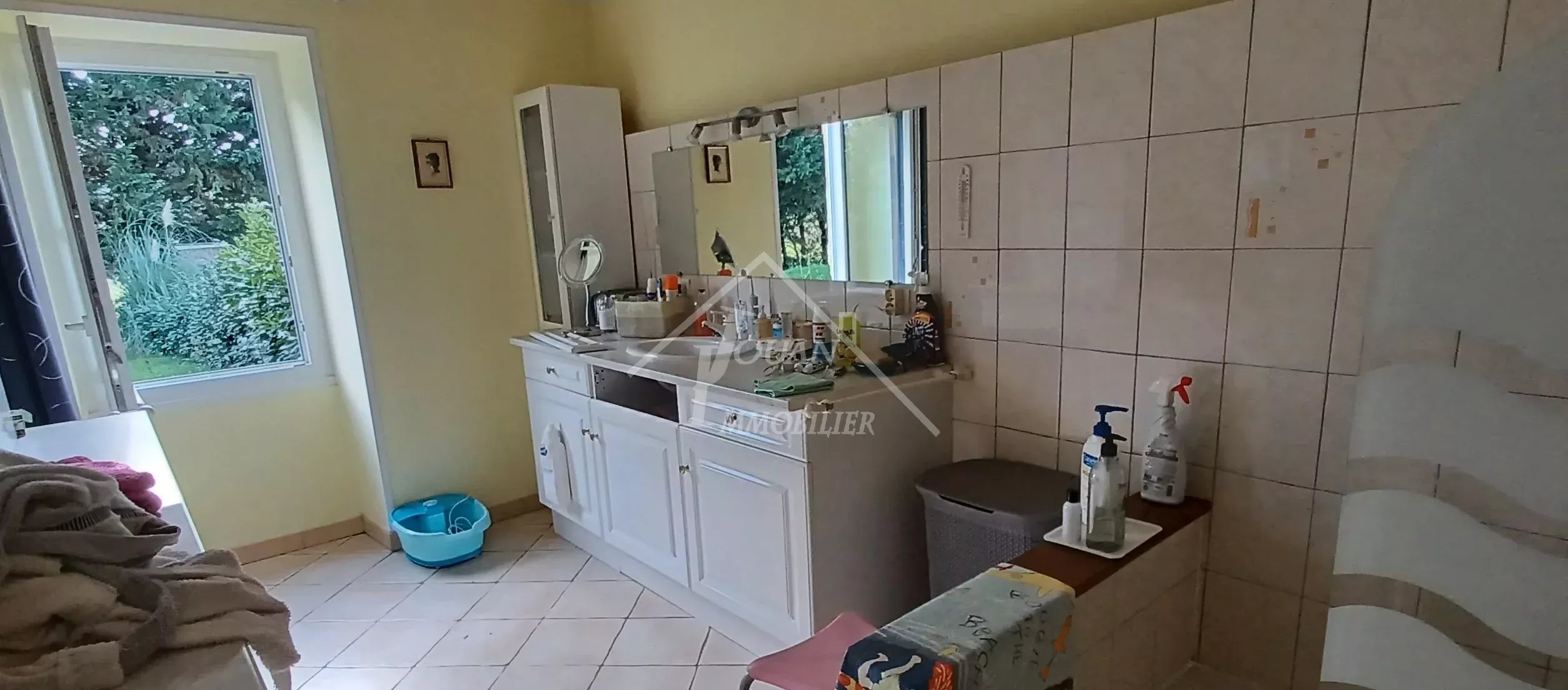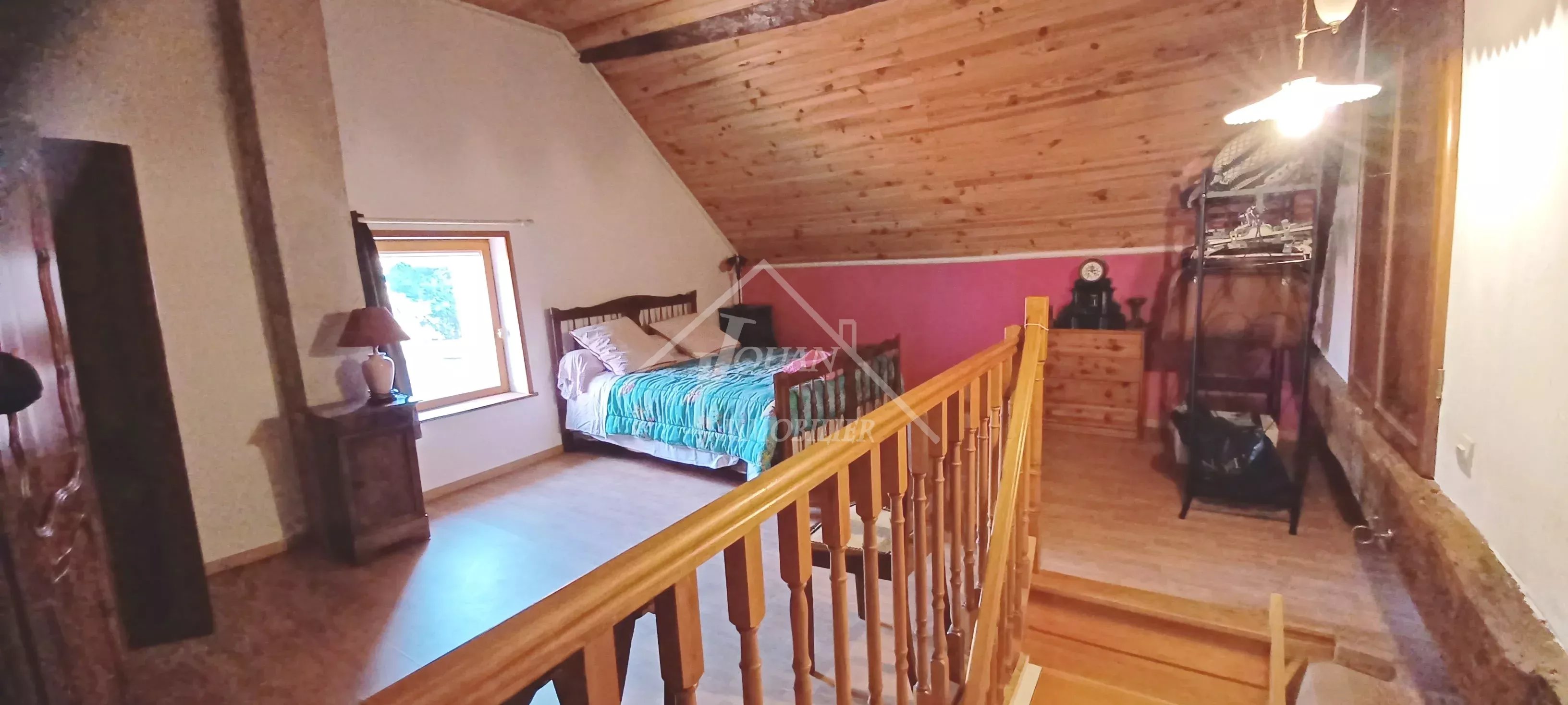 Longère de plain-pied composée d'un grand salon-séjour traversant avec poêle alsacien et ouvrant sur terrasse et jardin plein SUD ; une chambre, grande salle de bains, toilettes avec coin buanderie. Cuisine aménagée-équipée, salon avec escalier desservant une chambre en étage et grand grenier aménageable. Menuiseries récentes bois et PVC Double vitrage - Charpente et couverture en très bon état. Terrasse, piscine (2013) ovale 8x4 avec plage carrelée, liner, galets de chlore. Dôme ouvrant-basculant sur vérins. Appentis-garage. Petit garage en bois sur dalle, couverture bas acier. Jardin d'environ 850 m² et pré de 4800 m² avec entrée indépendante par un grand portail ; le tout entièrement clos. Village avec école, boulangerie, restaurant. Magnifique environnement de bocage et forêts. A 20 minutes Moulins