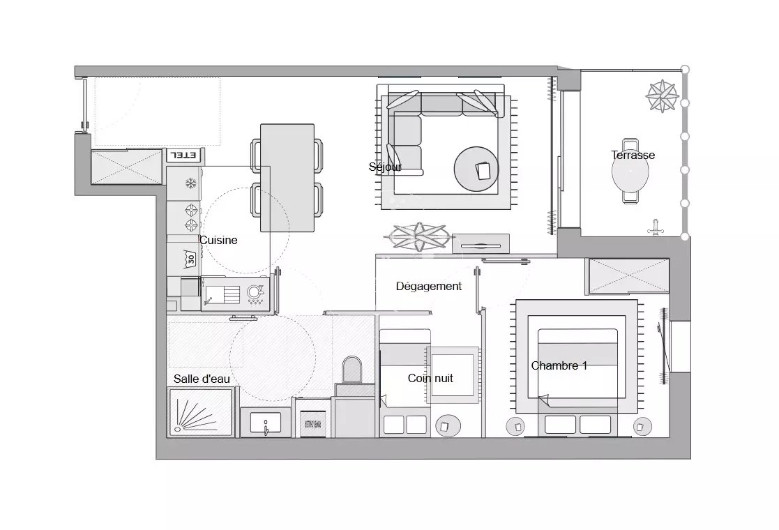 Situé au 1er étage de la résidence Luminescence, T2 cabine de 49,37m² composé de :