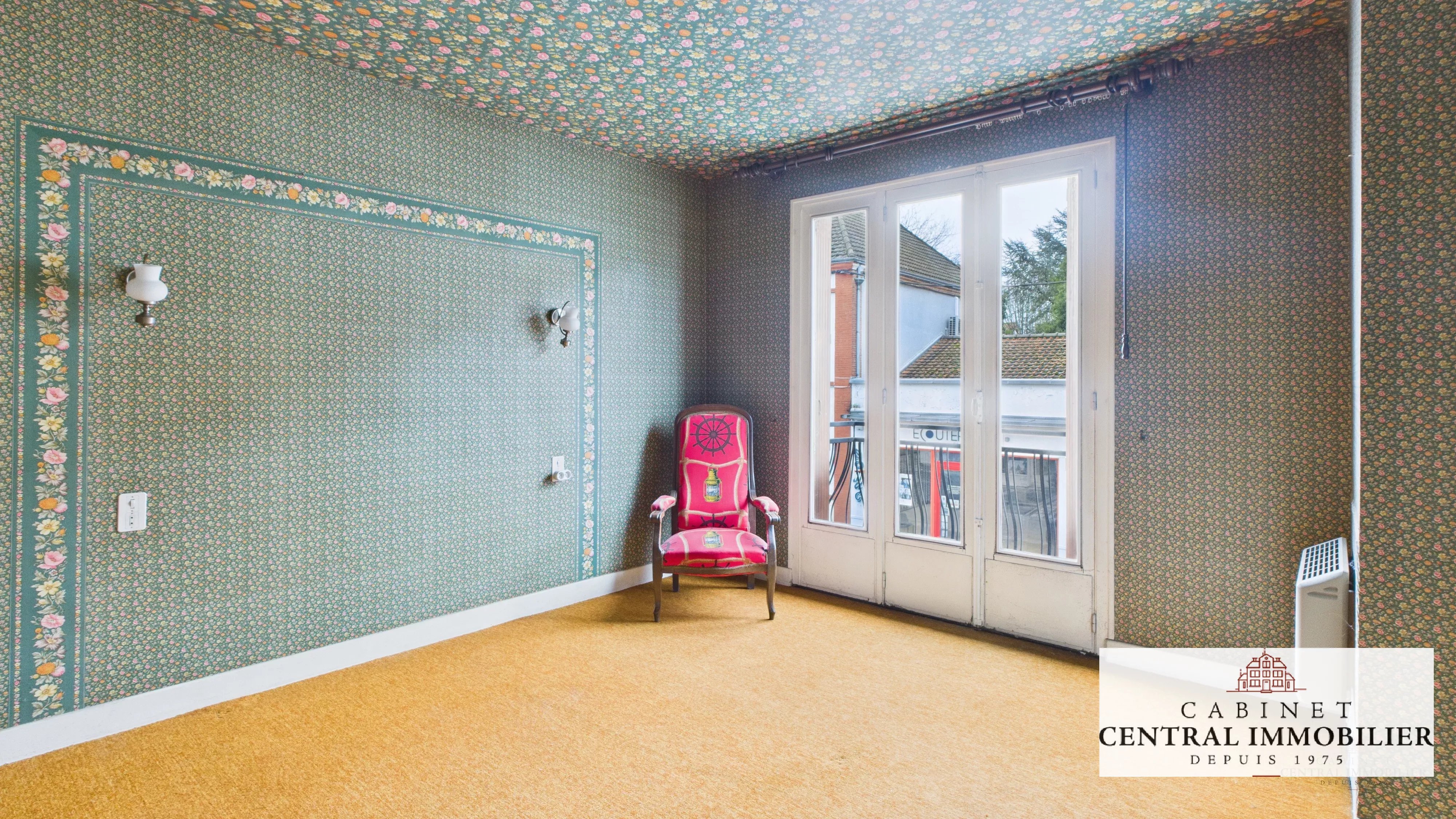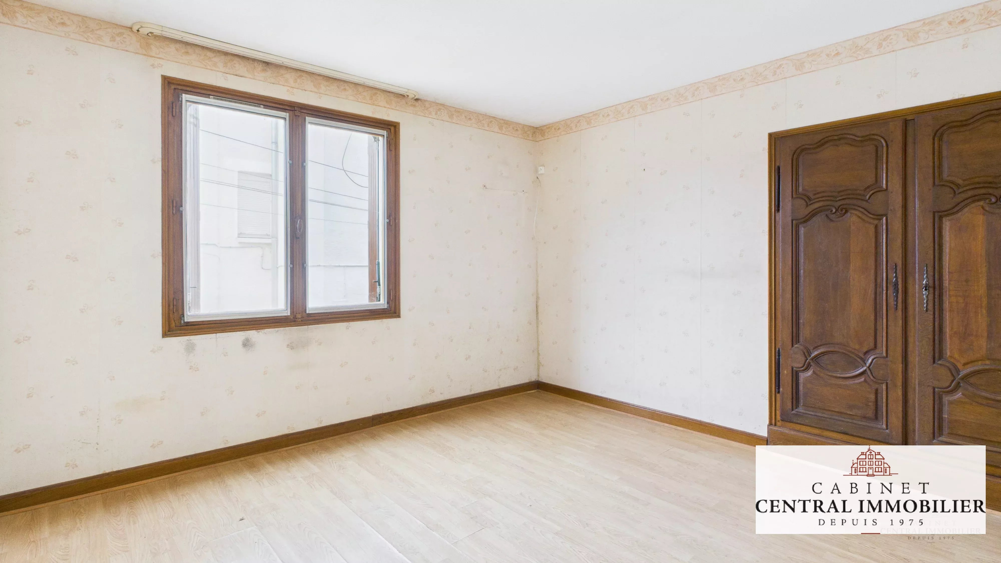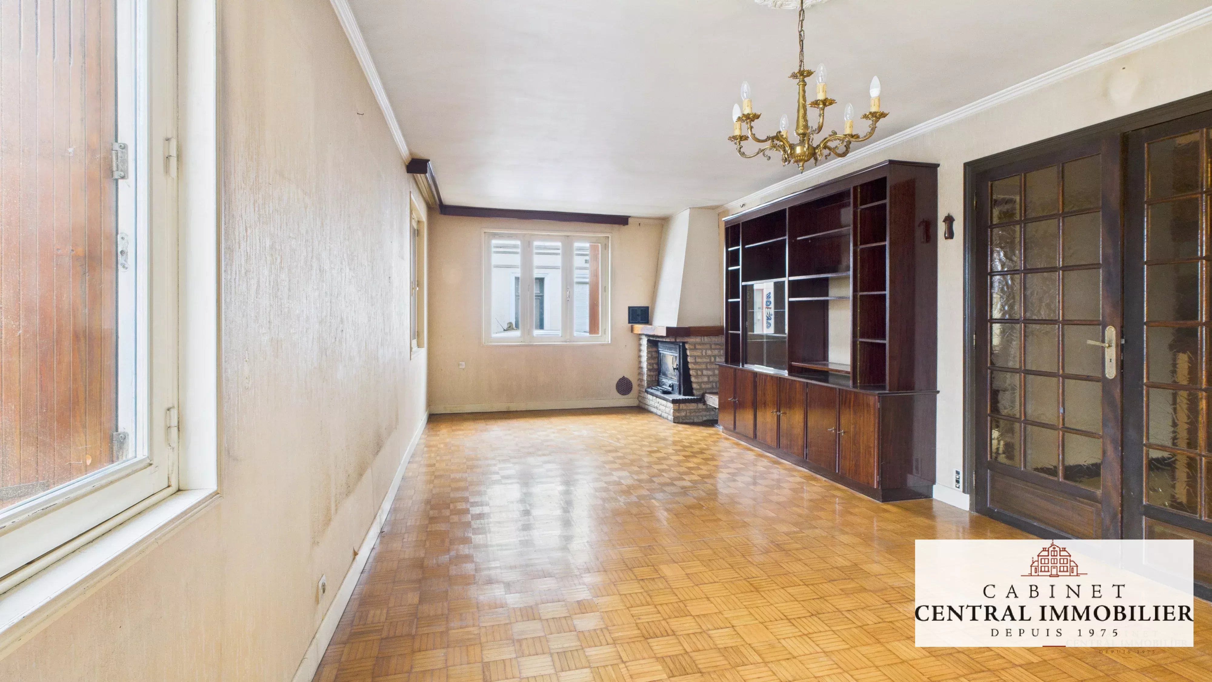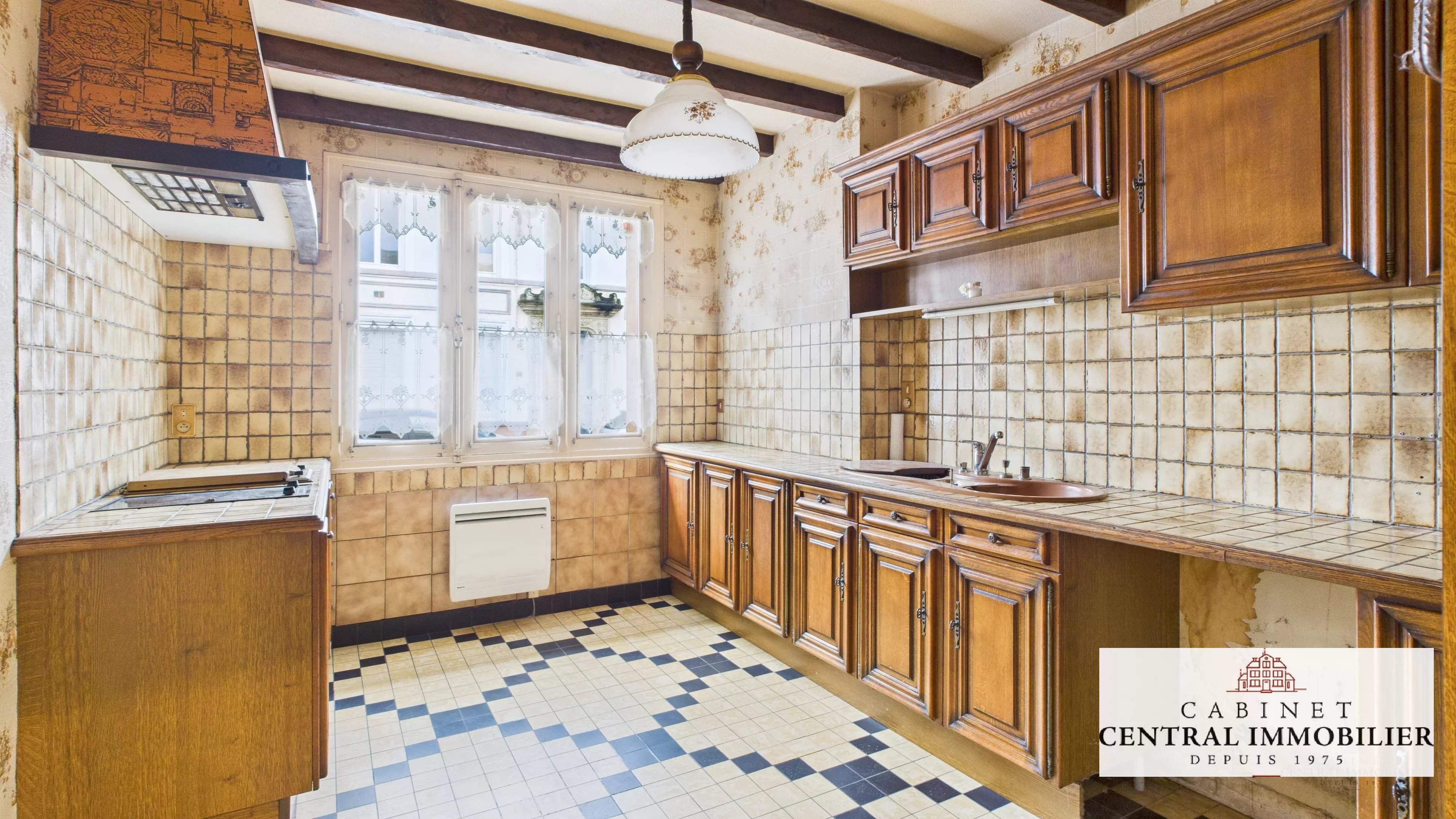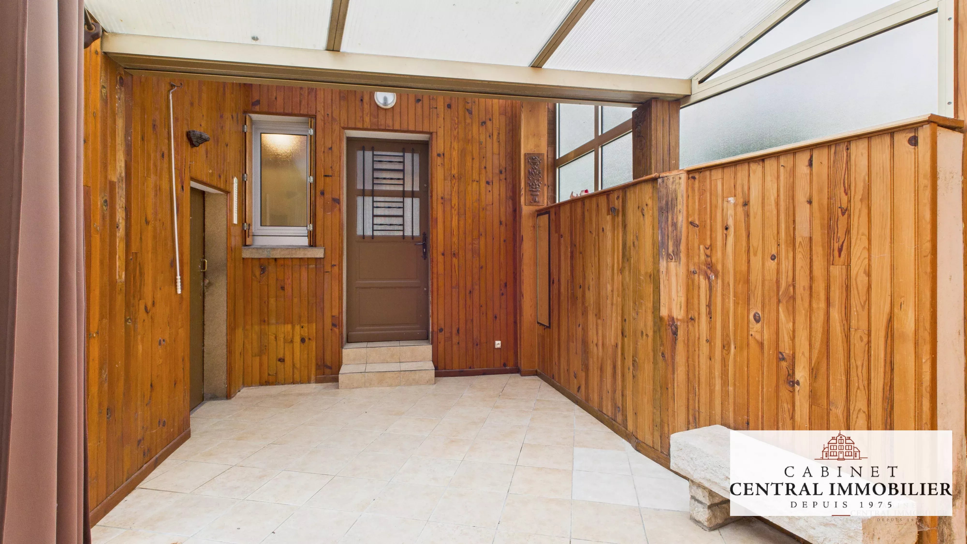 Maison comprenant : entrée arrière par véranda carrelée de 14.47m², couloir carrelé avec une deuxième entrée côté rue, cuisine aménagée carrelée de 12m², séjour parqueté de 29.71m² avec cheminée insert, dégagement avec placards, salle d'eau carrelée de 3.73m², WC carrelé. À l'étage : palier, WC 2.93m² avec lave mains, débarras avec rangements, 3 chambres de 11.90m²/13.75m² et 13.94m² dont 2 avec placards. Cave avec atelier et coin buanderie. Garage. Chauffage électrique avec possibilité de gaz de ville. Double vitrage et survitrage. Cour.