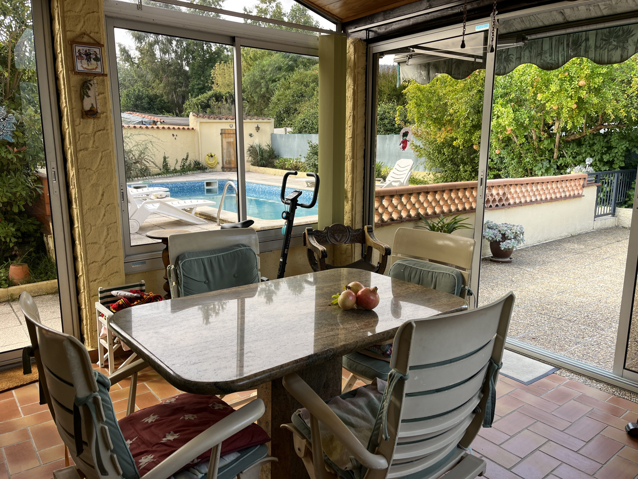 Charmante villa plain-pied de construction traditionnelle sur terrain de 724 m2 à l'arrosage, belle luminosité, vue imprenable sur la montagne.Salon/séjour donnant sur véranda, cuisine indépendante équipée, deux chambres, salle d'eau, 2 WC, Garage et cave. Agréable espace extérieur avec piscine. Combles aménagés en deux chambres. À visiter sans tarder?!