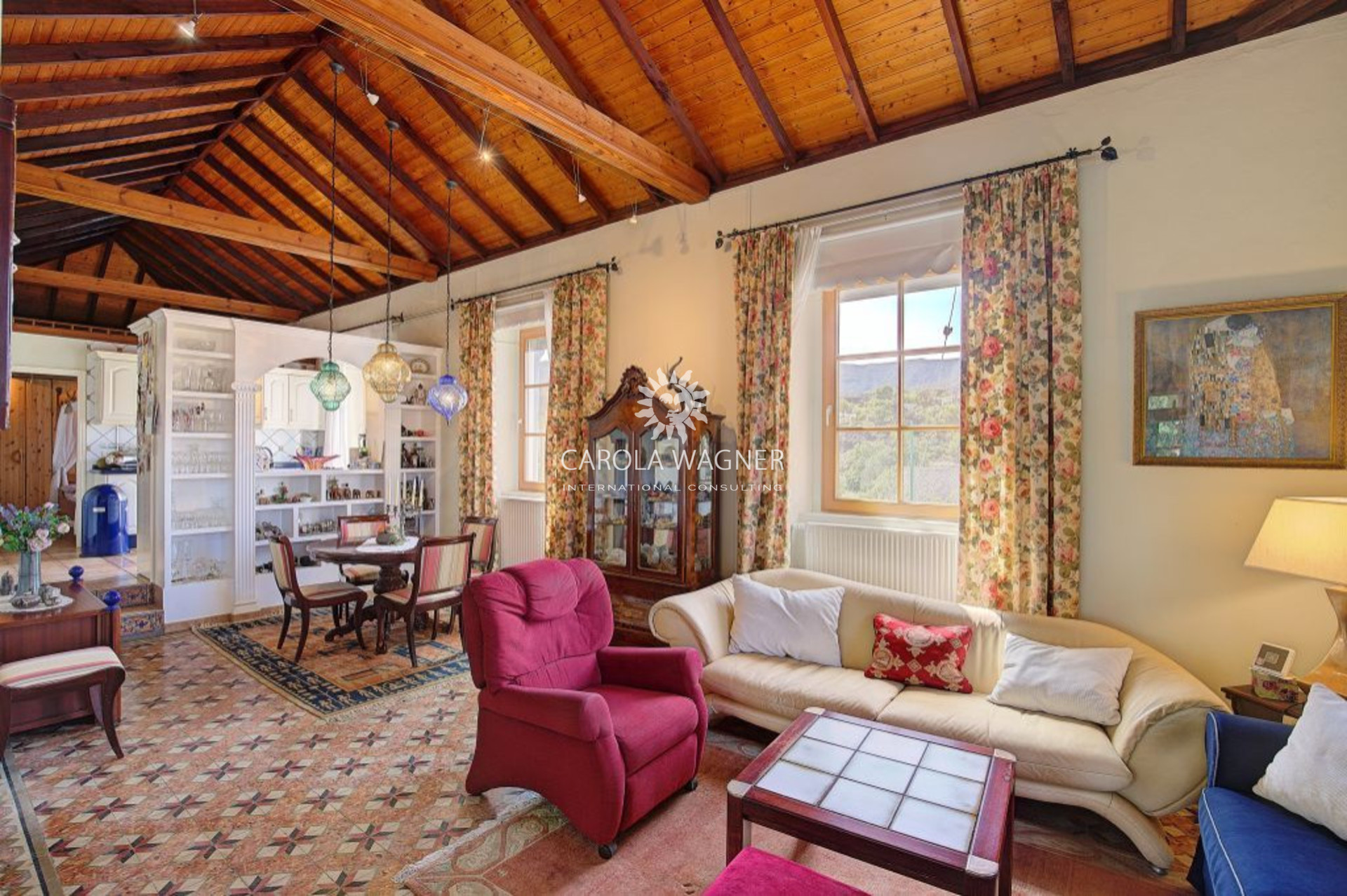 De grands palmiers, Petit contingent d'arbres fruitiers, Massifs à légumes surélevés, entièrement clôt. En bordure du village, au calme. Avec vue sur la mer et les montagnes, Env. 730 m d'altitude