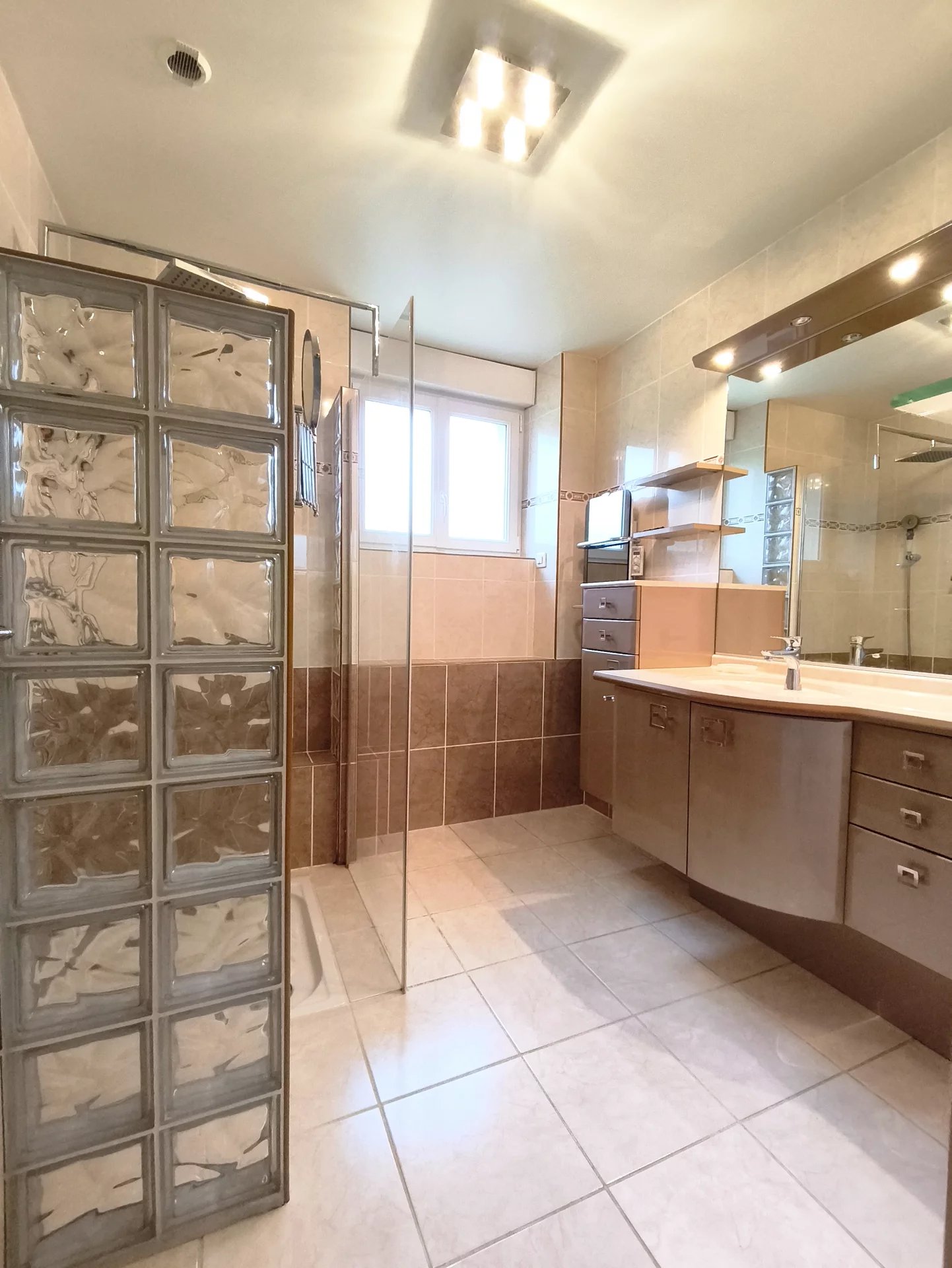 AU 1er étage : deux chambres (dont une avec un grand placard), une salle de bain (avec douche, baignoire et WC), un espace ouvert.