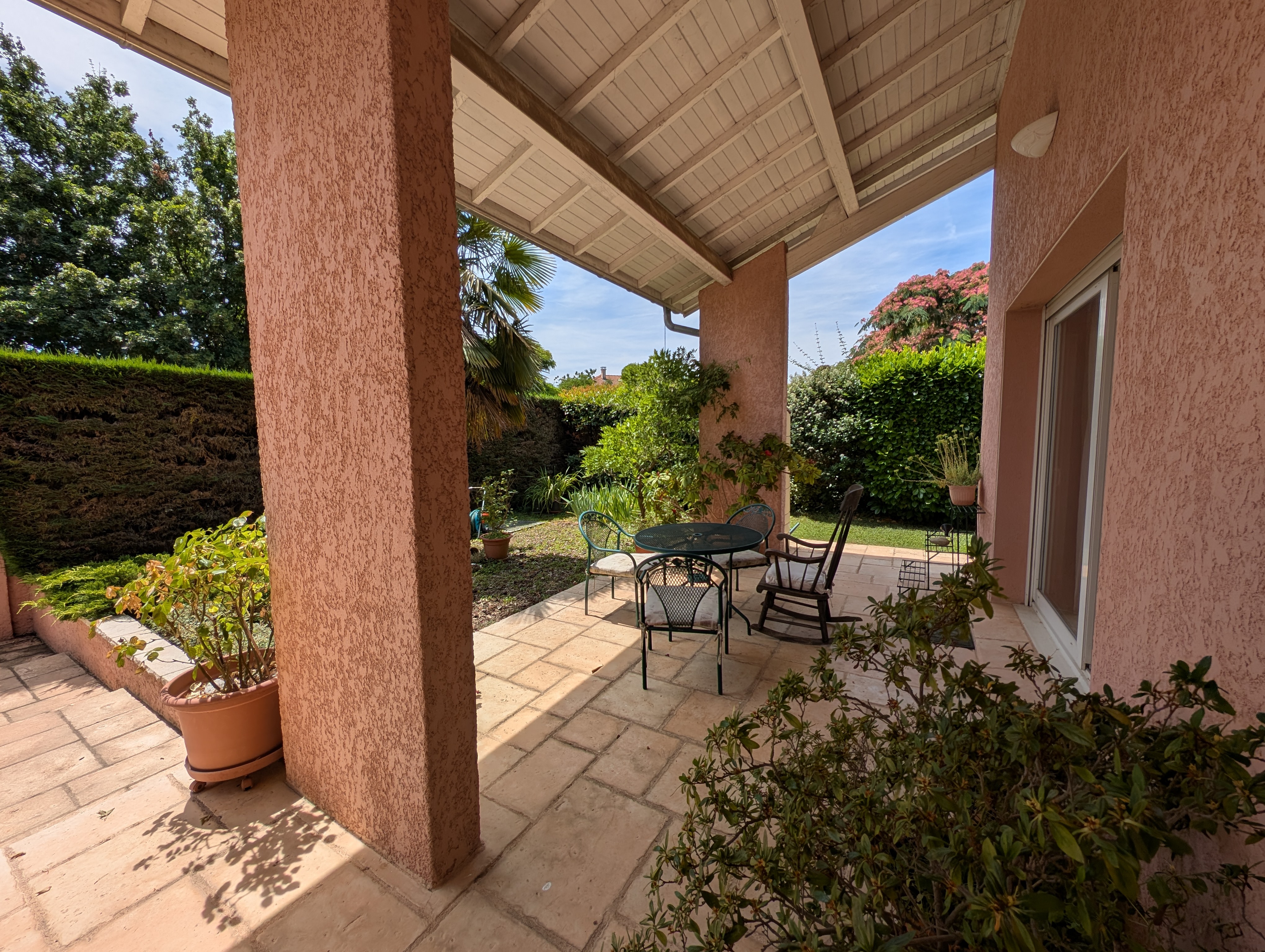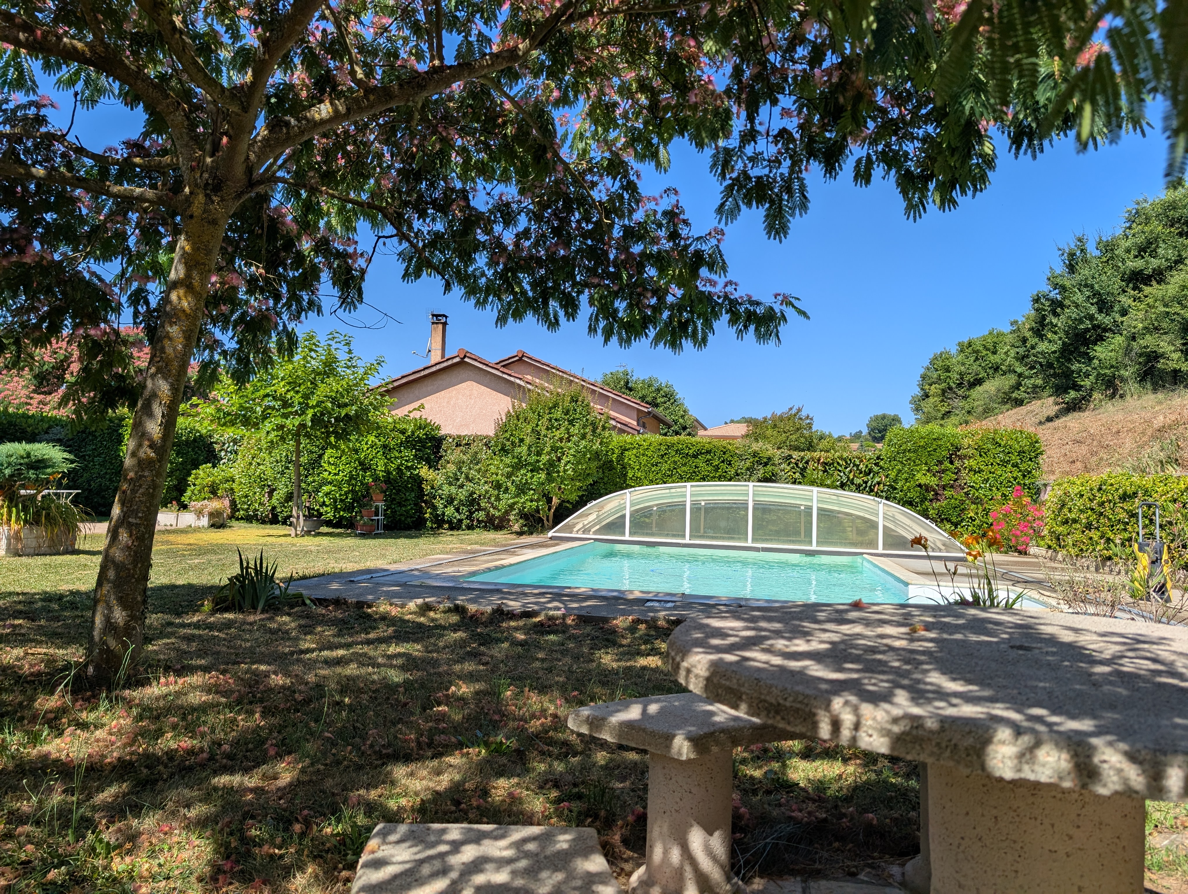 Elle a été bâtie en 1996 de 184 m2 habitables, un garage double, une piscine de 4.5 x 9m avec son dôme, une annexe composée : un coin cuisson, local technique piscine et local rangement.