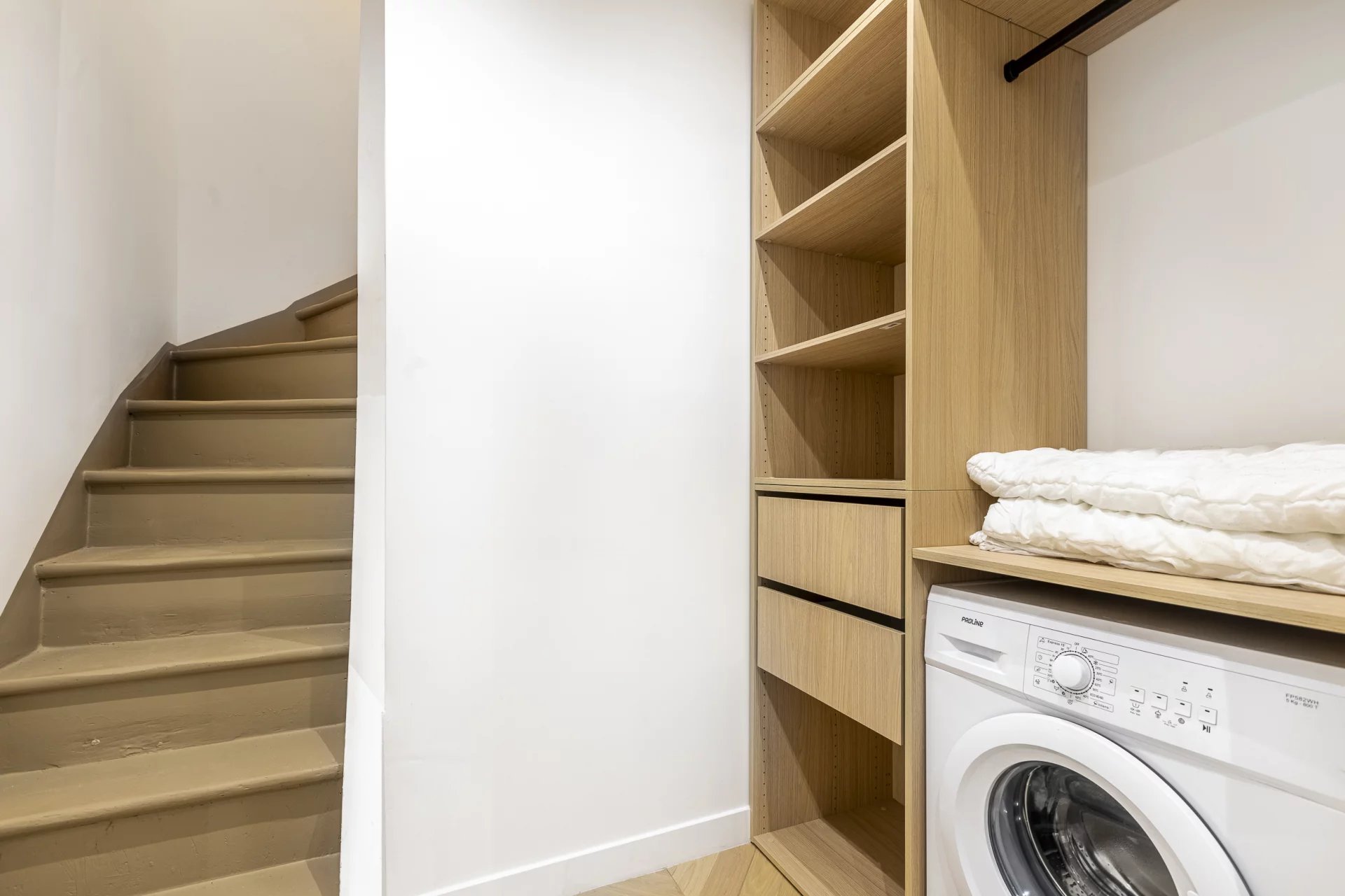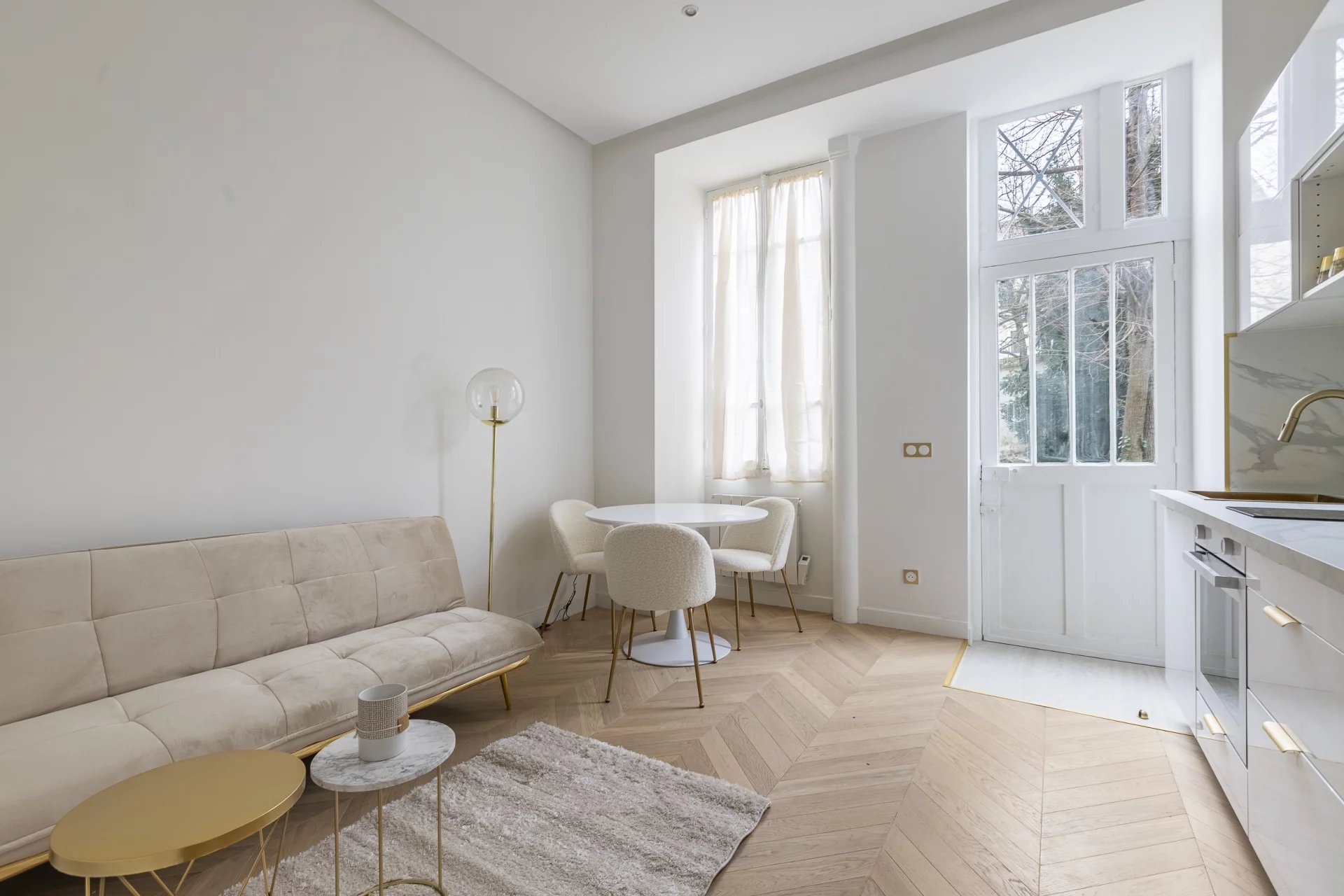 2 pièces refait à neuf avec gout, meublé, entièrement équipé. A noter que les charges comprennent l'électricité. Salon avec canapé-lit, coin nuit avec lit coffre 160cm et télé, cuisine équipée avec plaque de cuisson, réfrigérateur/congélateur, micro-onde, vaisselle et ustensiles de cuisine, linge de maison, salle d'eau et toilettes à l'étage en dessous, rangements, machine à laver.