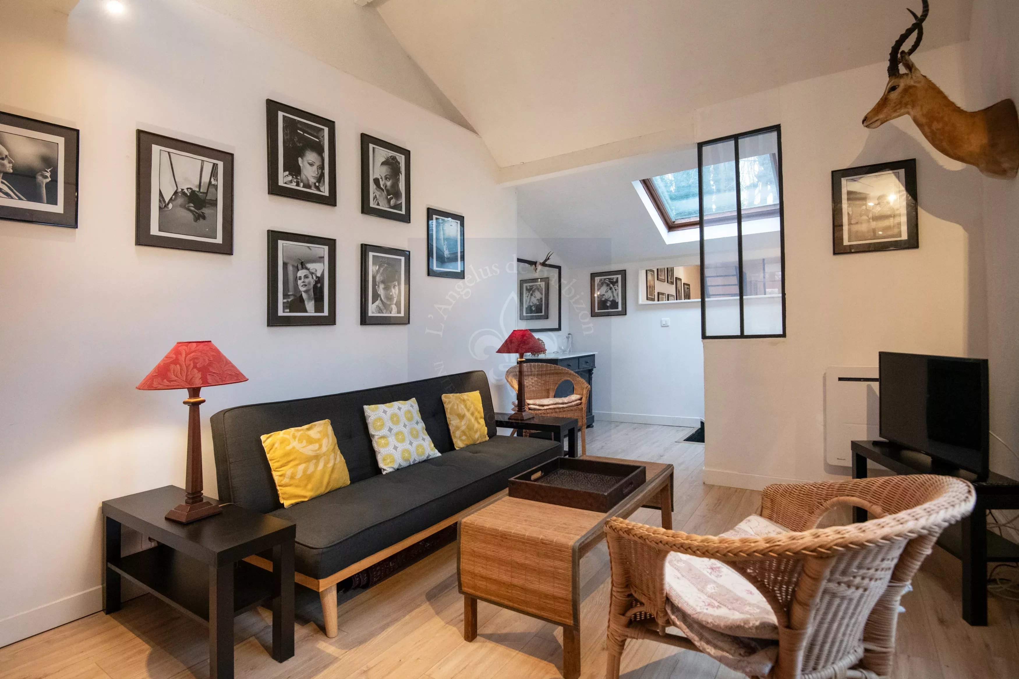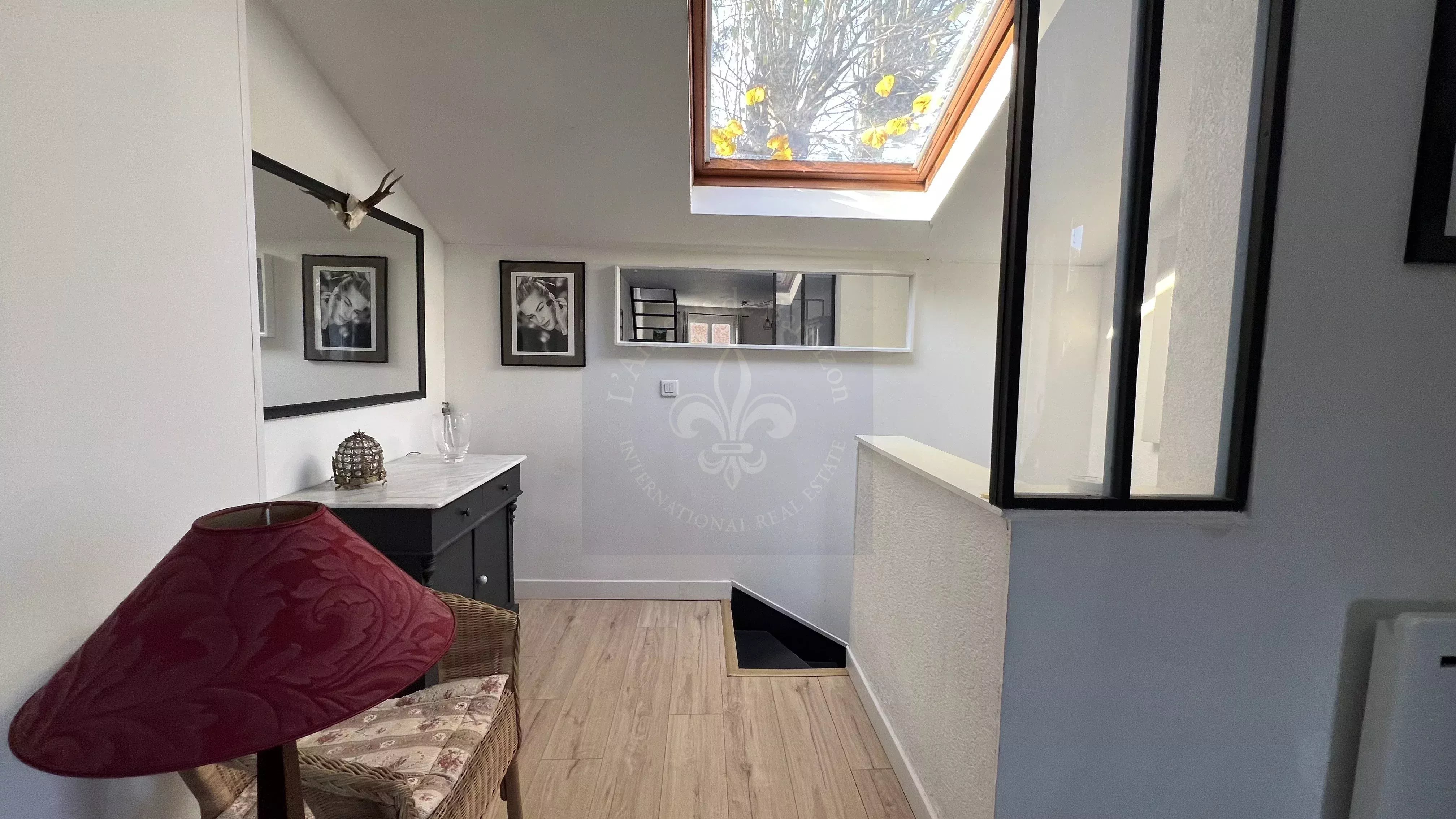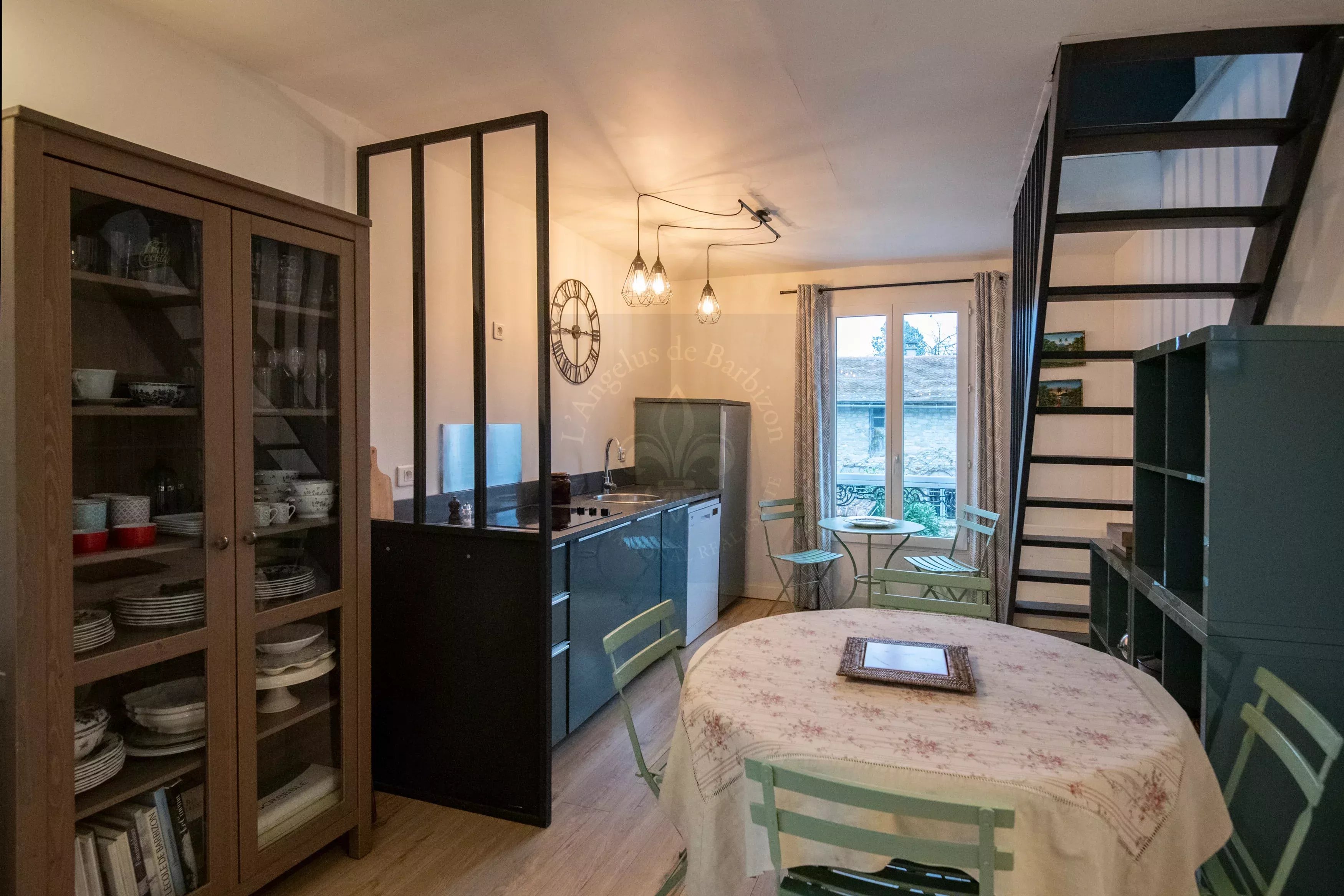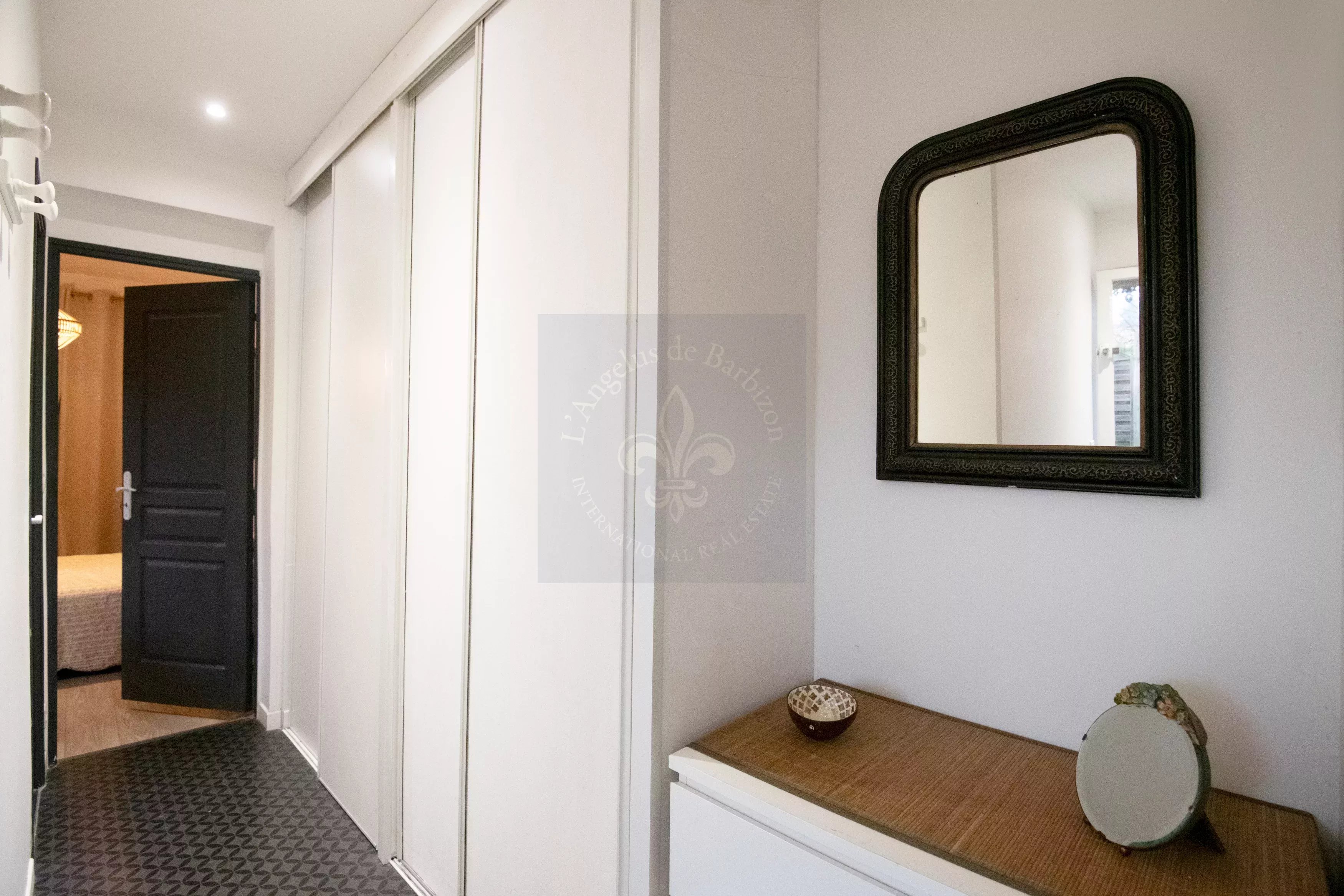Au coeur de Barbizon- Superbe maison en pierre du pays de 64 m2 habitables sur un terrain de 125 m2 clos de murs.Cette maison dispose d'une entrée, une chambre , une salle de bains, deux grandes penderies coulissantes, wc et coin buanderie.Etage: séjour avec un espace cuisine aménagée.2 ème étage: une belle mezzanine.Terrasse extérieure couverte et un espace couvert pour voiture.