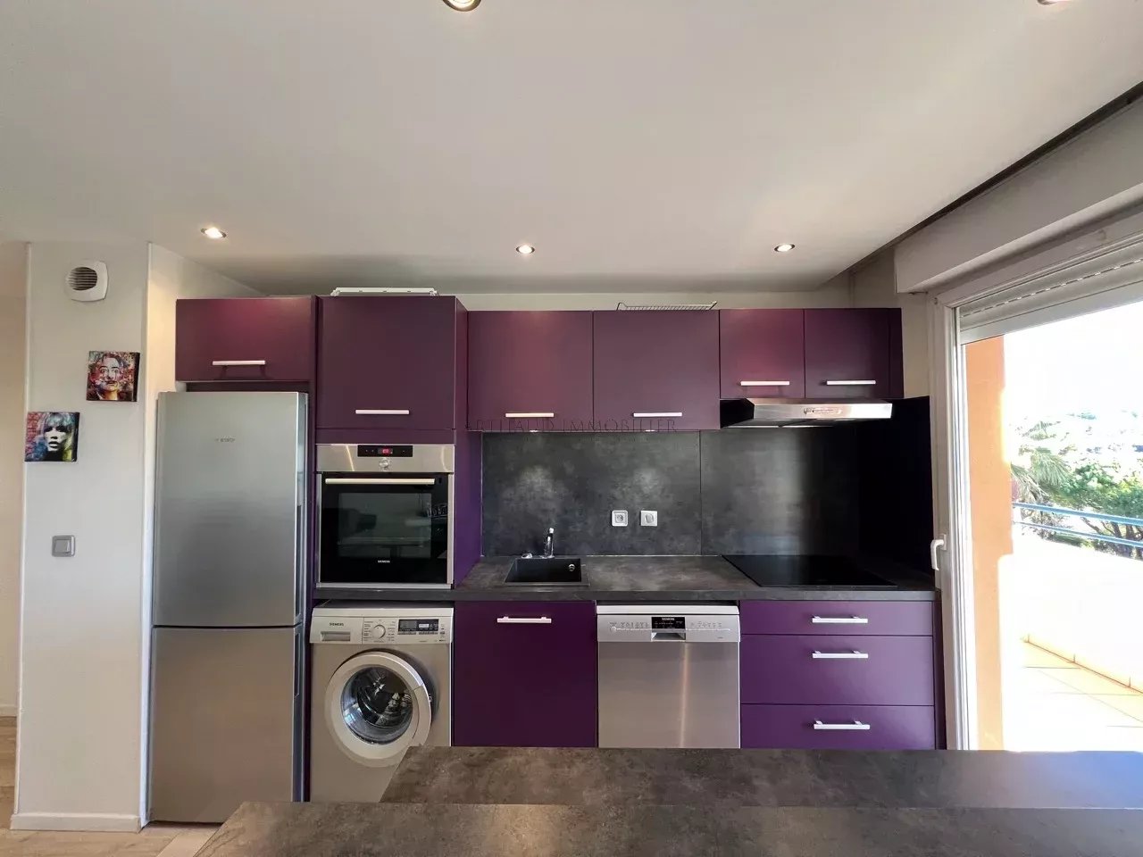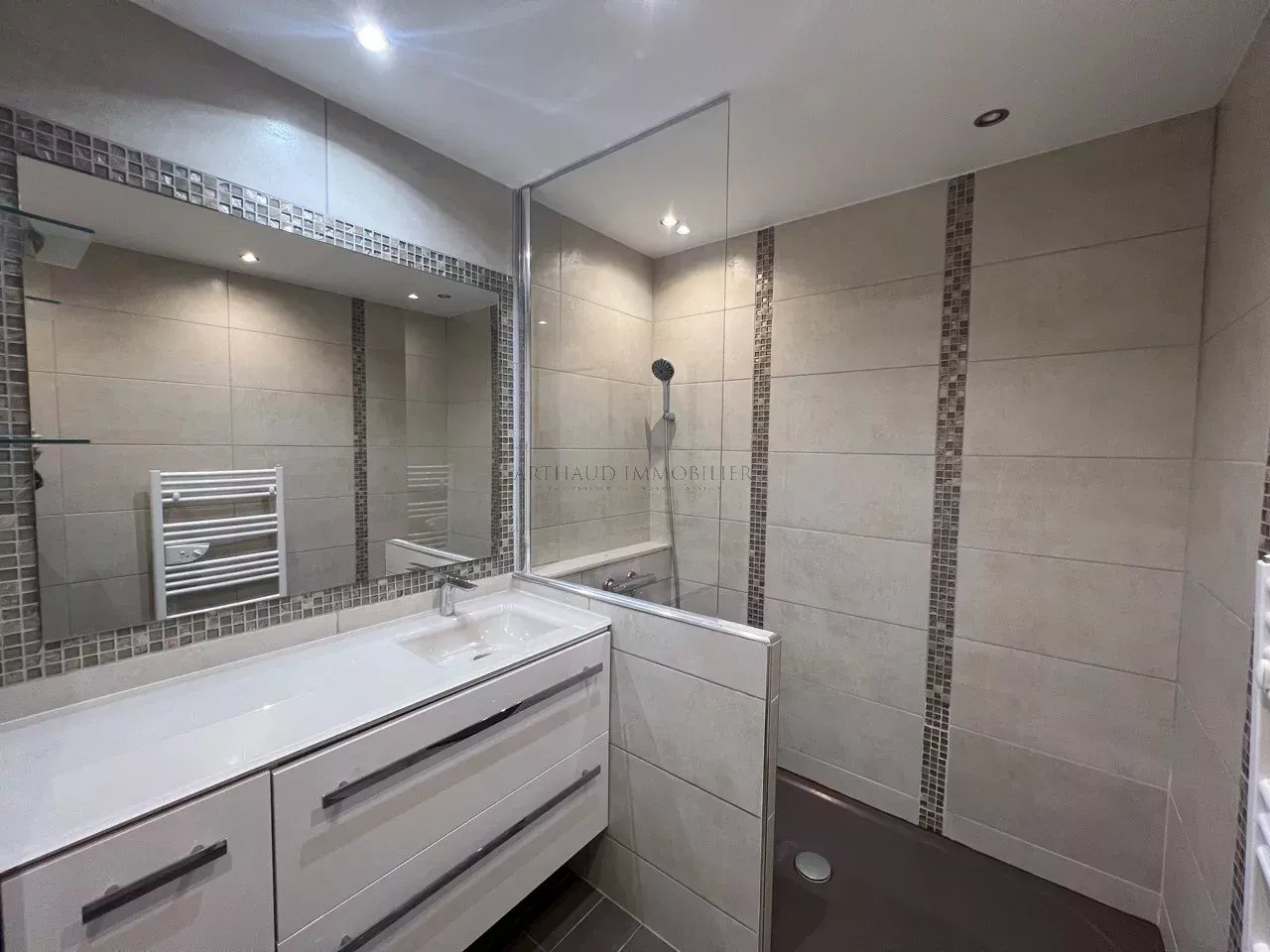 L’appartement se compose d’une entrée, d’un séjour donnant accès à une grande terrasse tournée, d’une cuisine équipée, de deux chambres avec rangements, d’une salle de bains et wc indépendants.