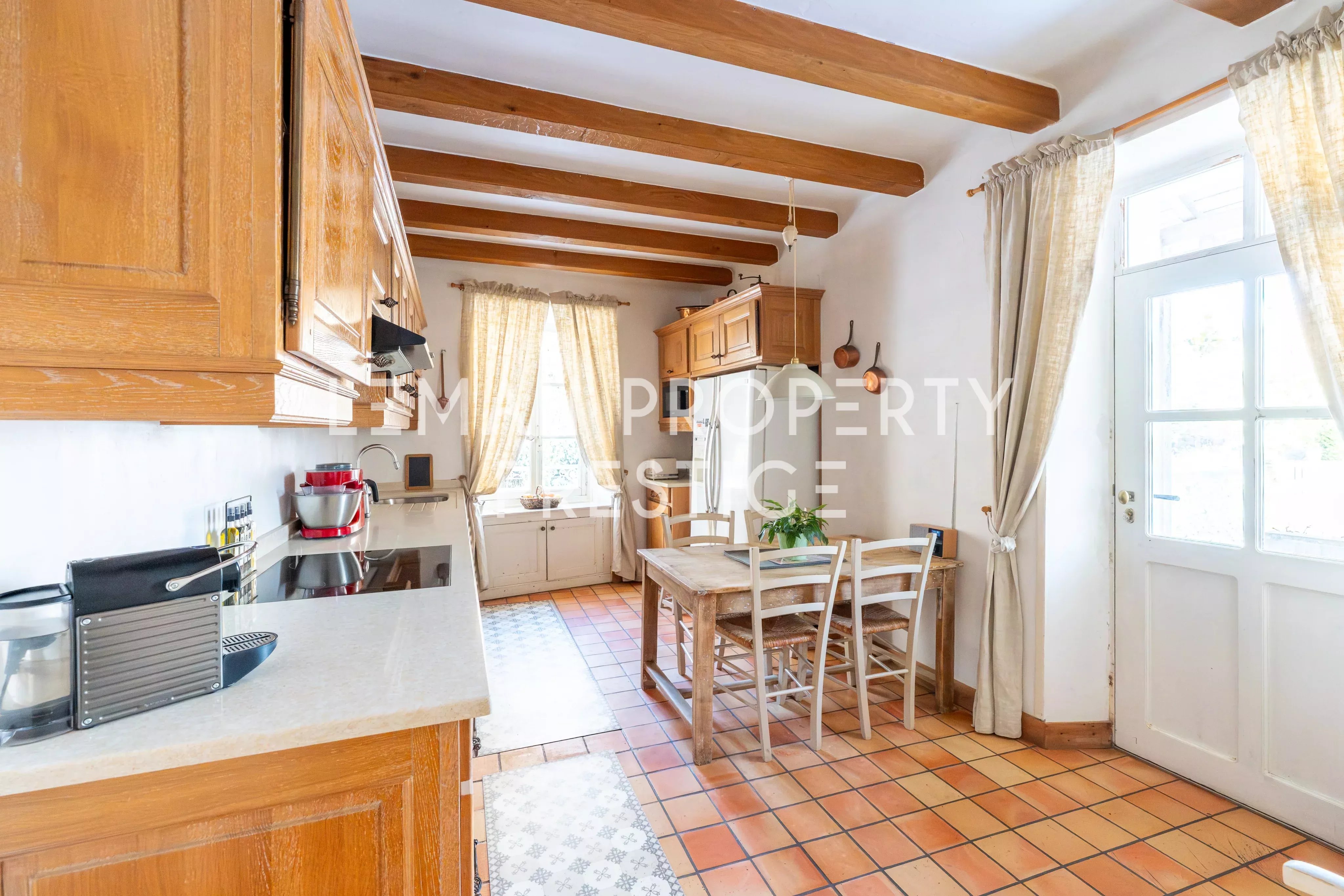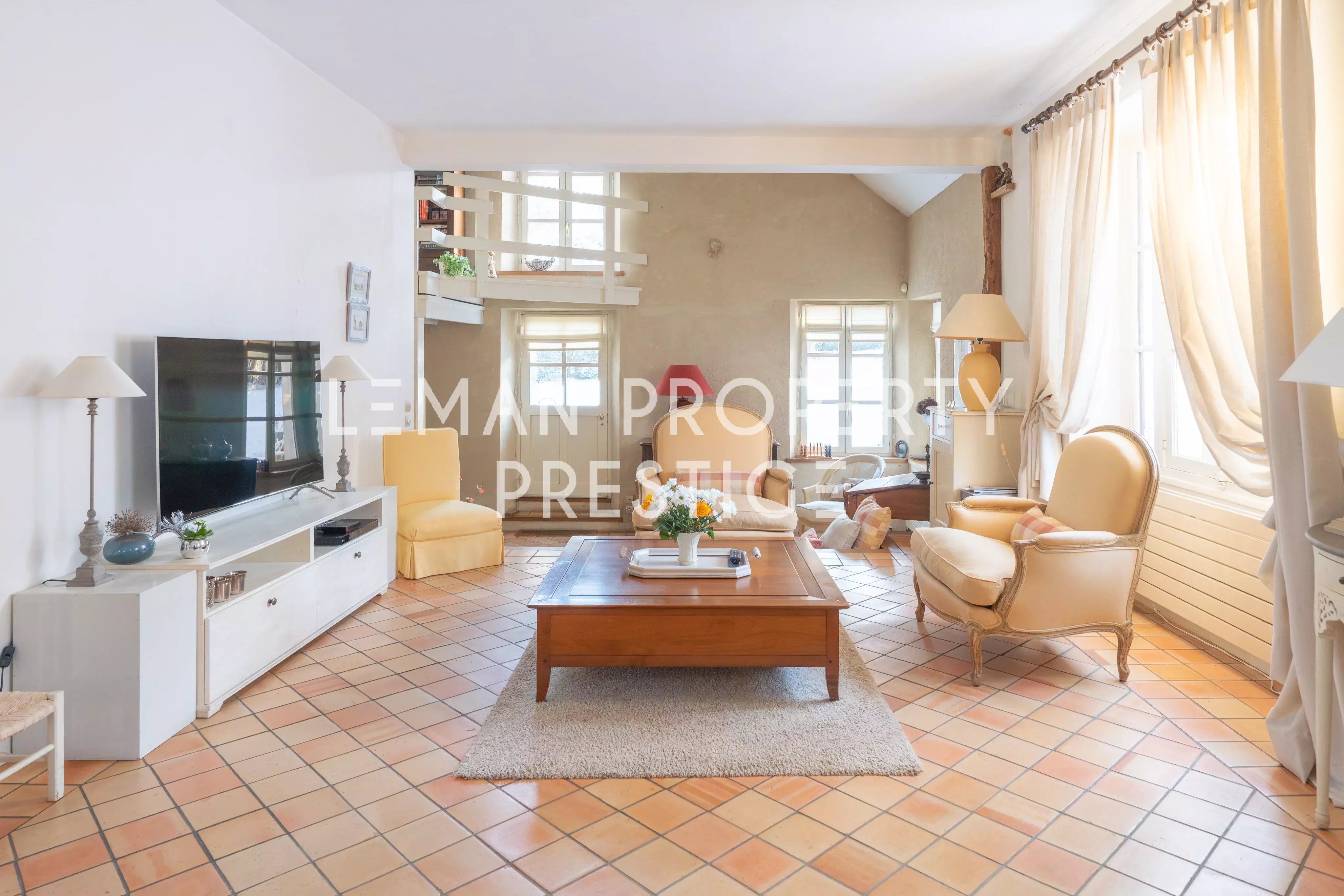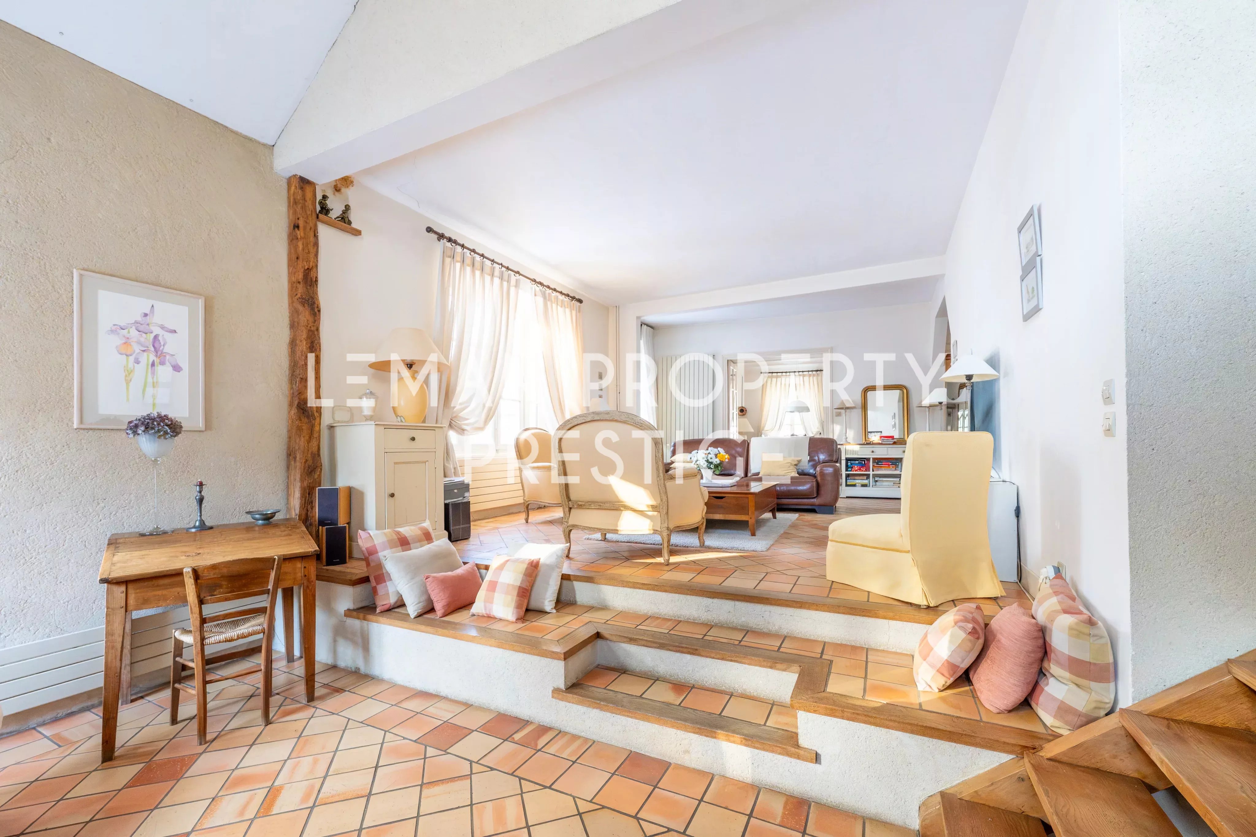 Le rez-de-chaussée se compose d’une entrée ouvrant sur les espaces de réception, comprenant un séjour et une salle à manger, une cuisine aménagée et équipée, un espace bureau, une chambre en mezzanine, un dressing ainsi que des toilettes indépendantes.