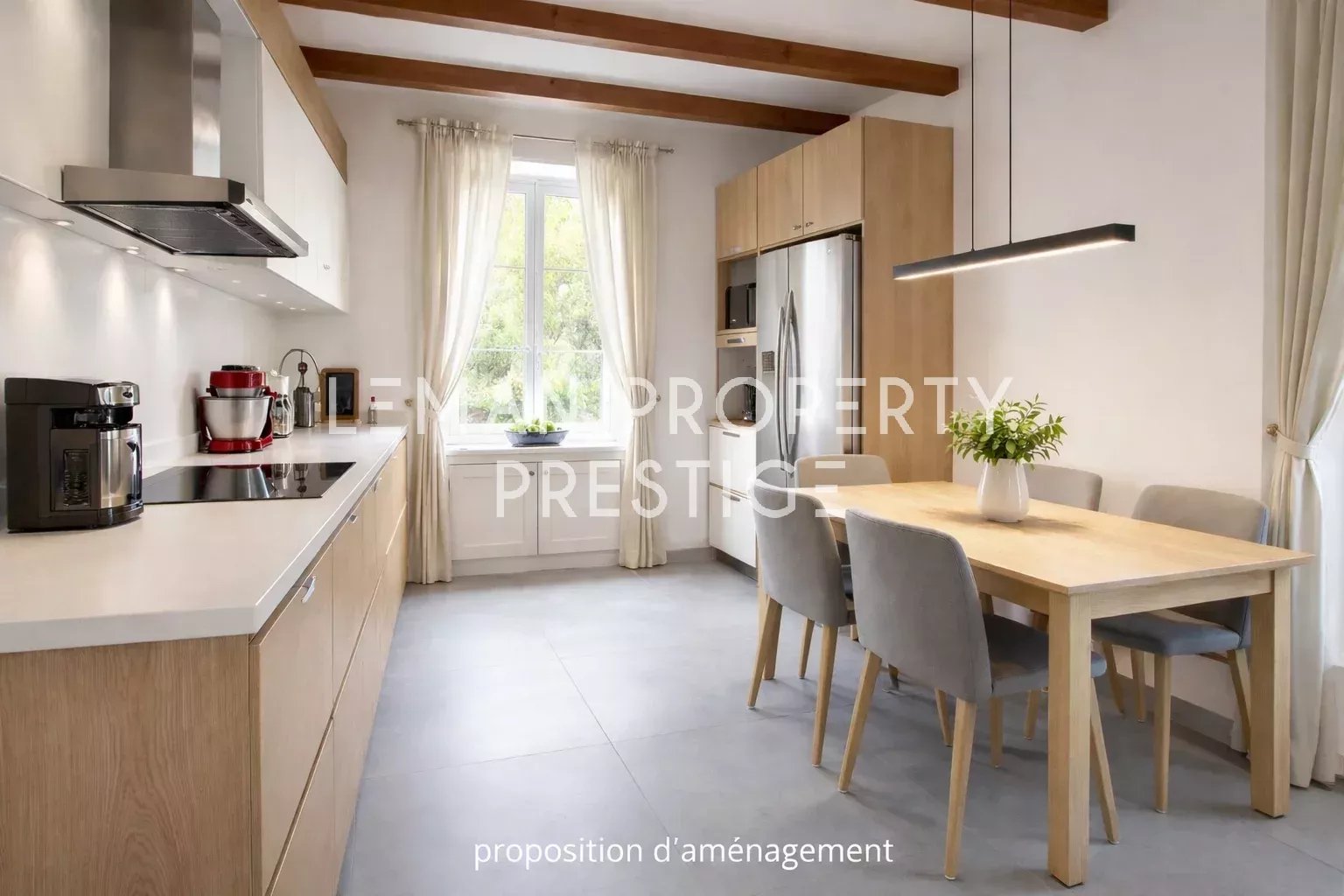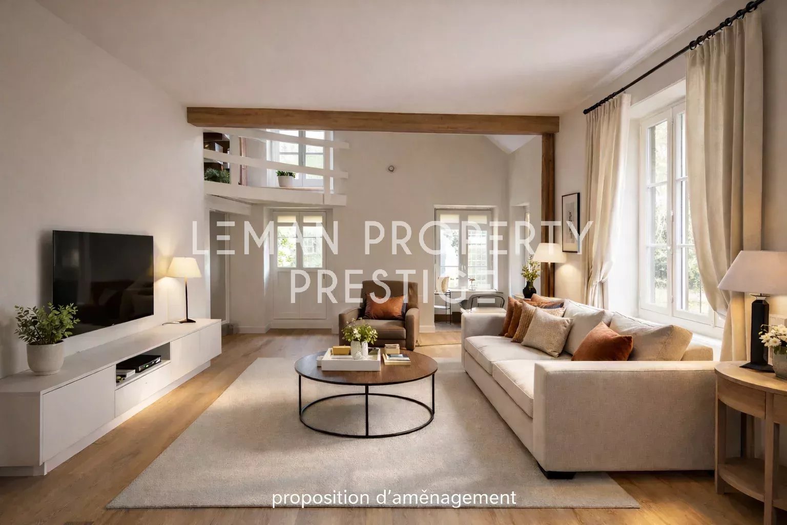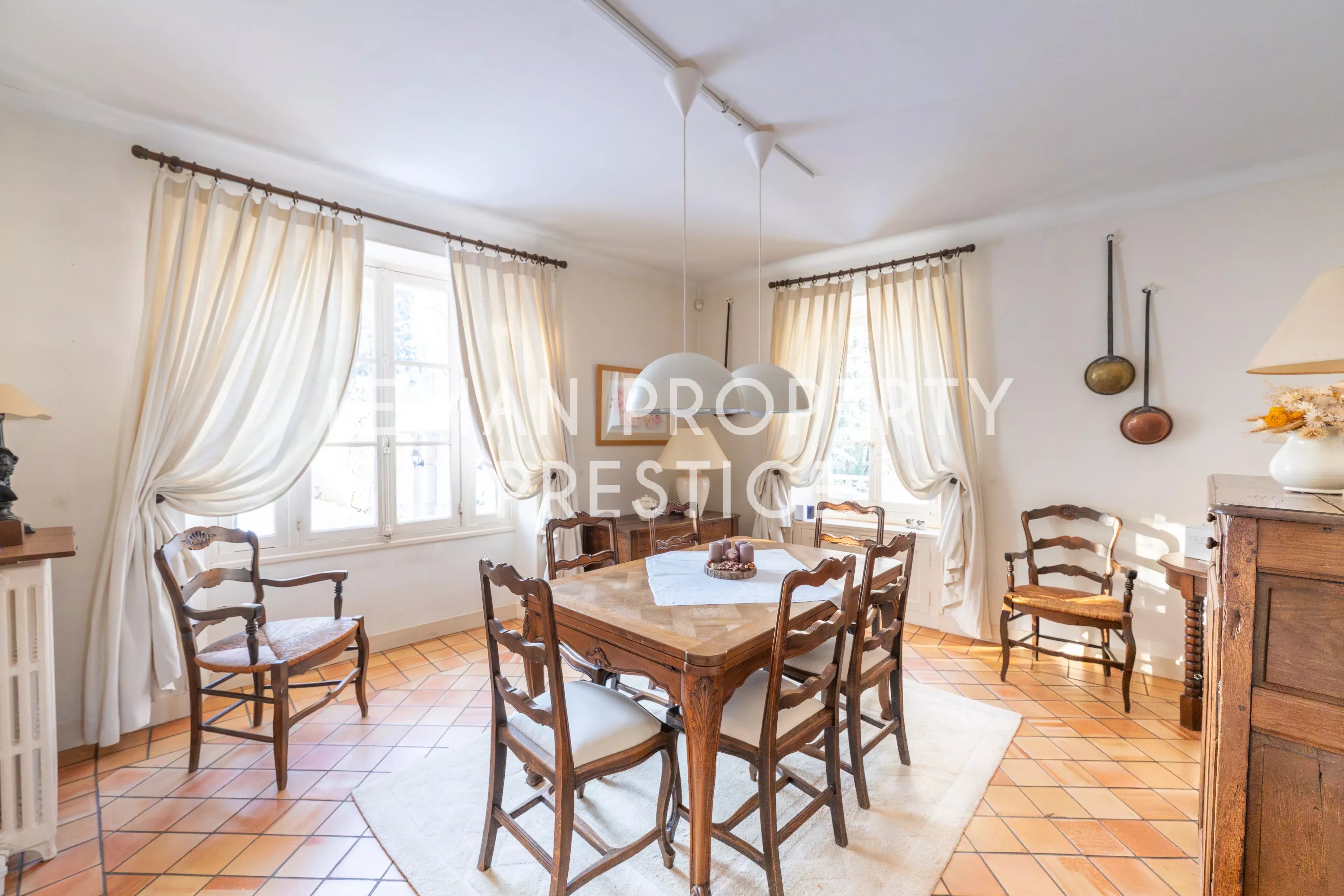 Le rez-de-chaussée se compose d’une entrée ouvrant sur les espaces de réception, comprenant un séjour et une salle à manger, une cuisine aménagée et équipée, un espace bureau, une chambre en mezzanine, un dressing ainsi que des toilettes indépendantes.