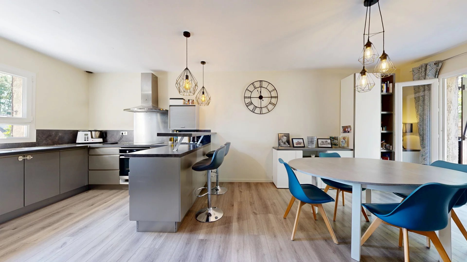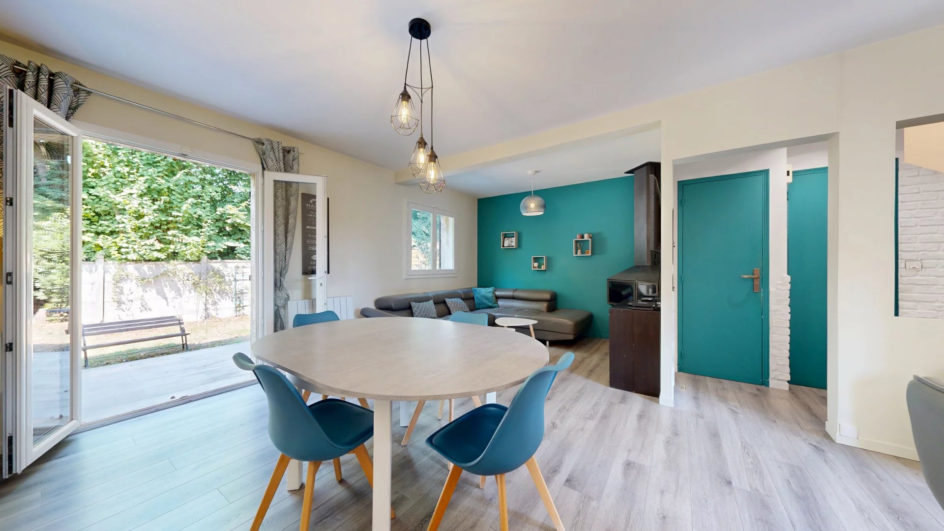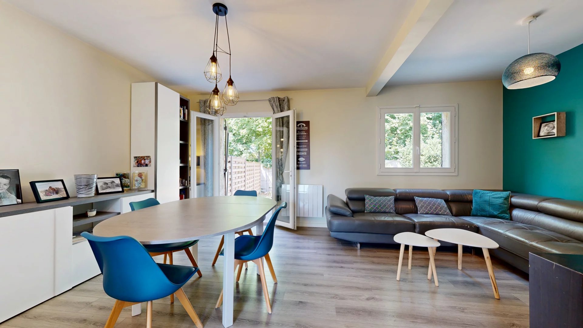 Au rez-de-chaussée, une entrée mène à un séjour traversant de 32 m² avec cheminée, ouvert sur une cuisine équipée. L’ensemble, lumineux et moderne, donne accès à un jardin intimiste avec terrasse. L’extension a permis d’ajouter un bureau ainsi qu’un WC indépendant.