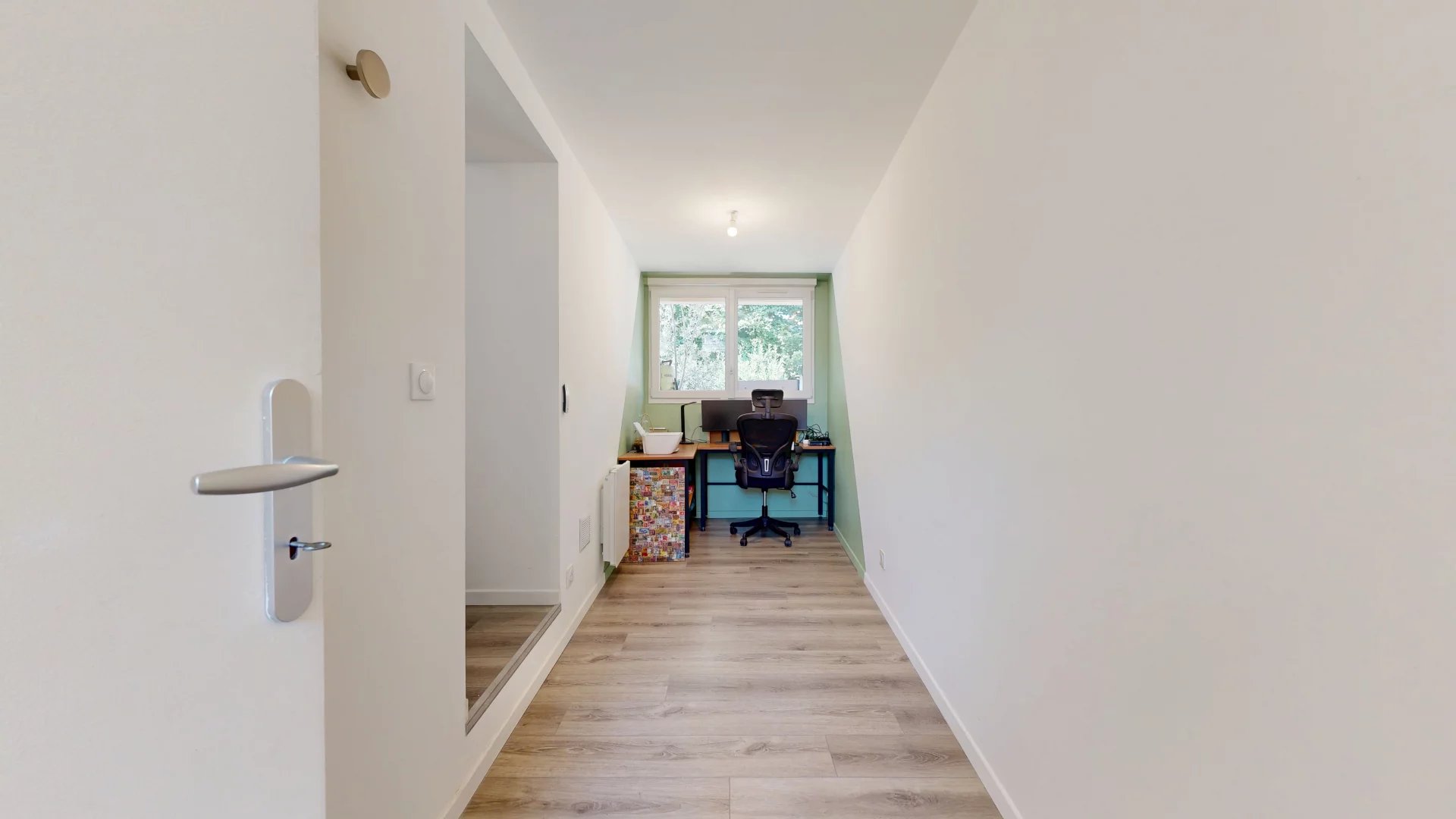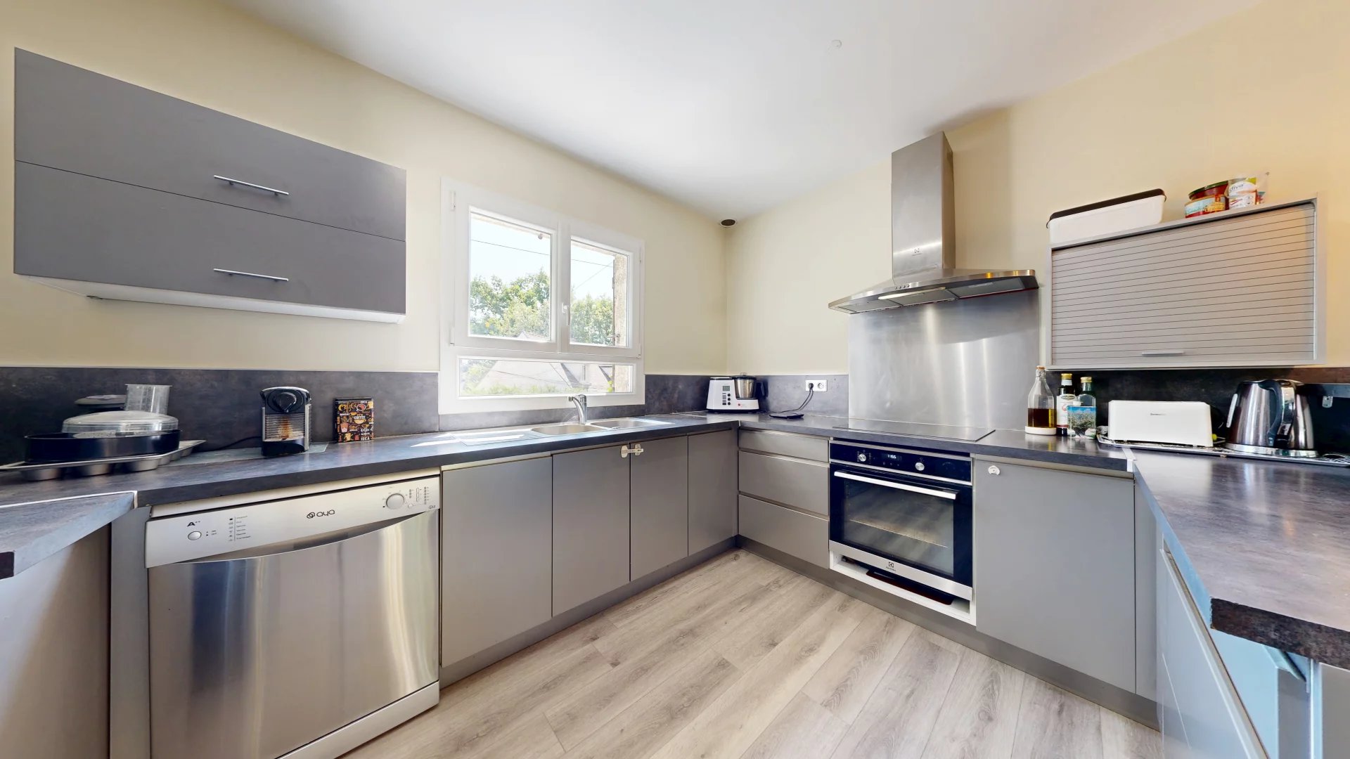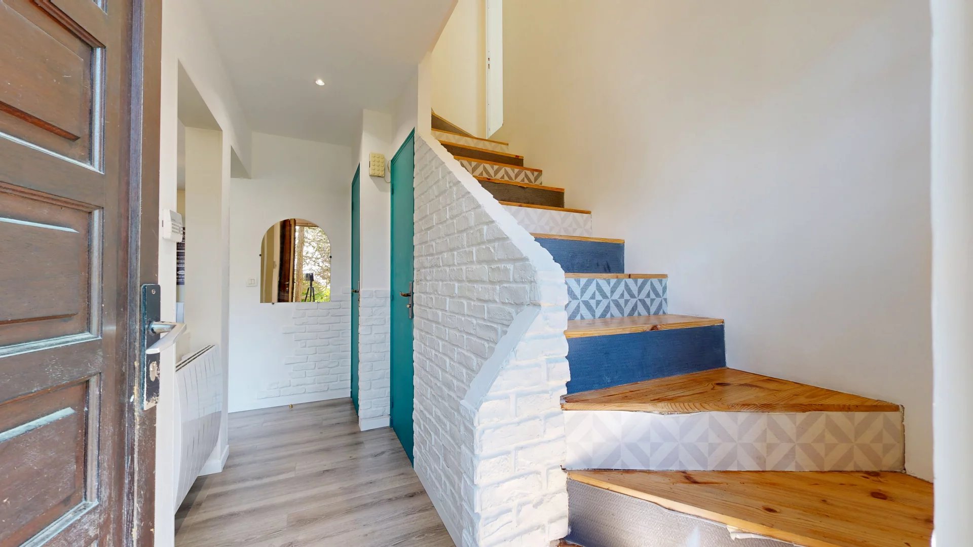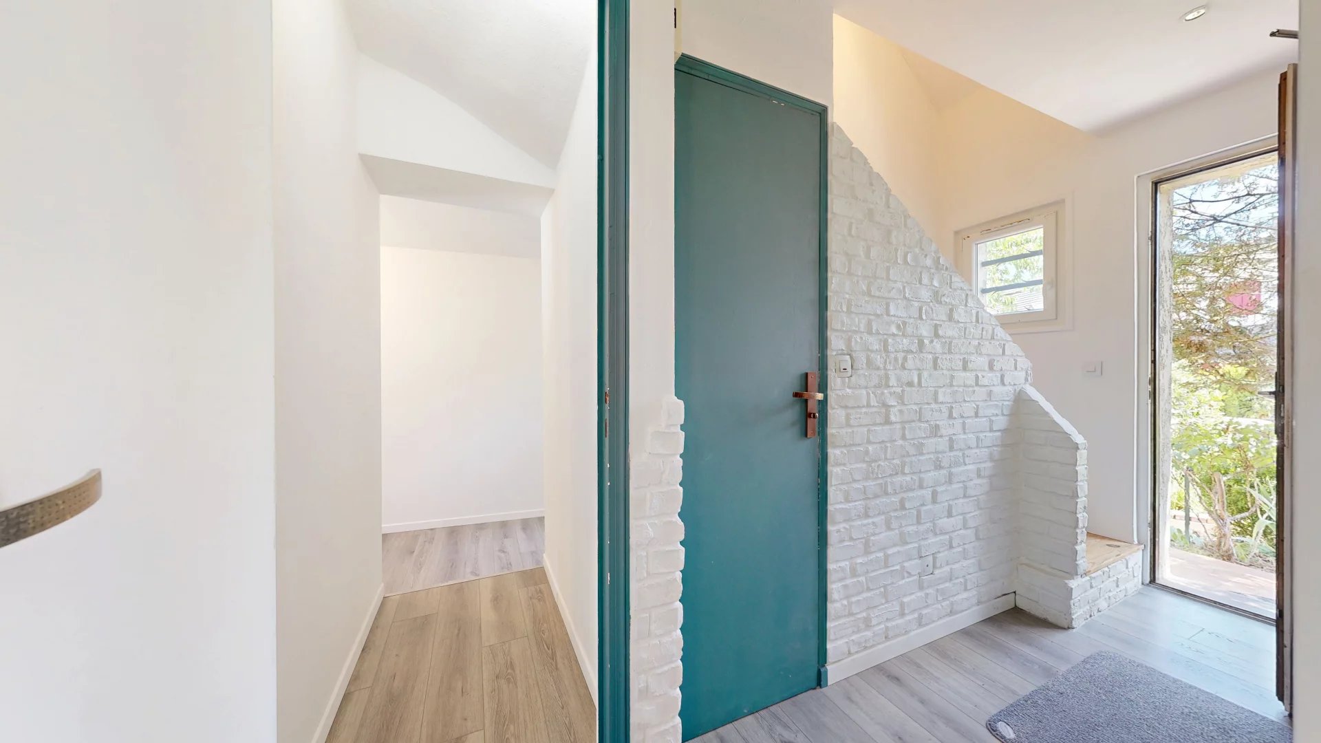 Au rez-de-chaussée, une entrée mène à un séjour traversant de 32 m² avec cheminée, ouvert sur une cuisine équipée. L’ensemble, lumineux et moderne, donne accès à un jardin intimiste avec terrasse. L’extension a permis d’ajouter un bureau ainsi qu’un WC indépendant.