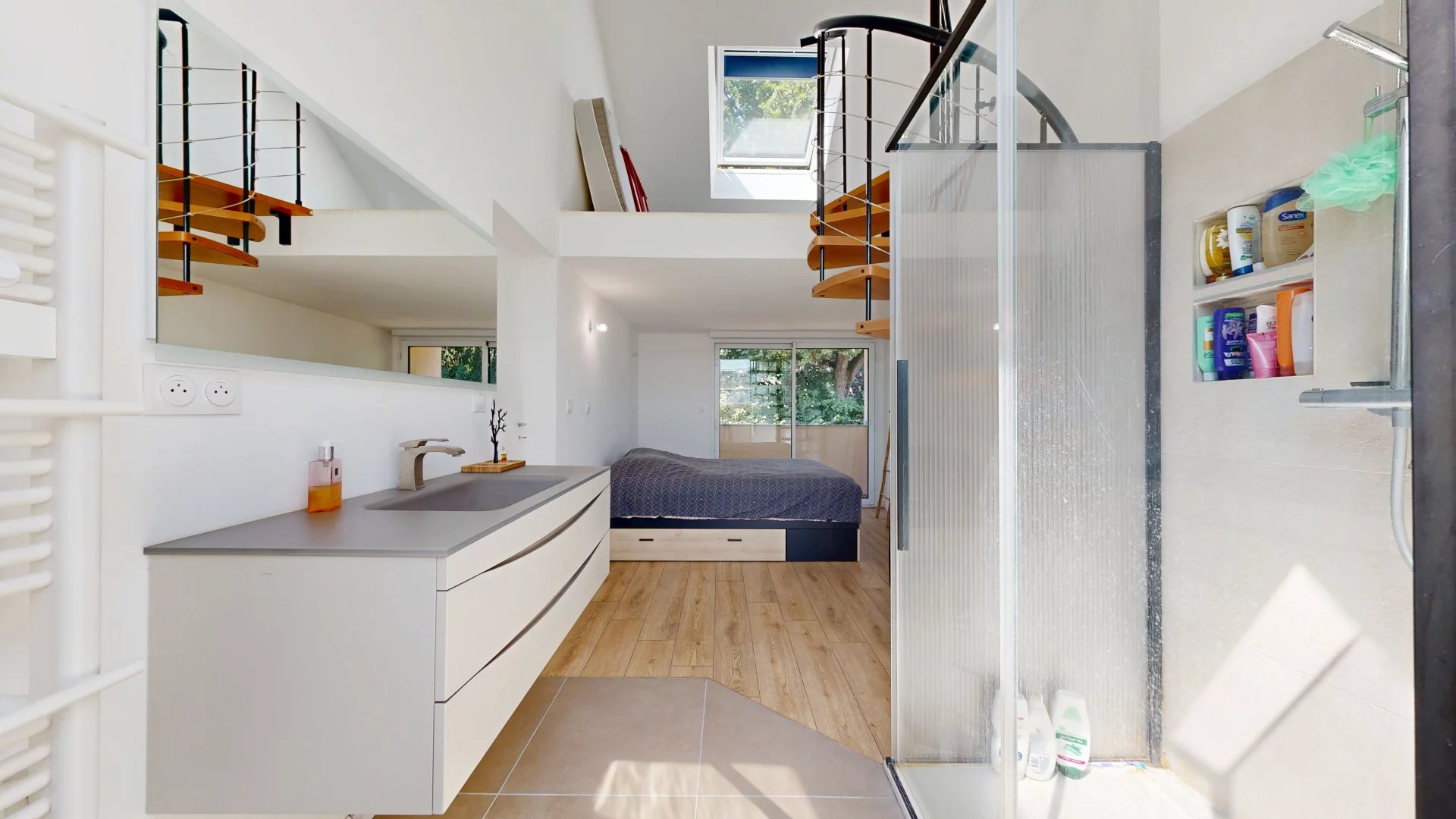 À l’étage, l’espace nuit comprend 4 chambres, dont une suite parentale de 17 m² avec salle d’eau, douche italienne et balcon. Une mezzanine et une seconde salle de bains complètent le niveau.