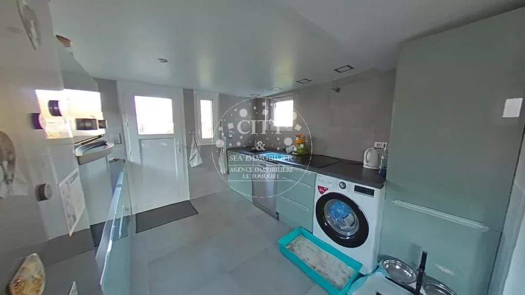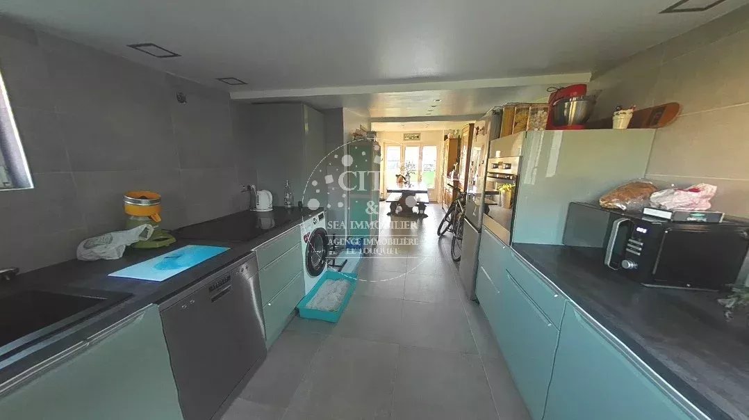 - Une cuisine aménagée et équipée avec accès à une terrasse et partie engazonnée, expo Ouest