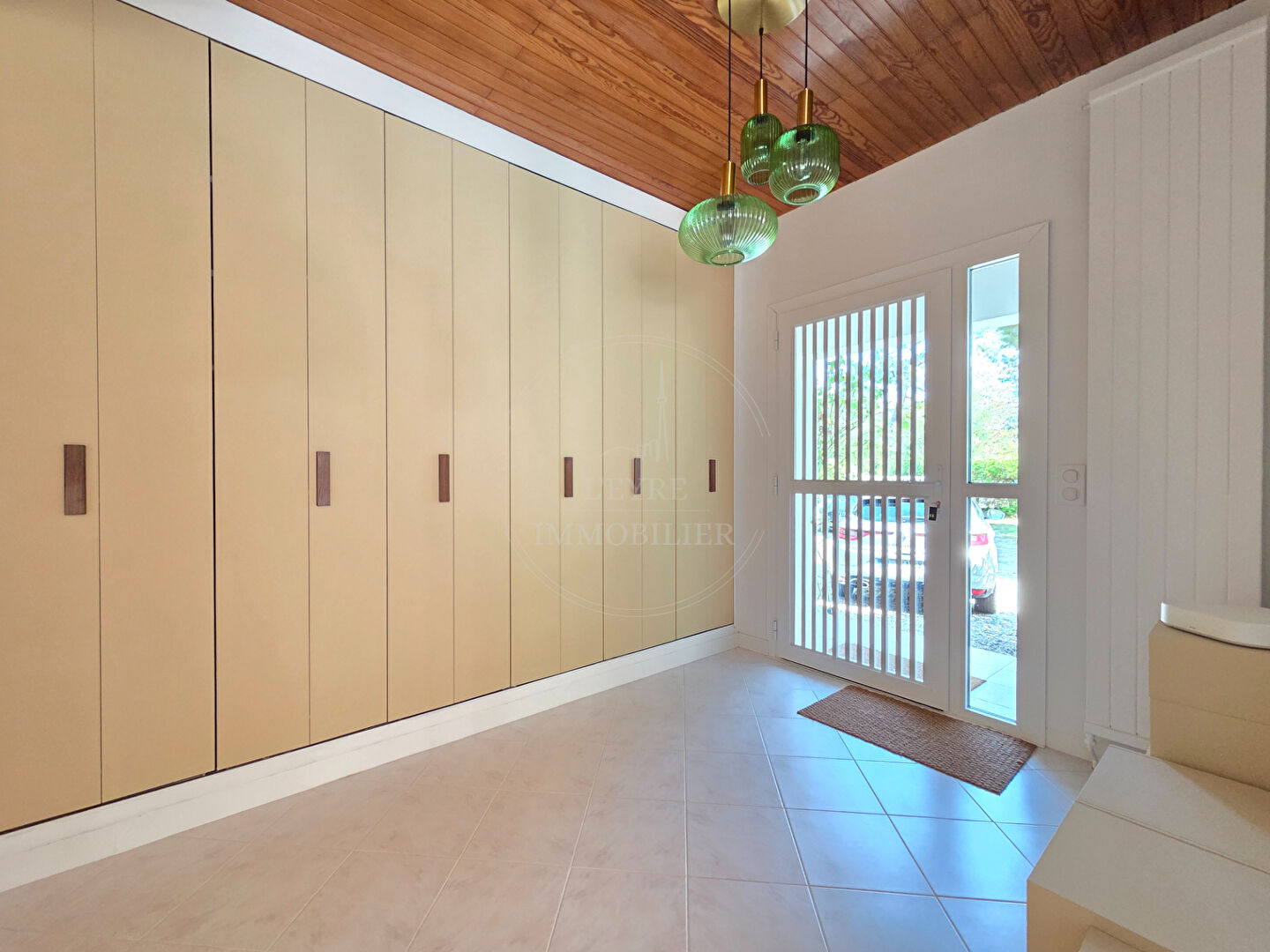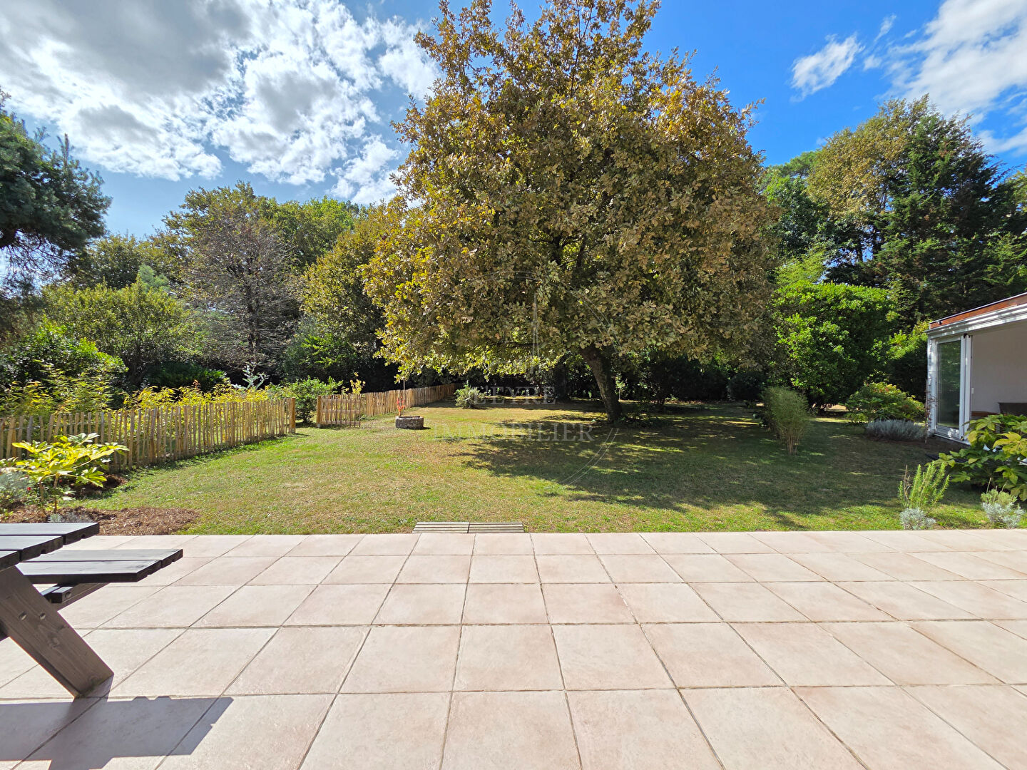 Maison d'architecte des années 70 de 156 m², située sur un grand terrain arboré de plus de 2700 m², dans un environnement recherché et verdoyant. Elle se compose d'une entrée spacieuse avec placard, d'un salon-séjour lumineux avec cheminée offrant une belle vue sur le jardin, d'une cuisine indépendante aménagée et équipée, ainsi que d'un cellier-buanderie. La partie nuit comprend trois chambres, un grand bureau pouvant servir de quatrième chambre, une salle d'eau, une salle de bain et deux WC. Une grande véranda permet de profiter du jardin en toute saison. Un double garage de 43 m², un abri de jardin de 28 m² et un cabanon de rangement complètent l'ensemble. Le jardin, arboré et sans vis-à-vis, offre un cadre paisible et agréable. (3.52 % honoraires TTC à la charge de l'acquéreur.)
