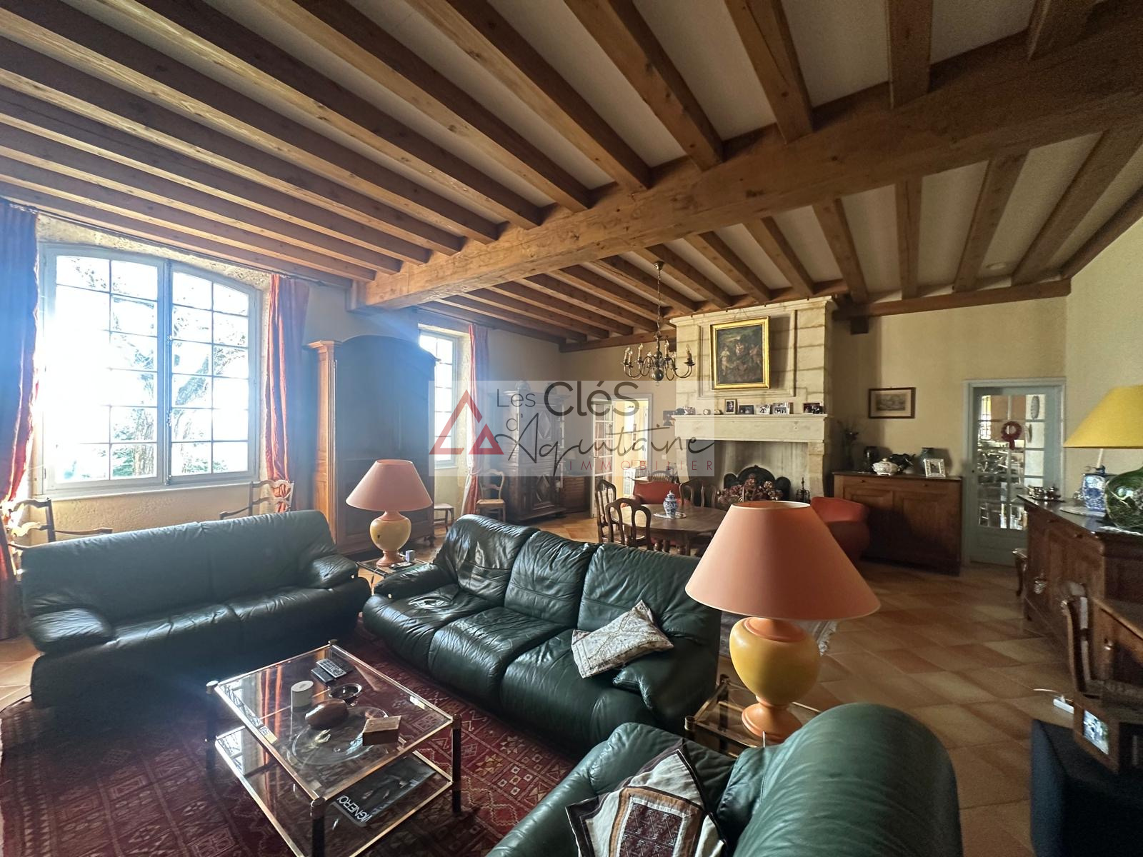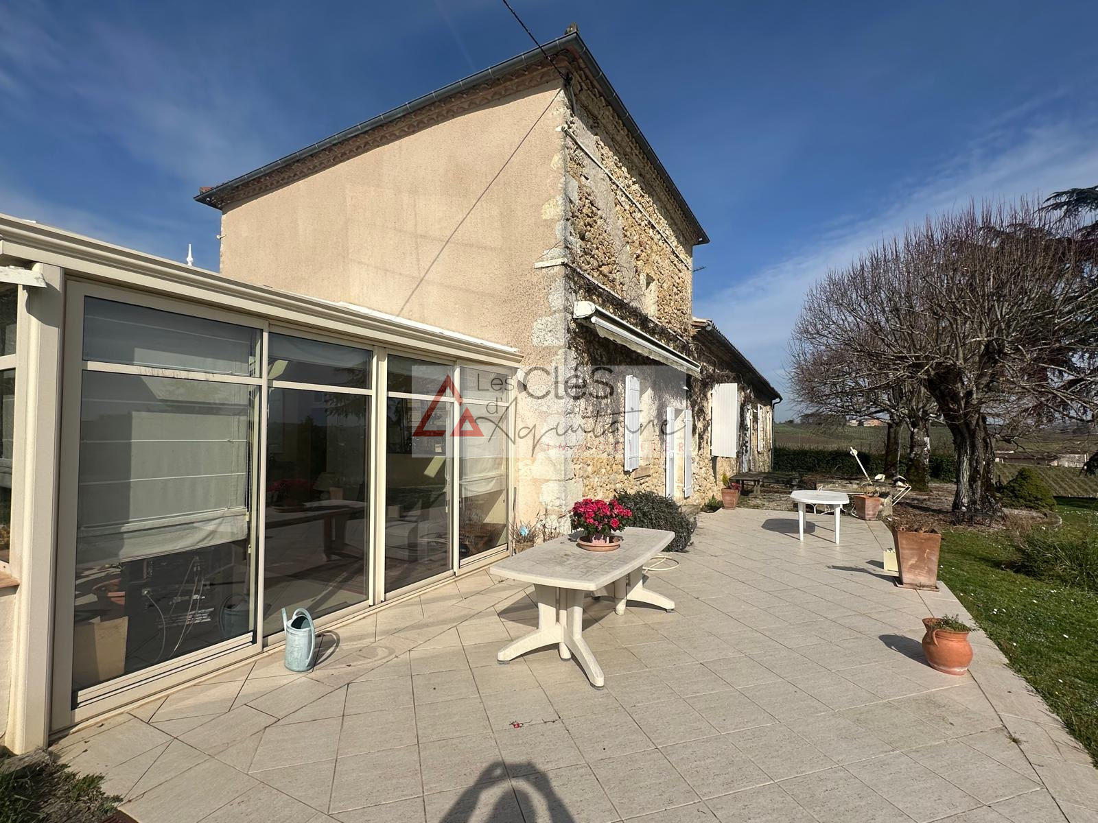 A l'éxterieur, une grande terrasse orientée plein sud permet de profiter pleinement d'une vue remarquable sur la vallée et les coteaux de l'entre deux mers, sans ancun vis-à-vis. Une vaste dépendance vient compléter l'ensemble.