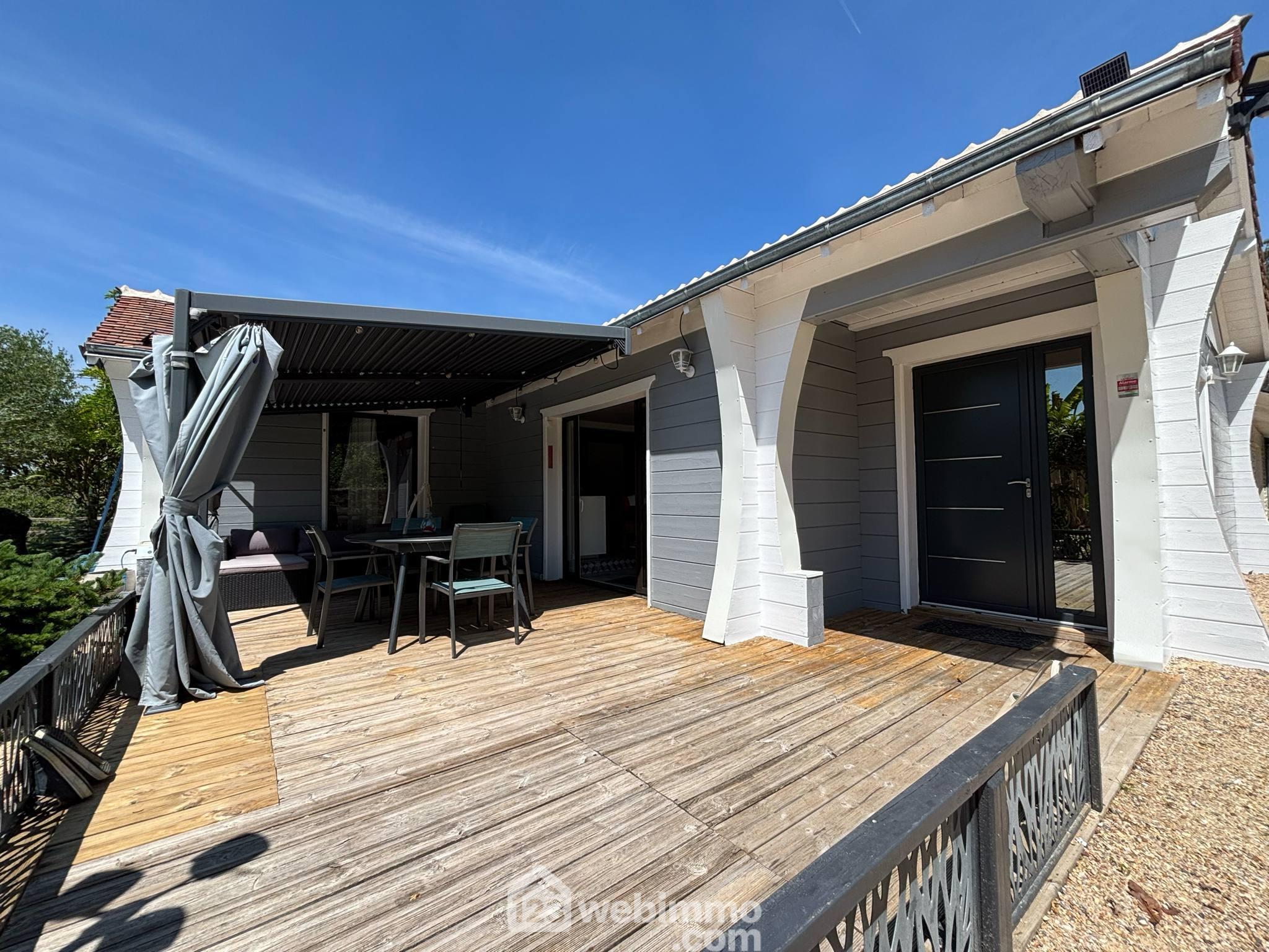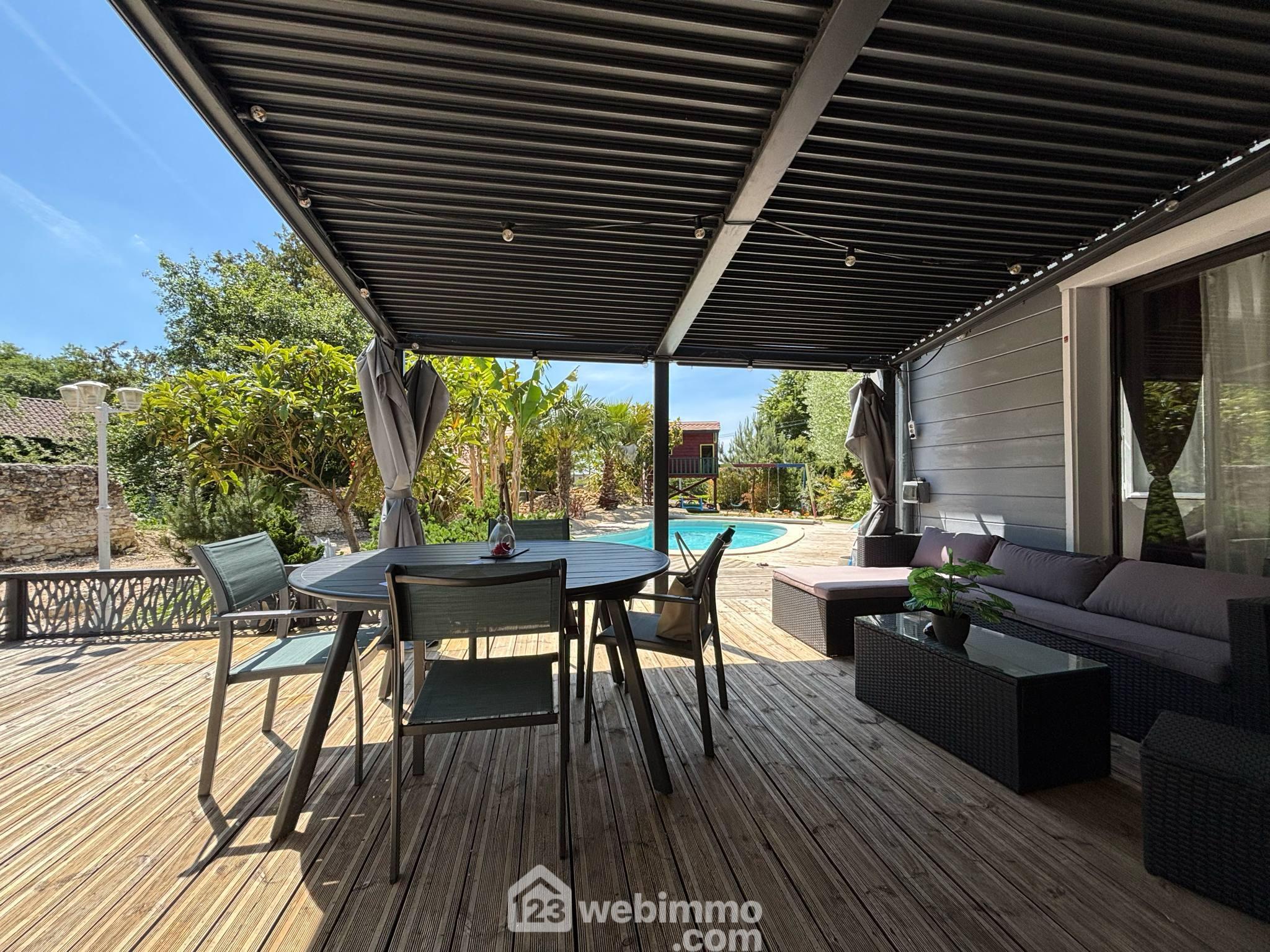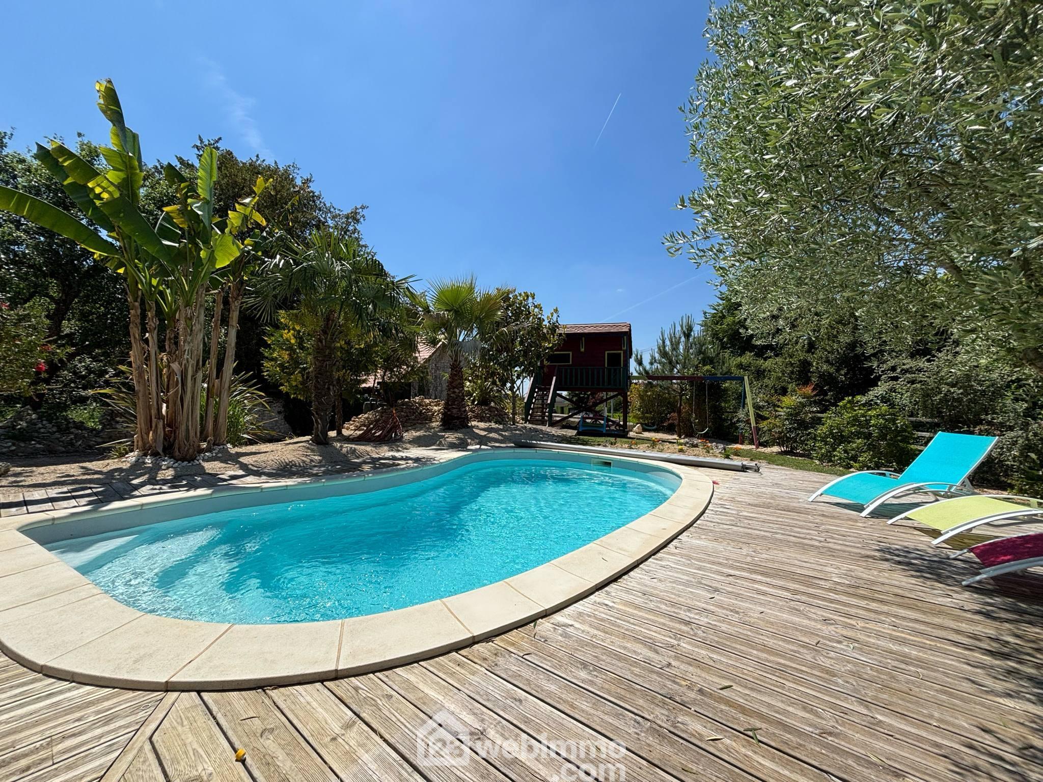 Votre agence 123webimmo l'immobilier au meilleur prix vous présente : Villa de plain-pied, 135 m² habitables, 5 pièces, 3 chambres (4 possibles), piscine, sur terrain de 1402 m² sans vis-à-vis.
