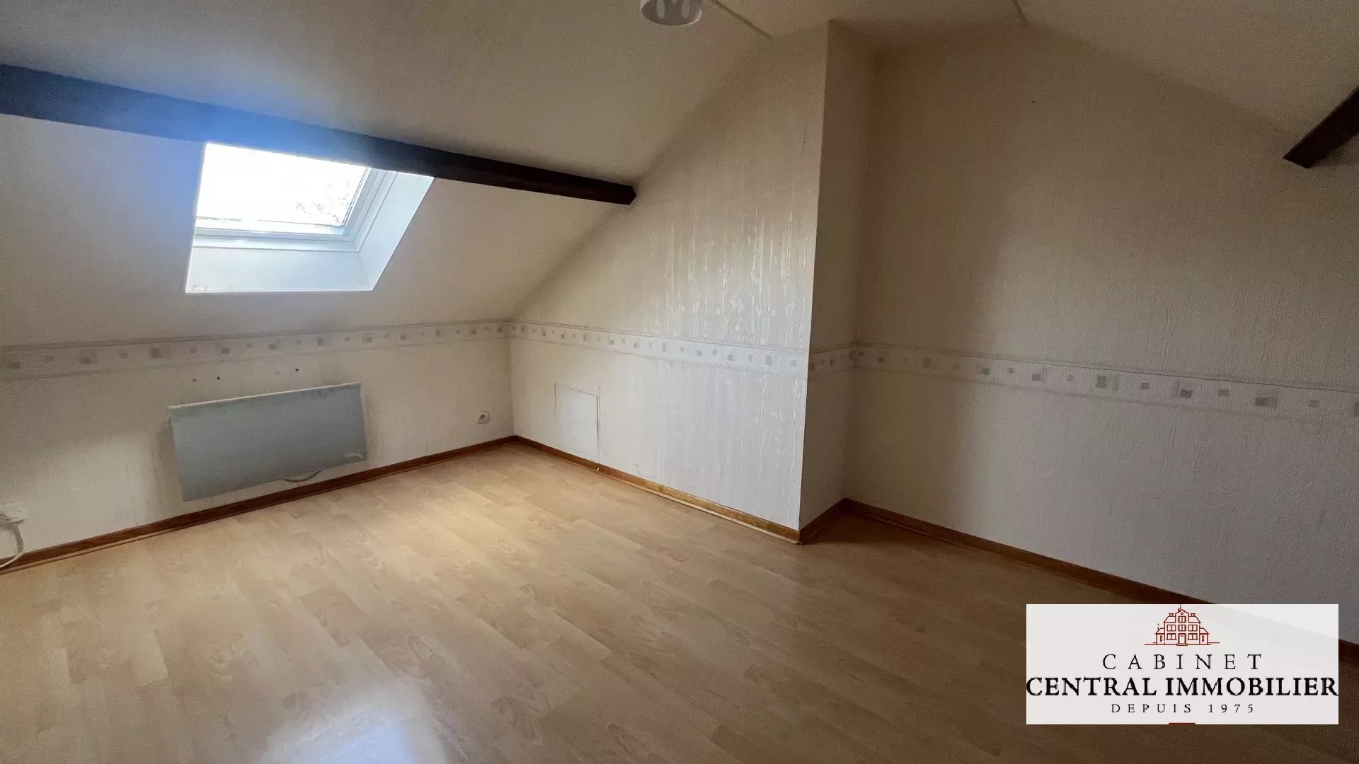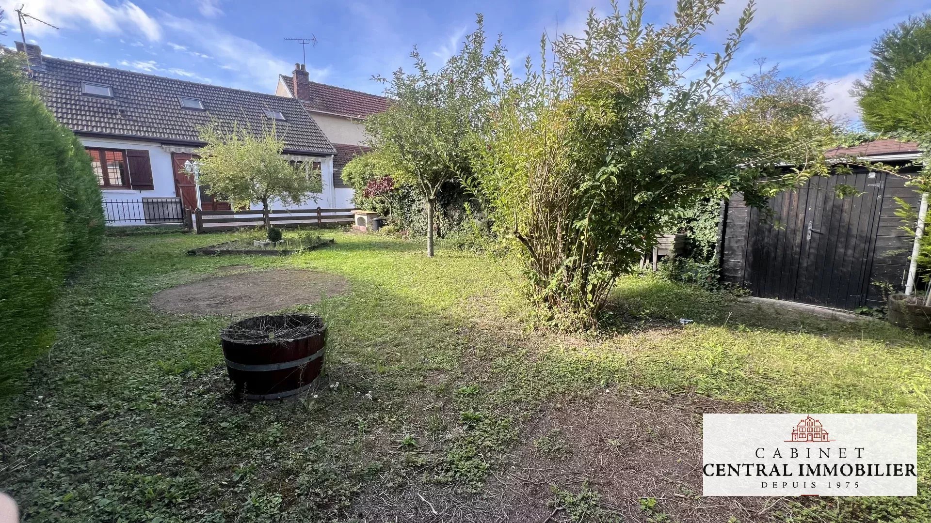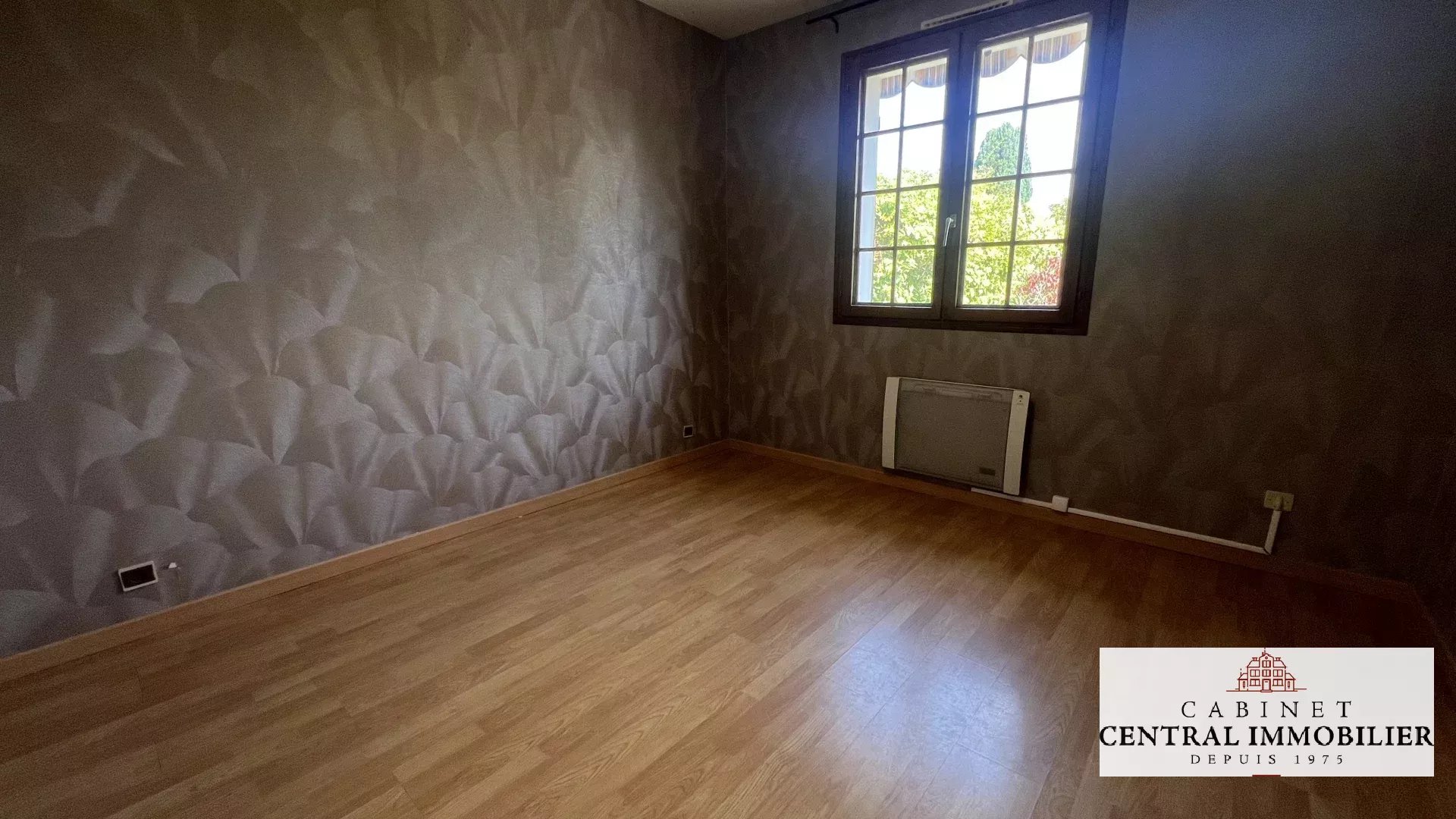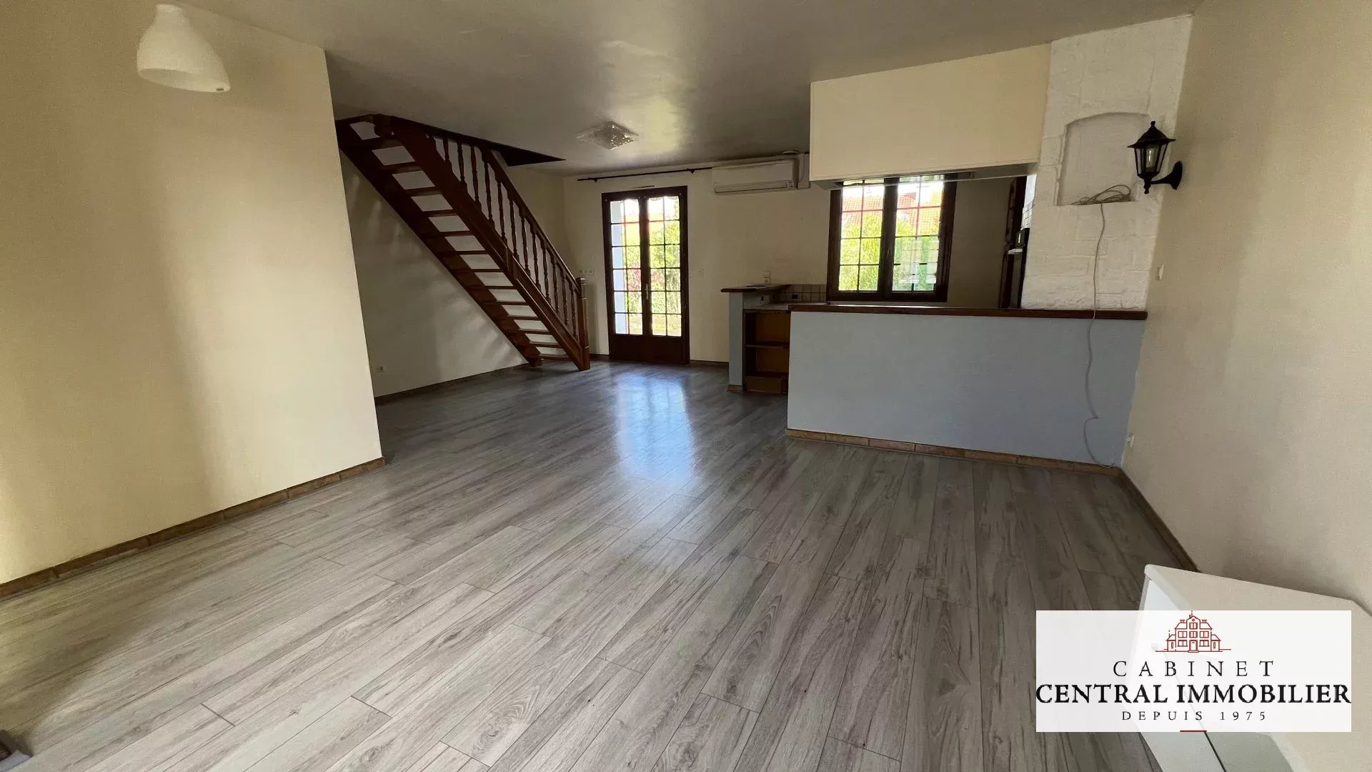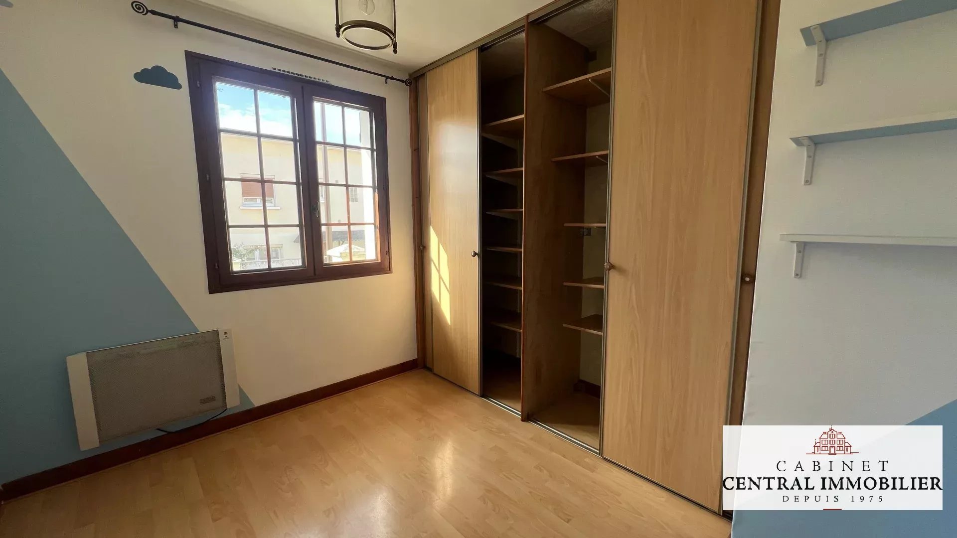 A louer 825€/mois C.C. Maison comprenant une entrée sur séjour carrelé de 29.80 m² ouvert sur une cuisine aménagée et équipée de 7.95 m², un bureau parqueté de 8.75 m² (possibilité de chambre), une chambre parquetée de 10.35 m², une salle d'eau carrelée de 4.51 m², WC; A l’étage : palier desservant 2 chambres de 10 et 12 m² au sol. Sous-sol total avec coin buanderie, cave et garage avec porte motorisée. Double vitrage avec volets bois. Chauffage électrique avec climatisation réversible dans la pièce de vie. Terrasse carrelée. Cabanon de jardin. Jardin clos de 318 m².